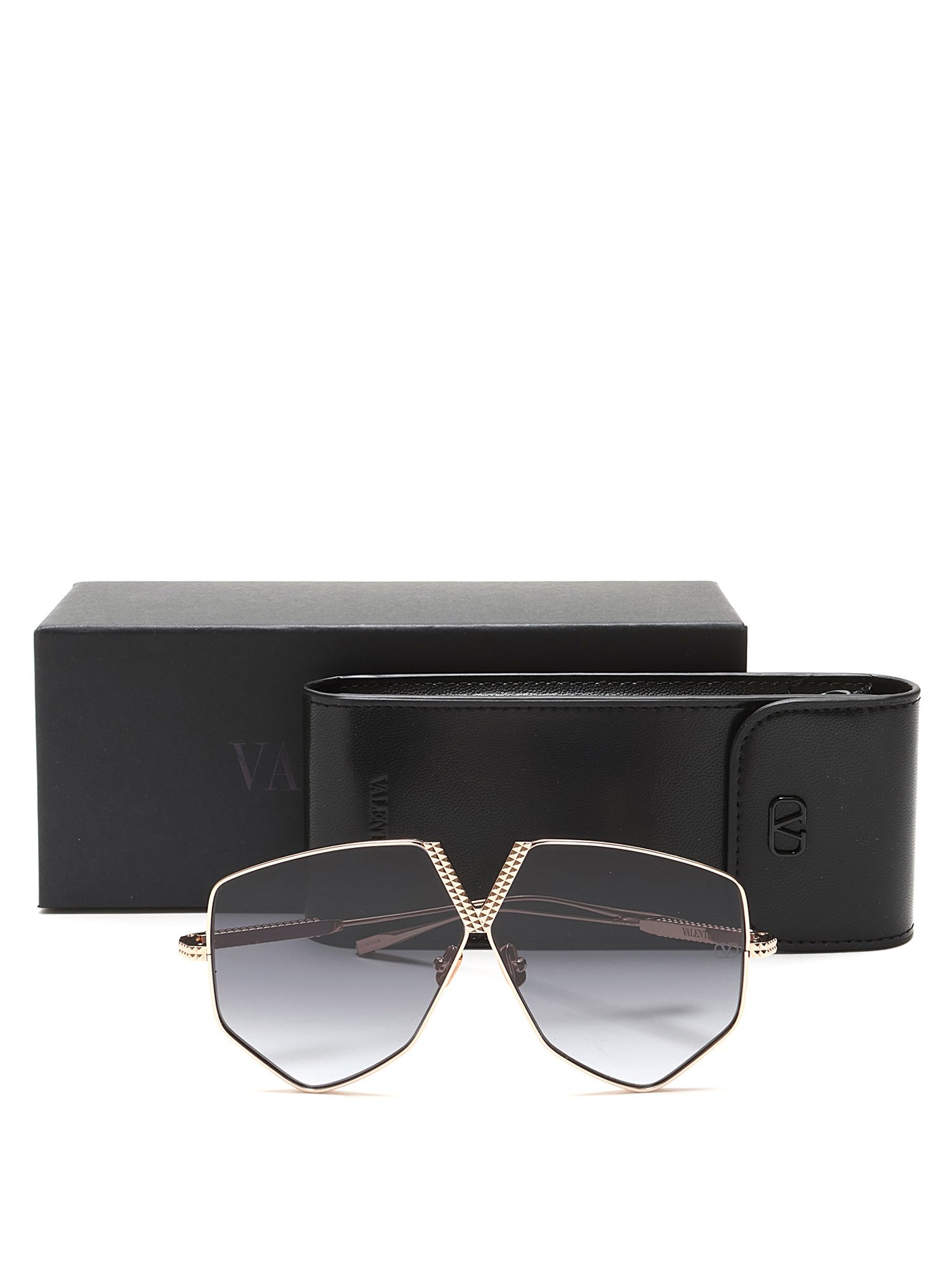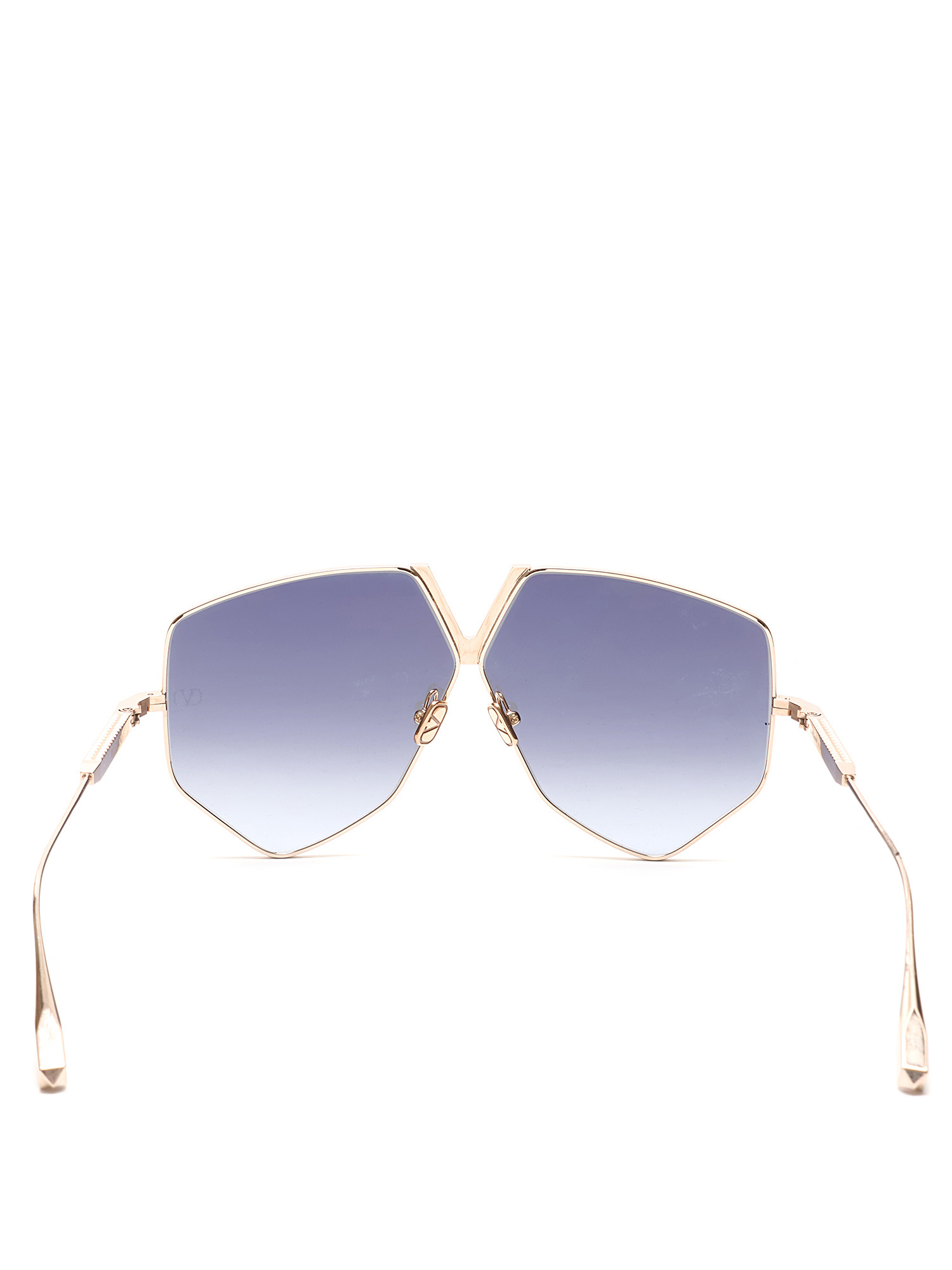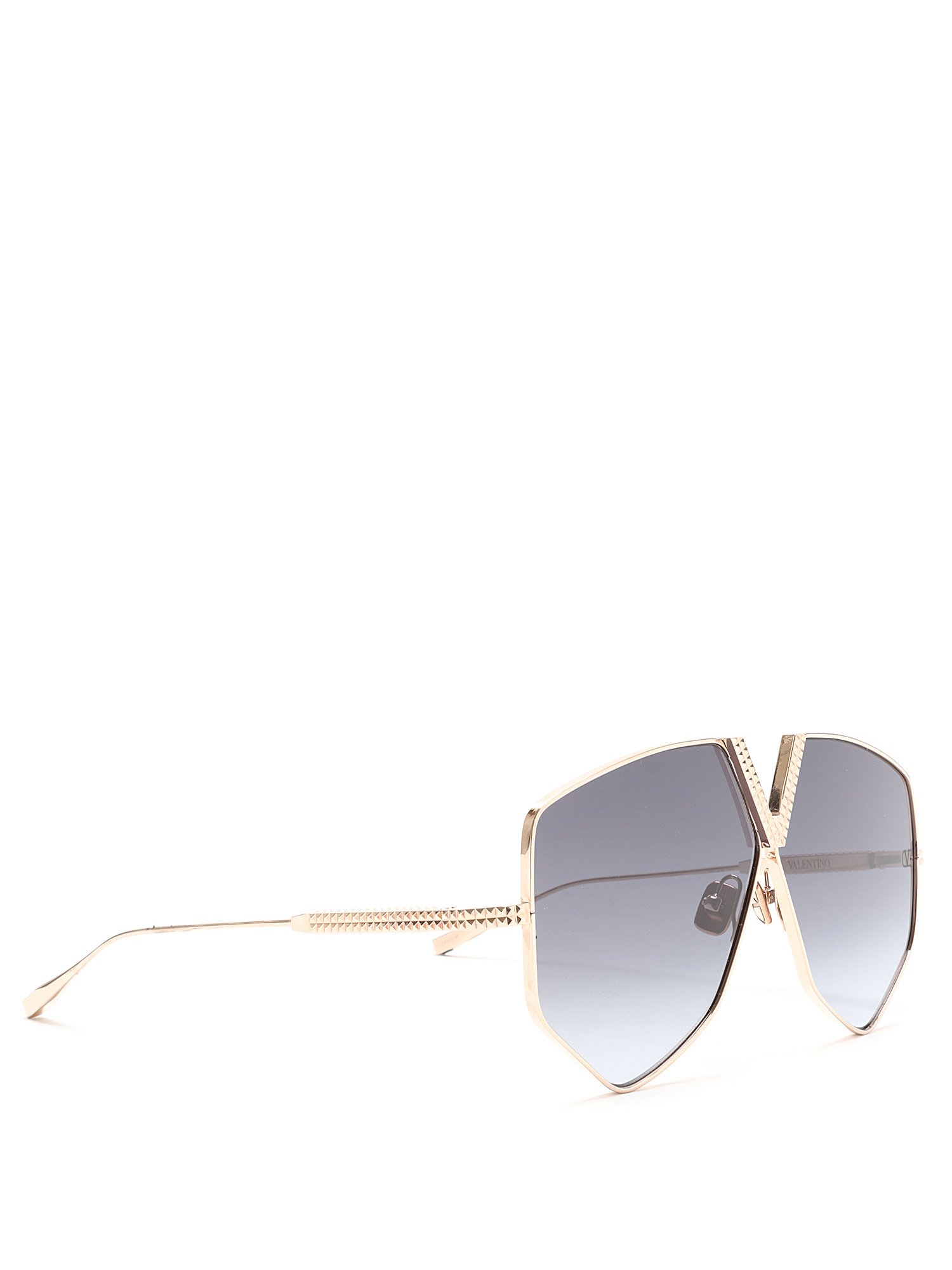 Lunettes de soleil surdimensionnées en métal doré avec détail de logo au devant. Verres gris. Quincaillerie dorée. Avec boîte.