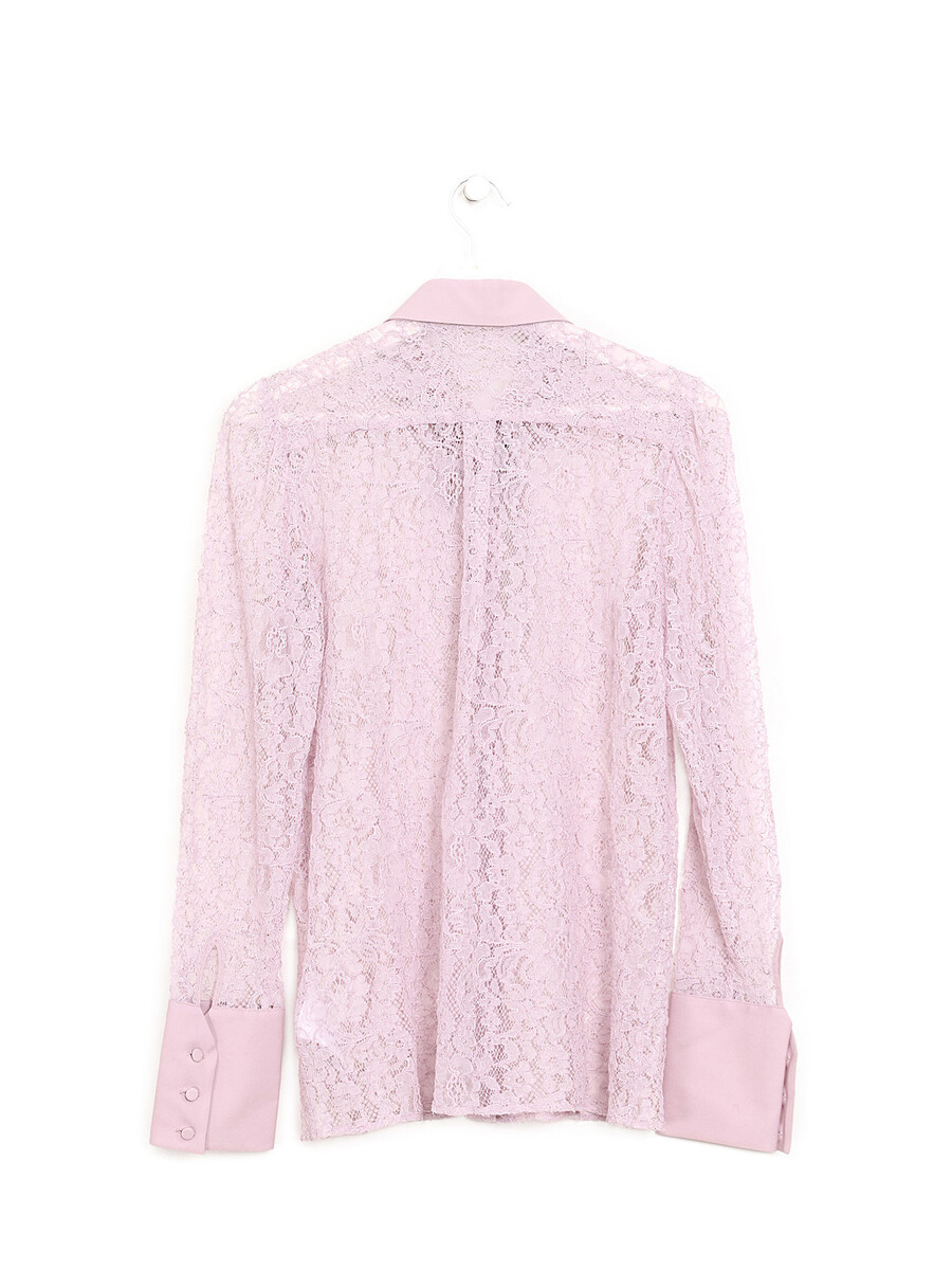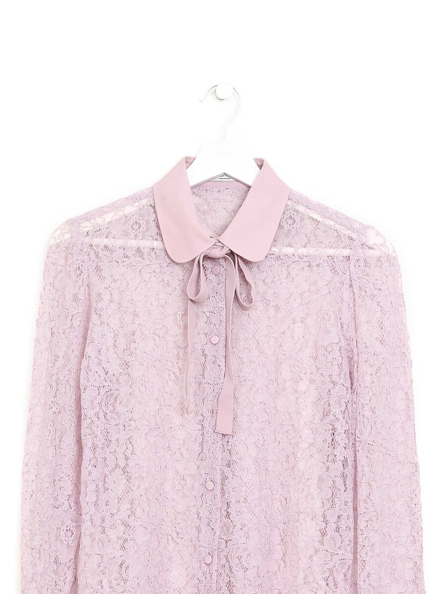 Blouse à manches longues en dentelle rose. Col chemise avec bande à nouer au cou.