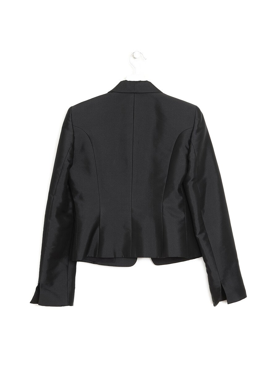 Veston en mélange de soie noir avec bandes à nouer. Col châle.
