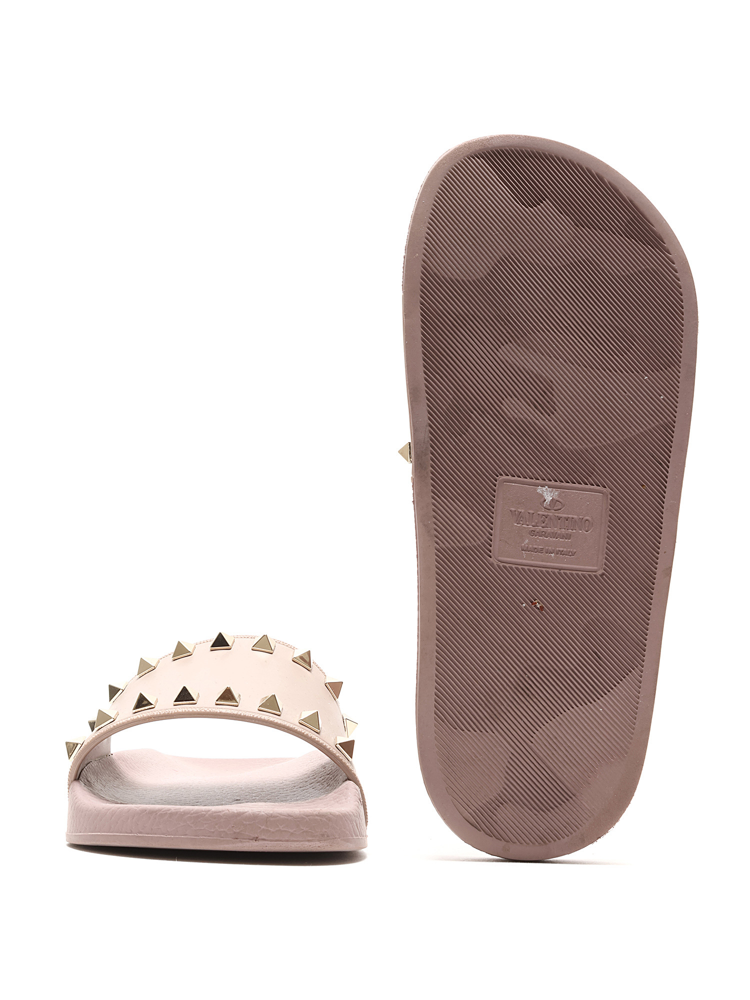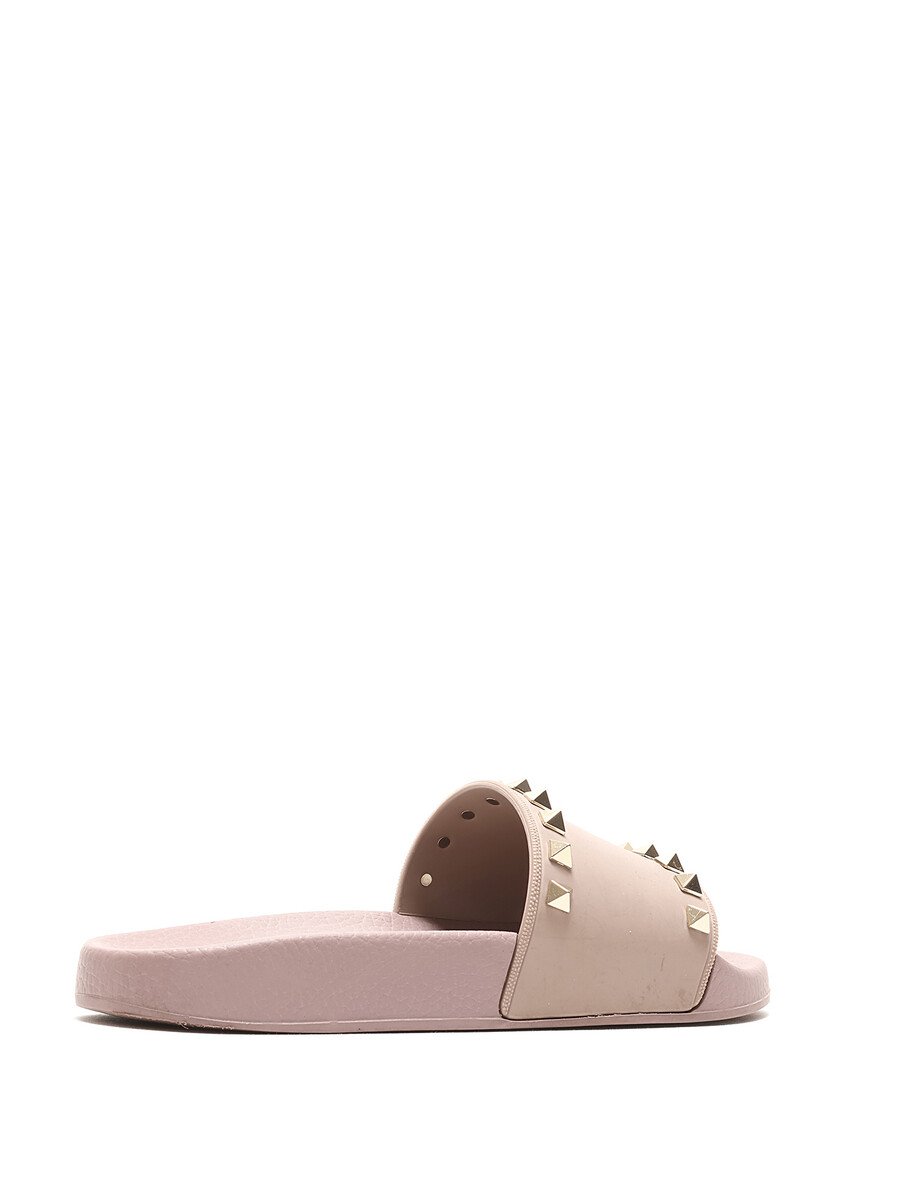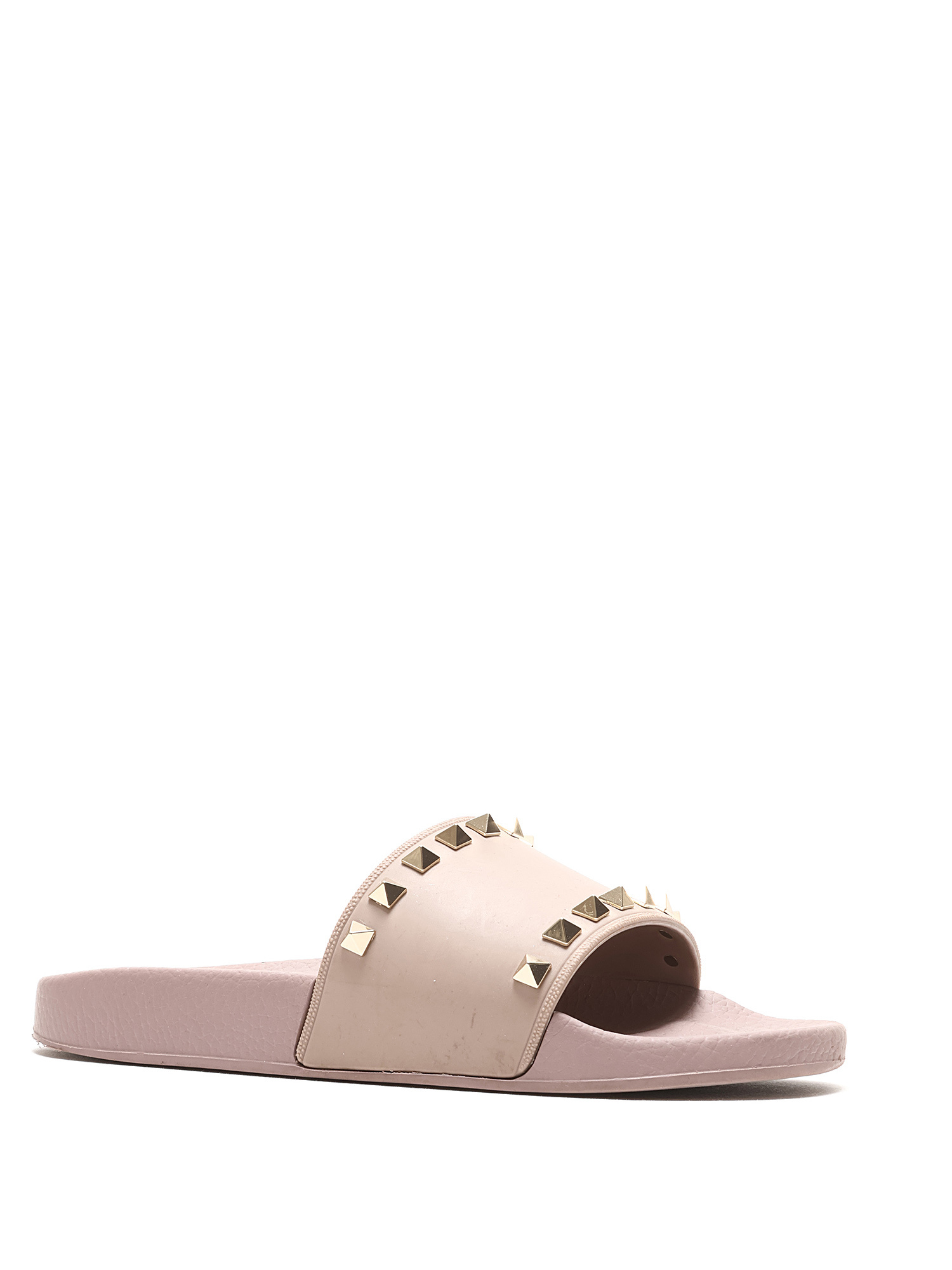 Sandales beiges avec détail à clous métalliques signature. Bout ouvert. Semelle en caoutchouc confortable.