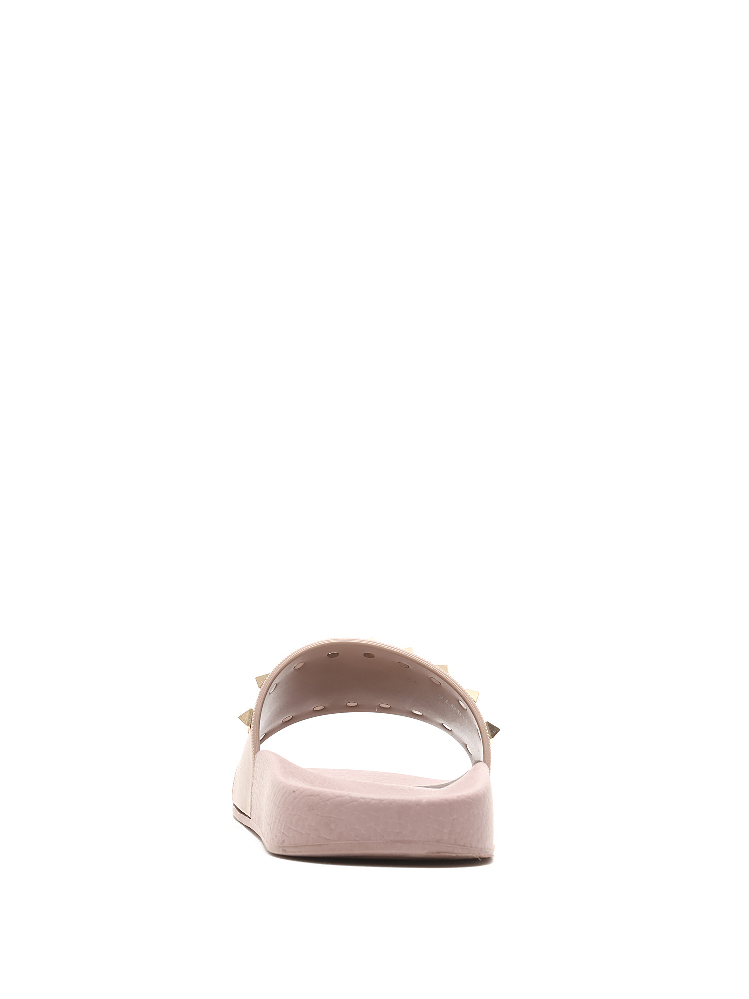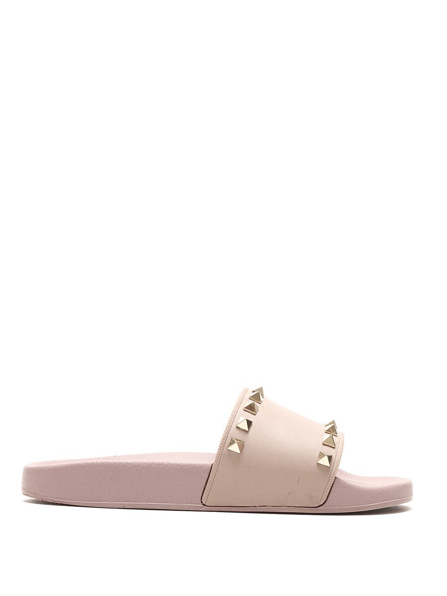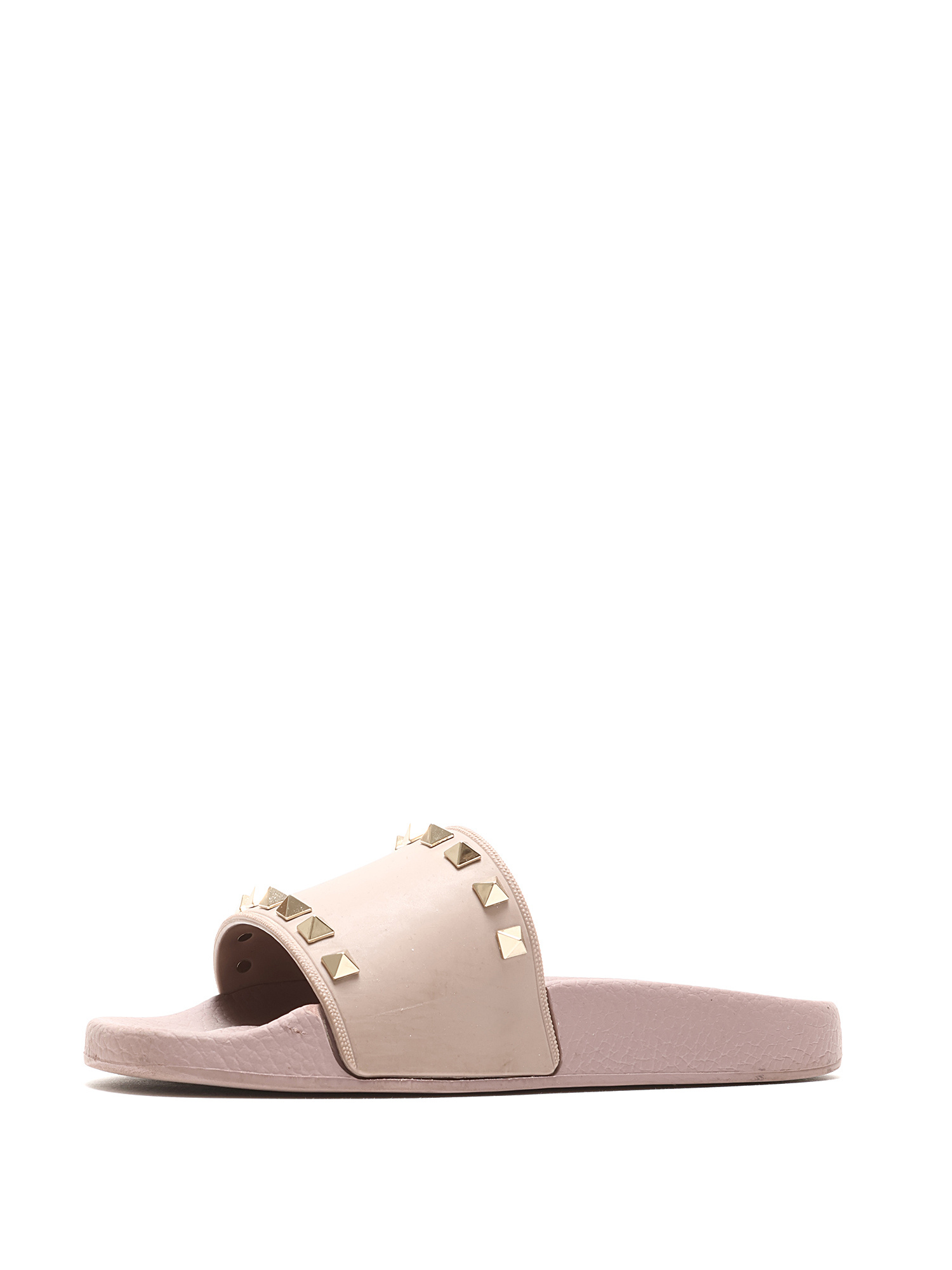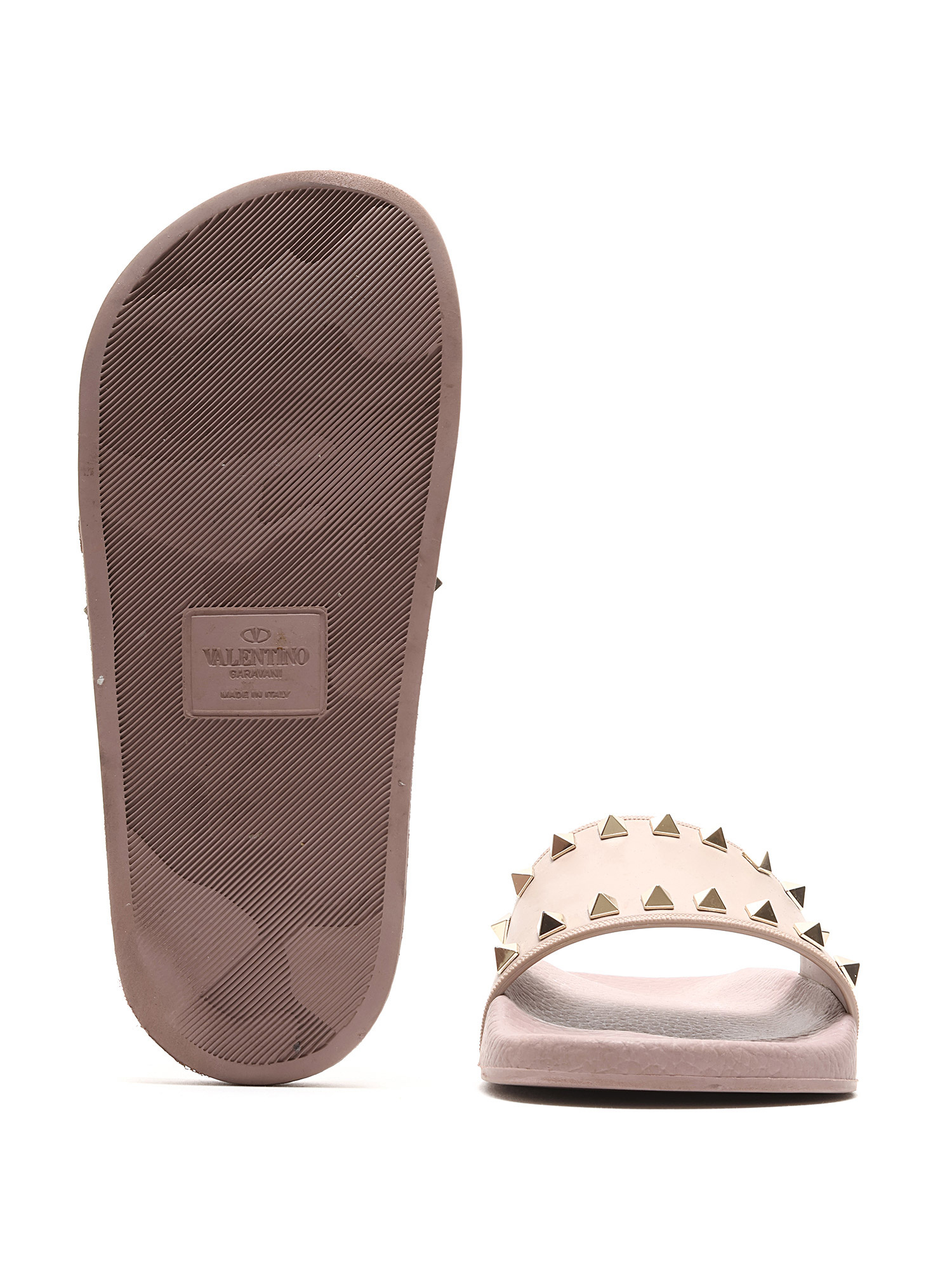 Sandales beiges avec détail à clous métalliques signature. Bout ouvert. Semelle en caoutchouc confortable.