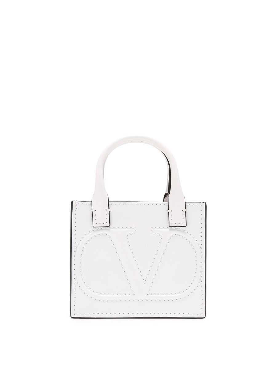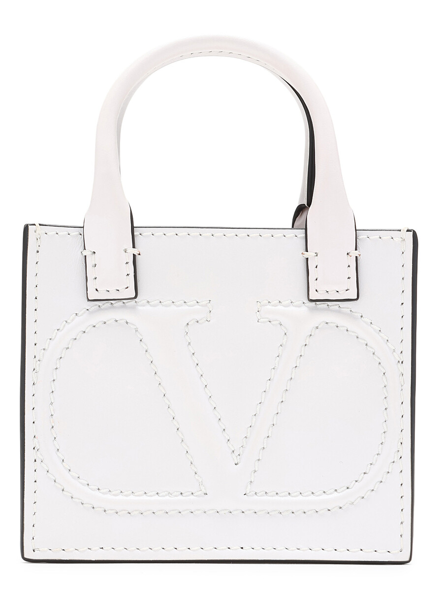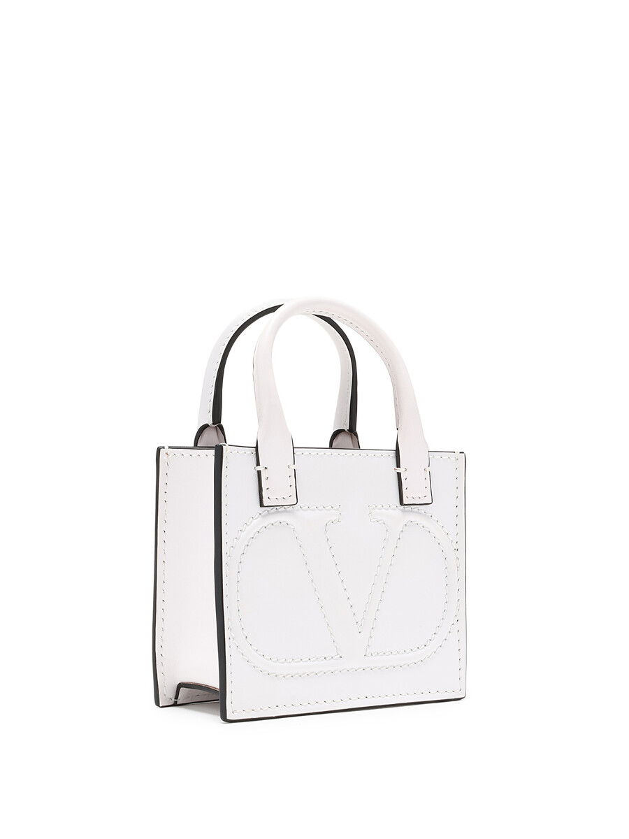Mini sac cabas en cuir grainé blanc avec logo gaufré. Ouverture par le haut avec fermoir. Poignée supérieure et bandoulière ajustable. Ferrures dorées.