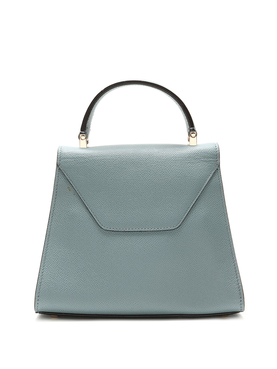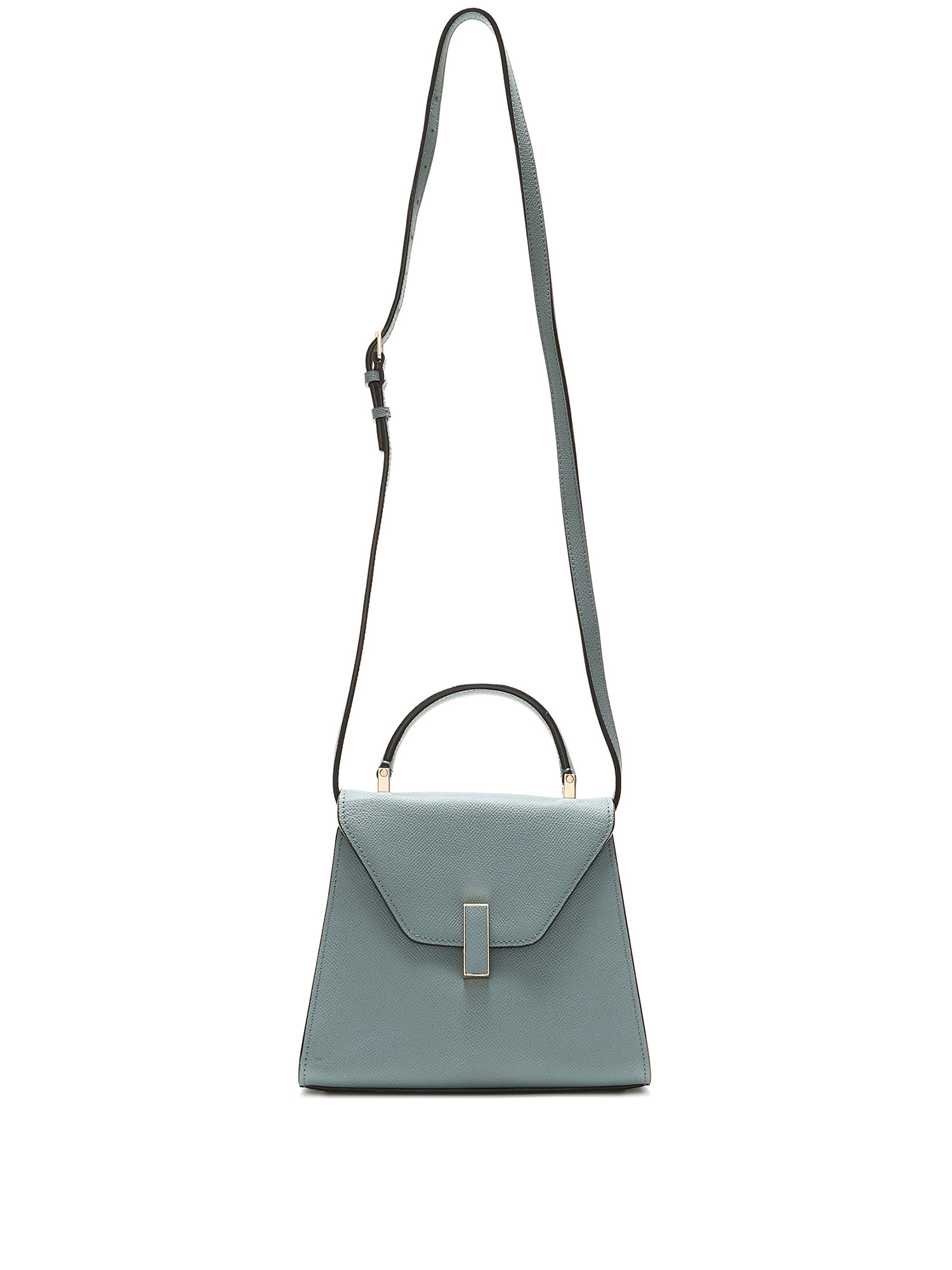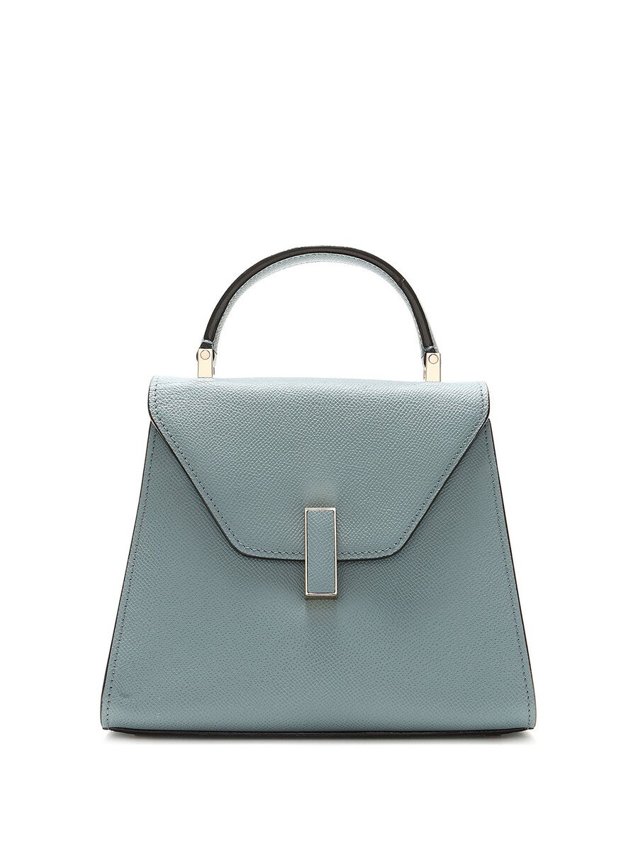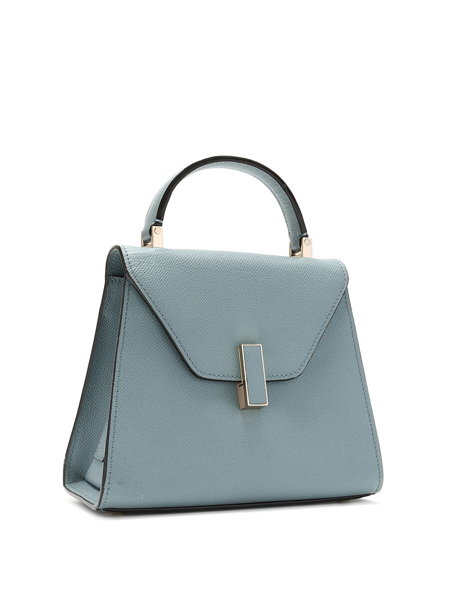 Sac à main Iside en cuir texturé grainé bleu poussiéreux. Fermoir magnétique sous rabat. Poignée supérieure unique. Ferrures métalliques argentées.