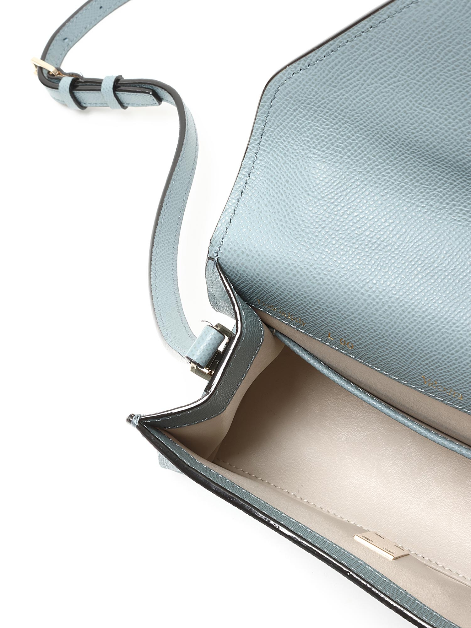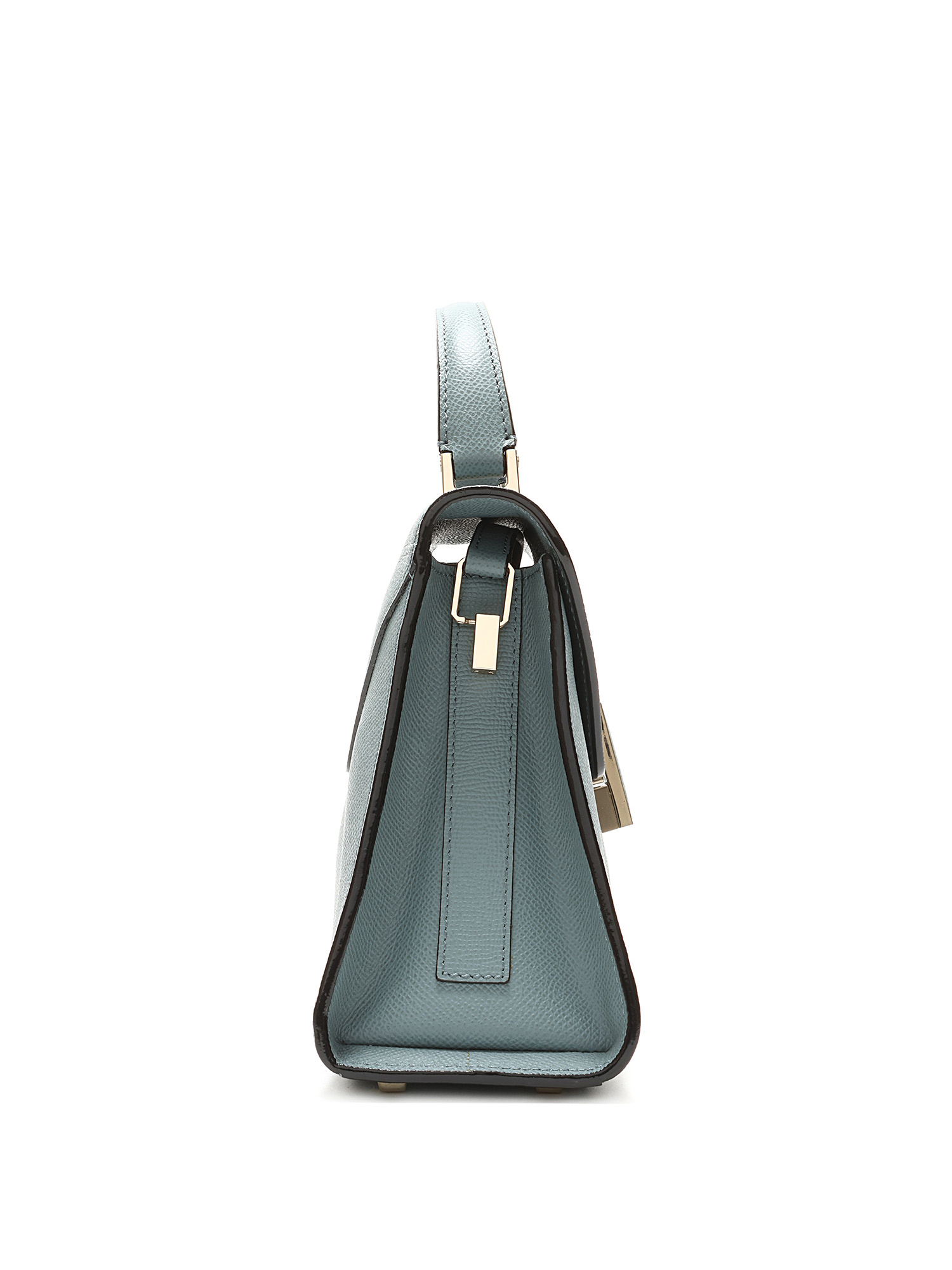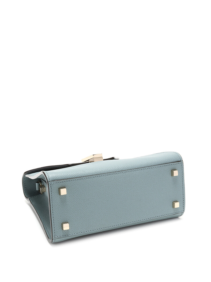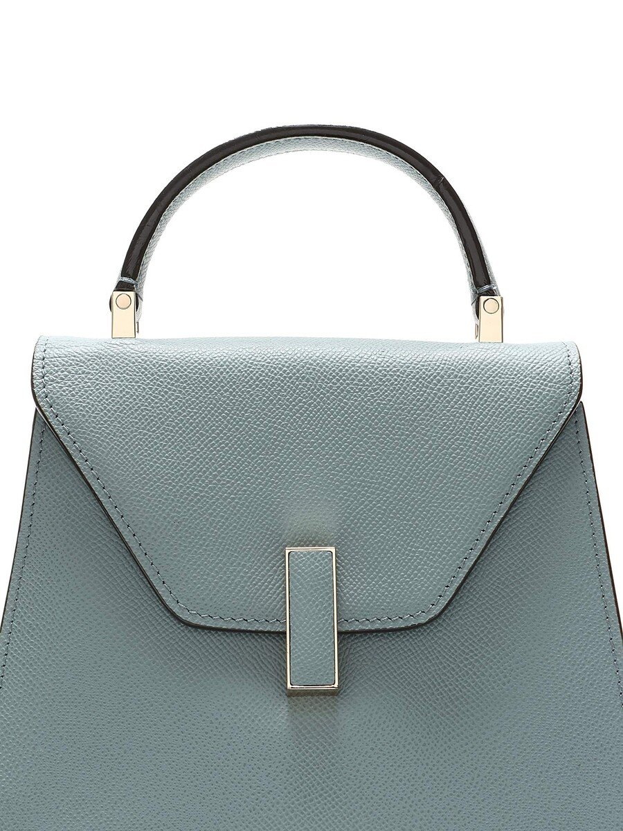 Sac à main Iside en cuir texturé grainé bleu poussiéreux. Fermoir magnétique sous rabat. Poignée supérieure unique. Ferrures métalliques argentées.