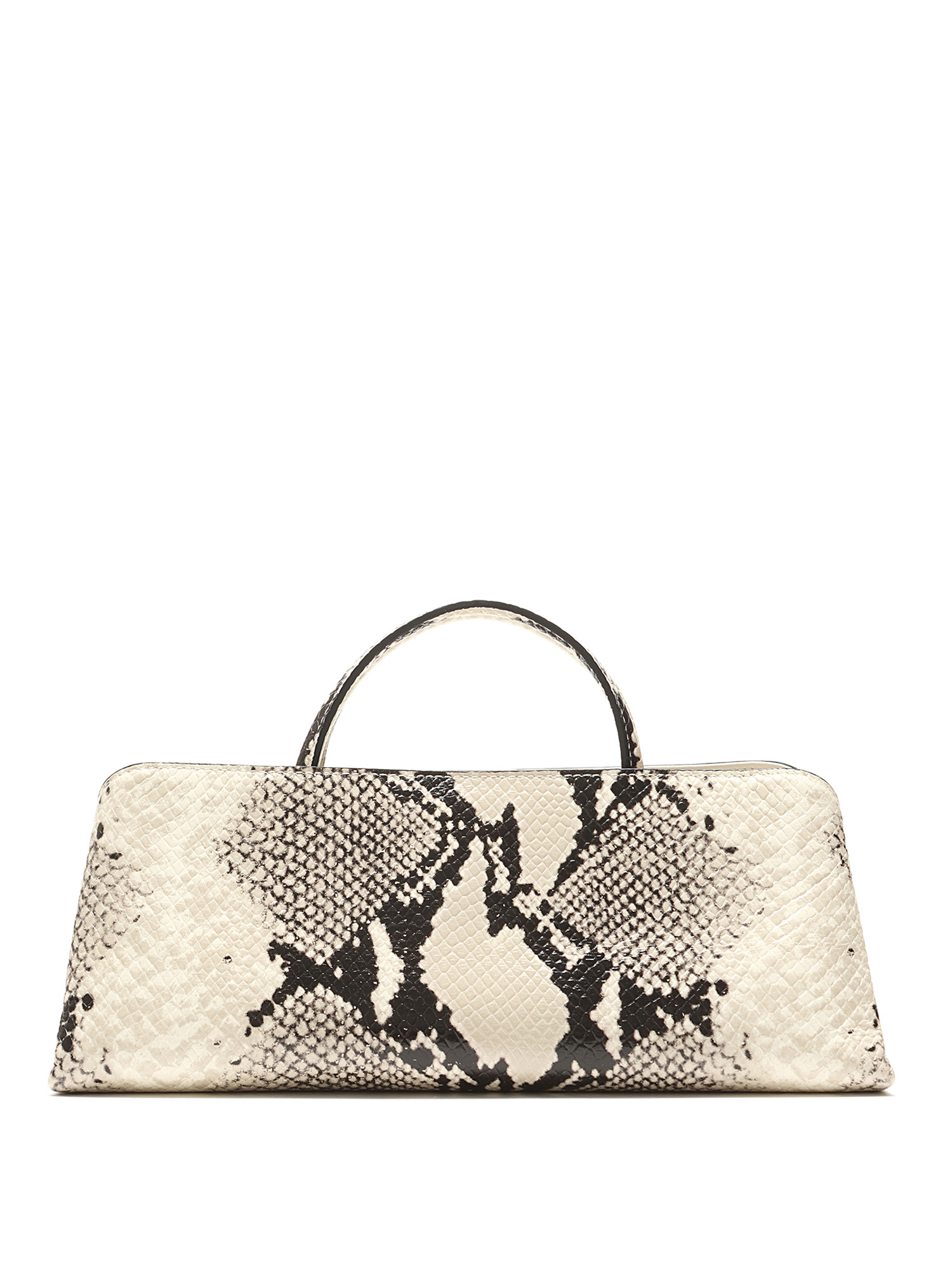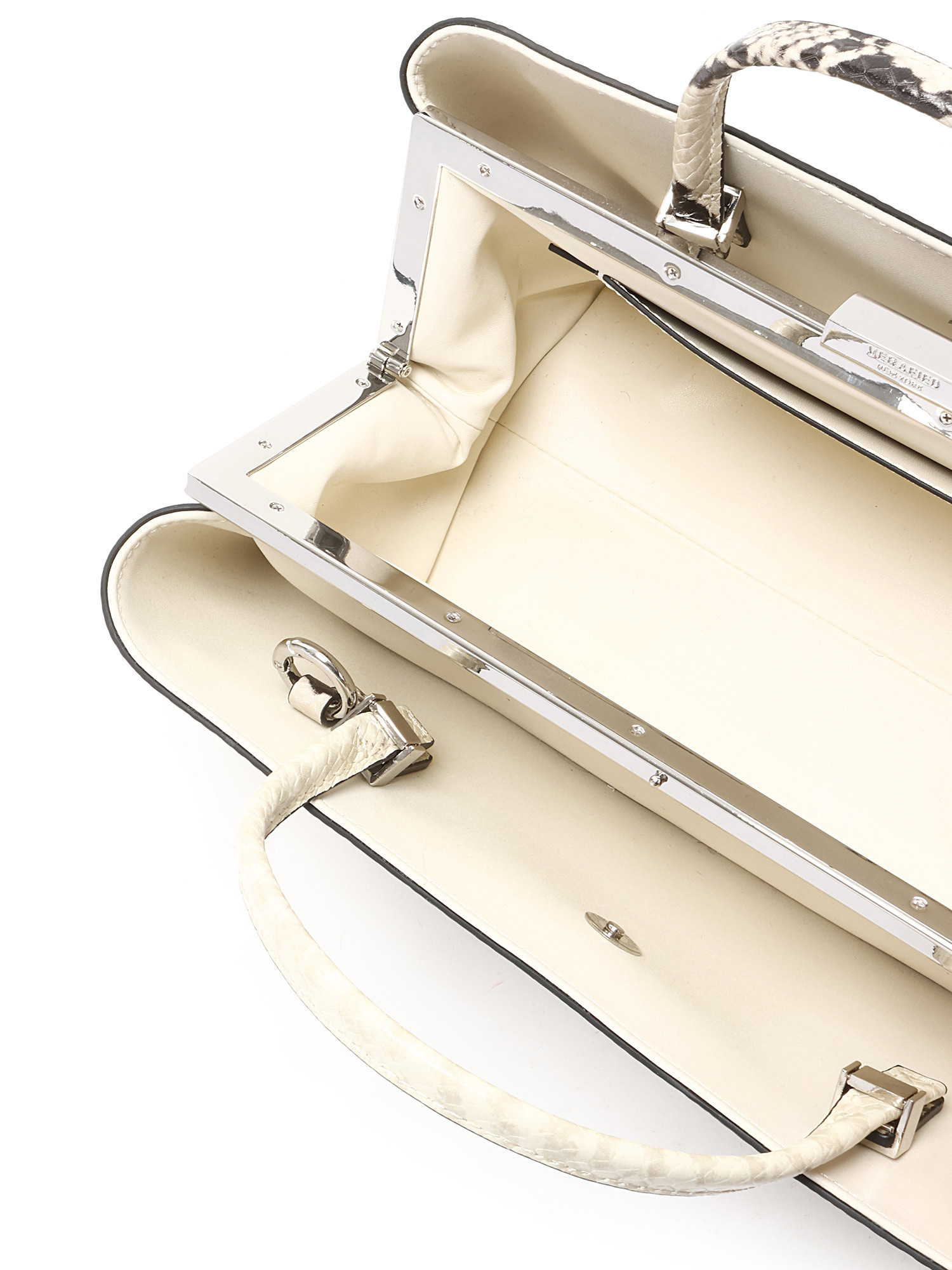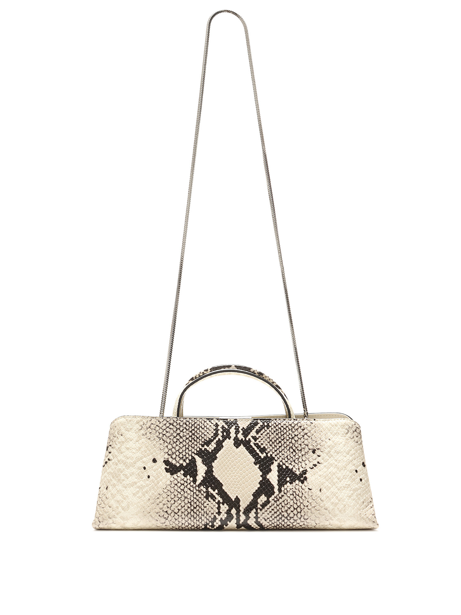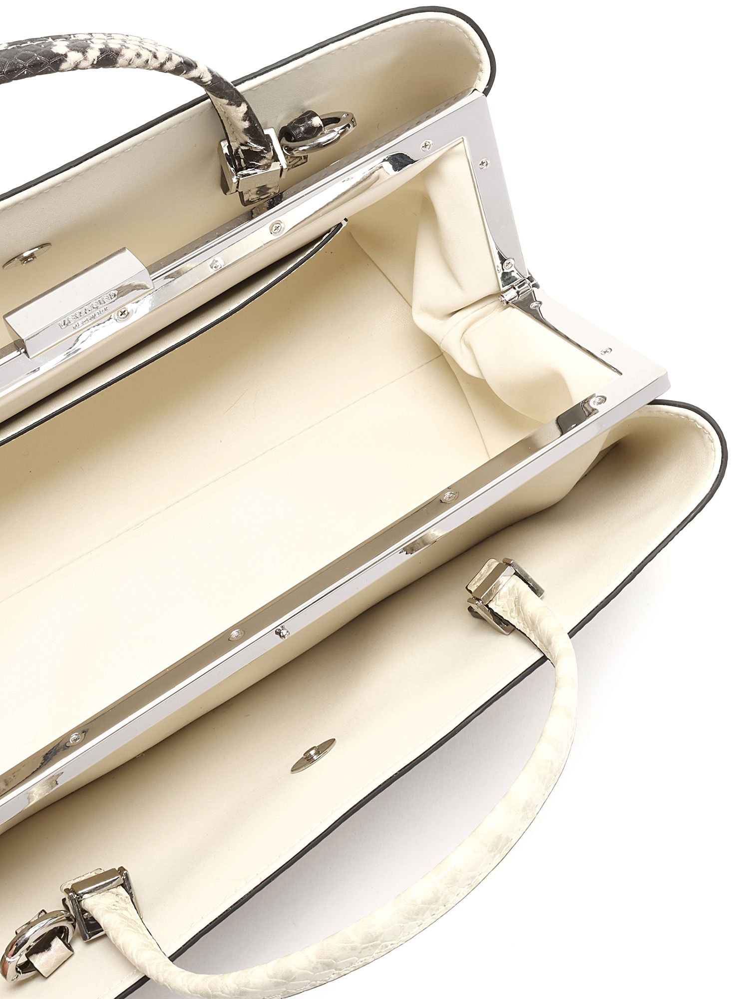 Pochette en cuir à motif serpent noir et blanc. Fermeture à cadre métallique avec poignée en cuir serpent. Ferrures en métal argenté, trois bandoulières amovibles incluses.