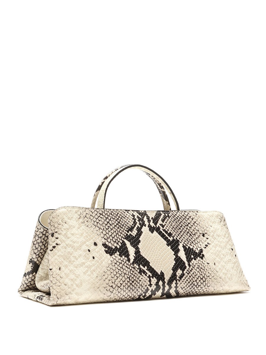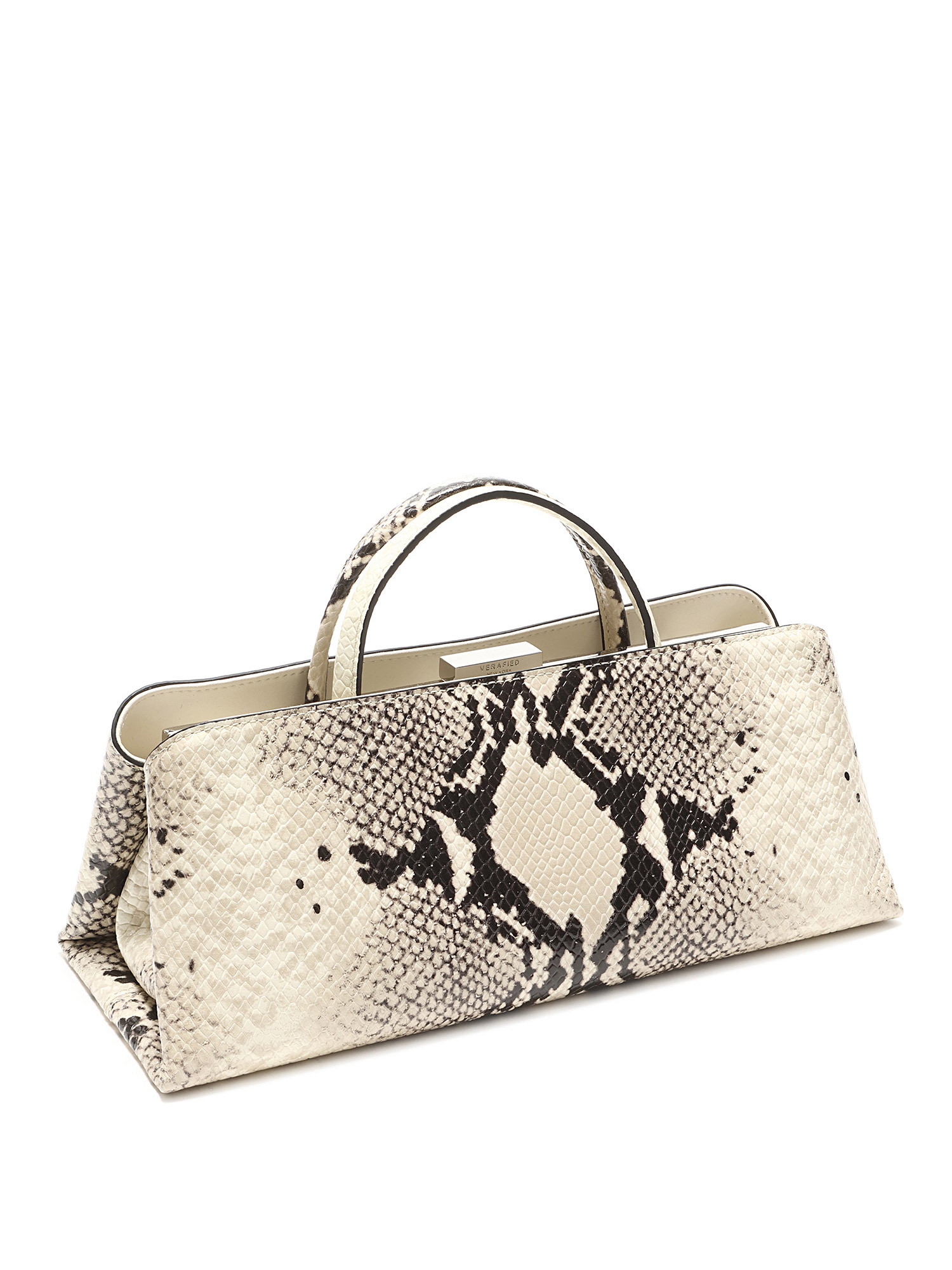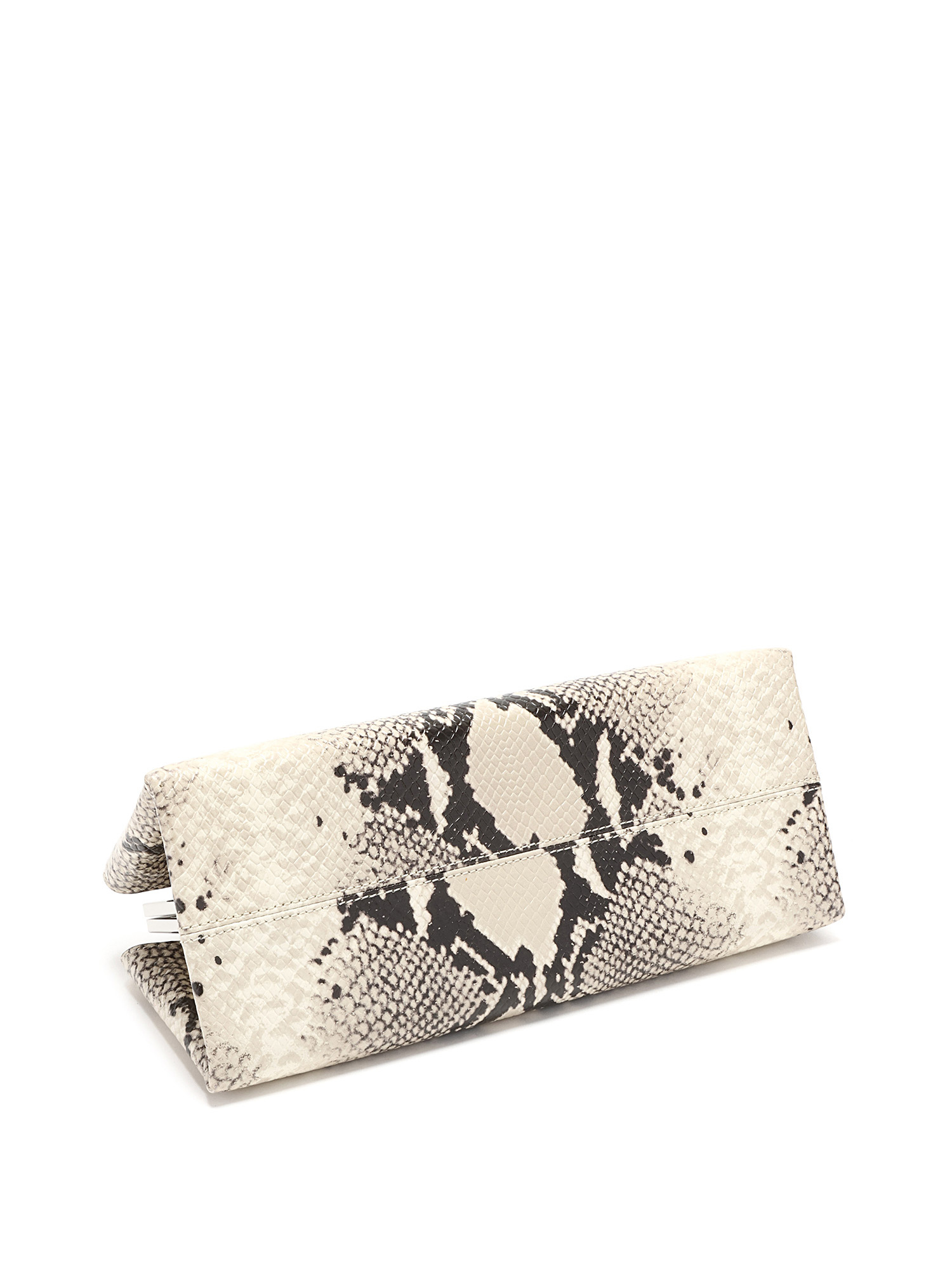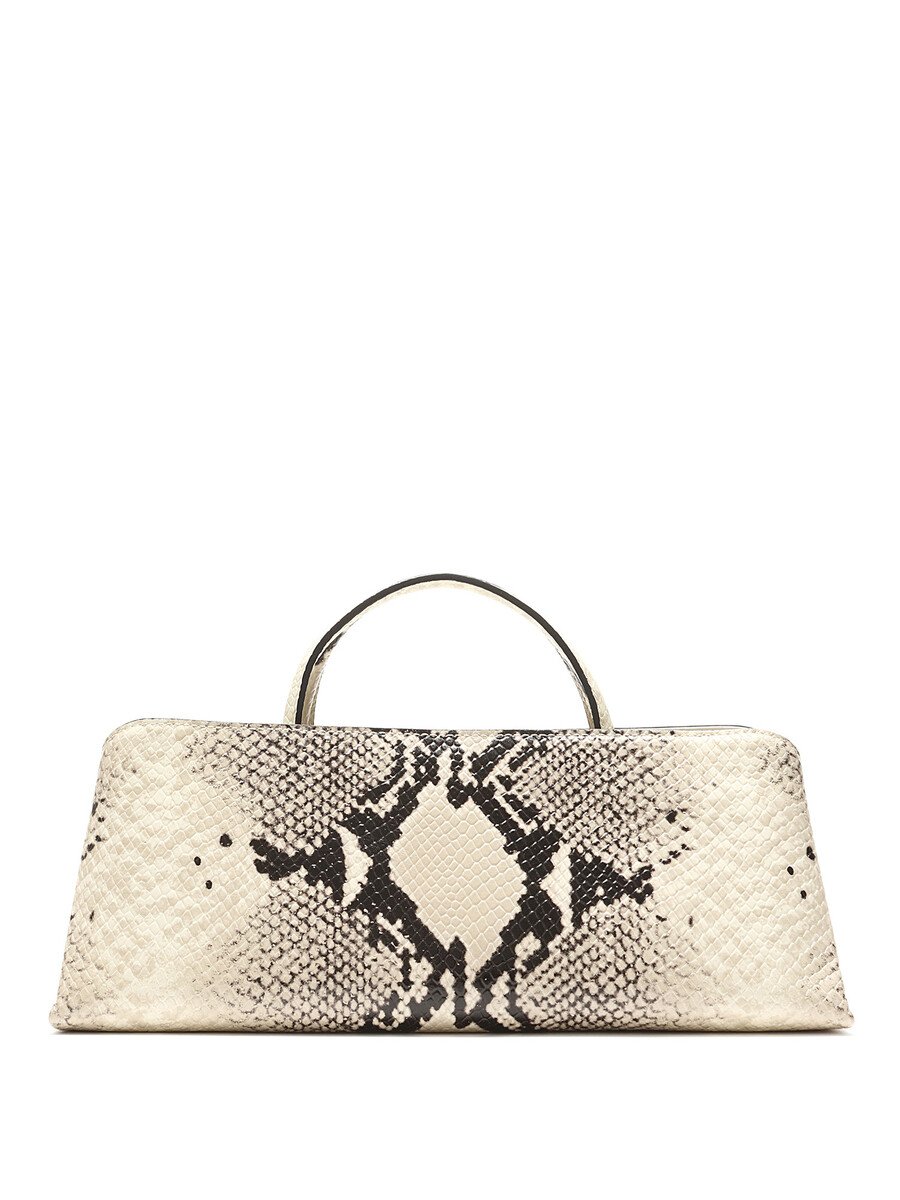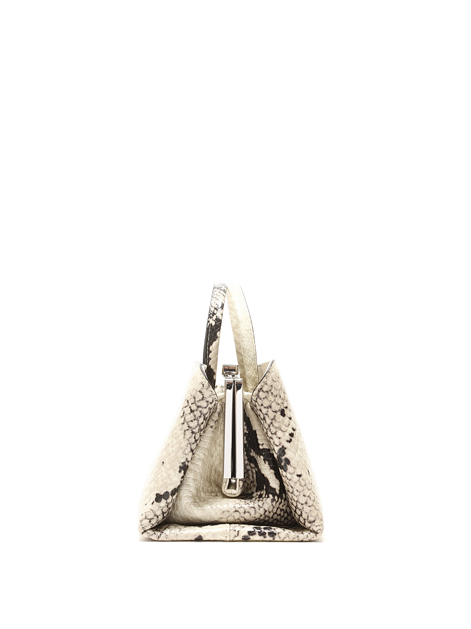 Pochette en cuir à motif serpent noir et blanc. Fermeture à cadre métallique avec poignée en cuir serpent. Ferrures en métal argenté, trois bandoulières amovibles incluses.