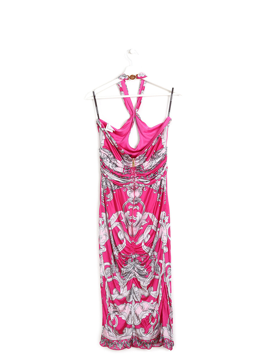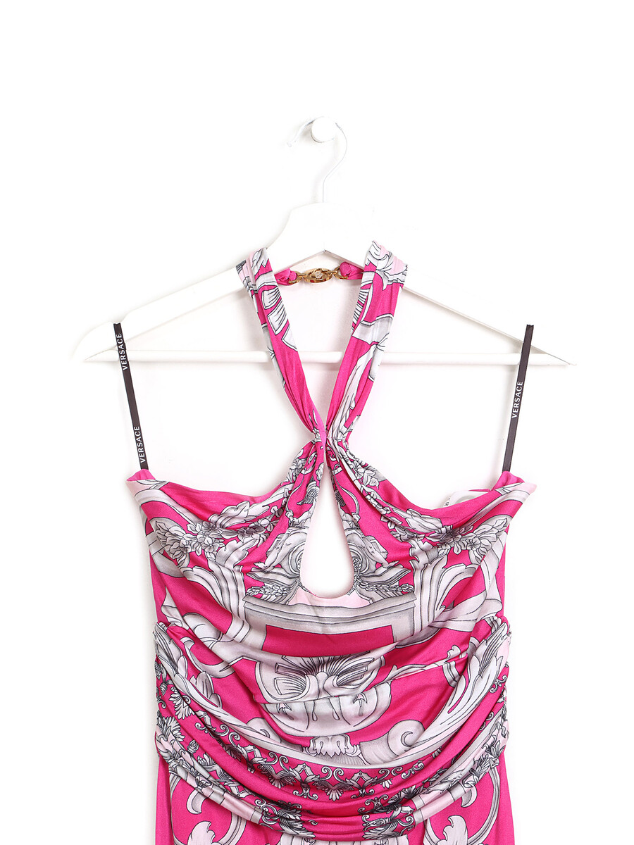 Robe sans manches à motif floral en rose. Fermeture à glissière dorée. Boutons Medusa dorés sur les bretelles.