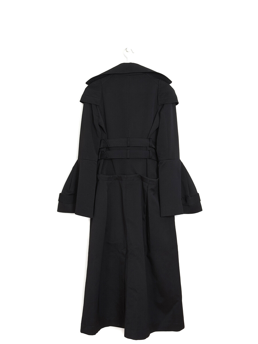 Manteau long convertible en noir. Fermeture à boutons. Col à revers cranté. Poches à rabat devant. Deux poches intérieures.