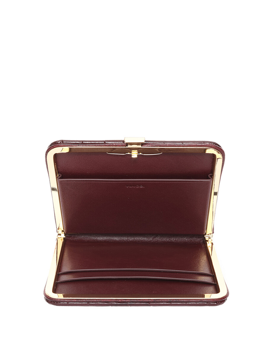 Portefeuille en cuir embossé crocodile bordeaux. Fermoir en métal avec finition dorée.