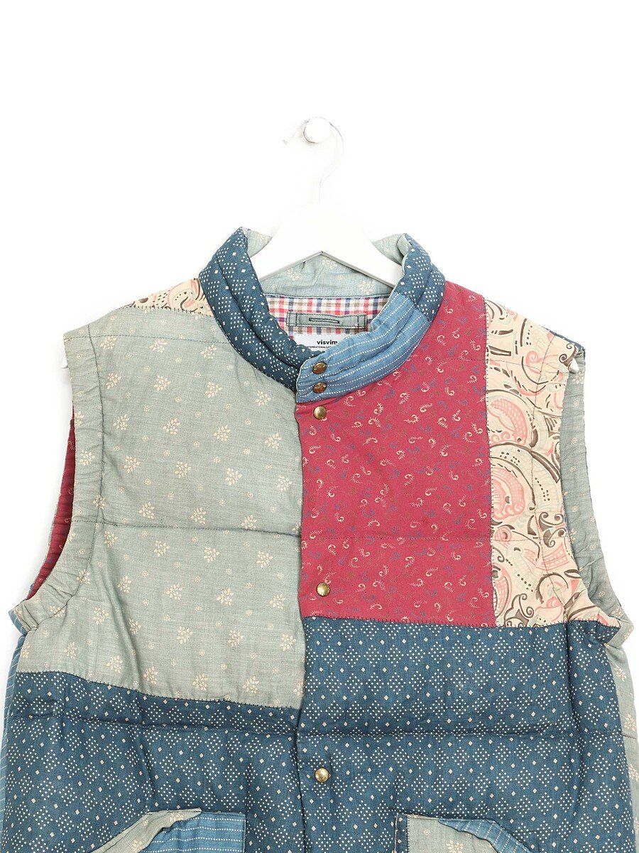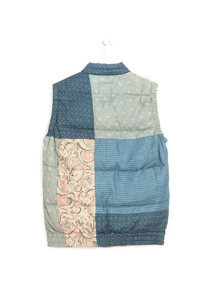 Gilet patchwork sans manches à motifs de carreaux et écossais. Confectionné en coton avec des accents de lin, rembourré de duvet et plumes pour la chaleur.