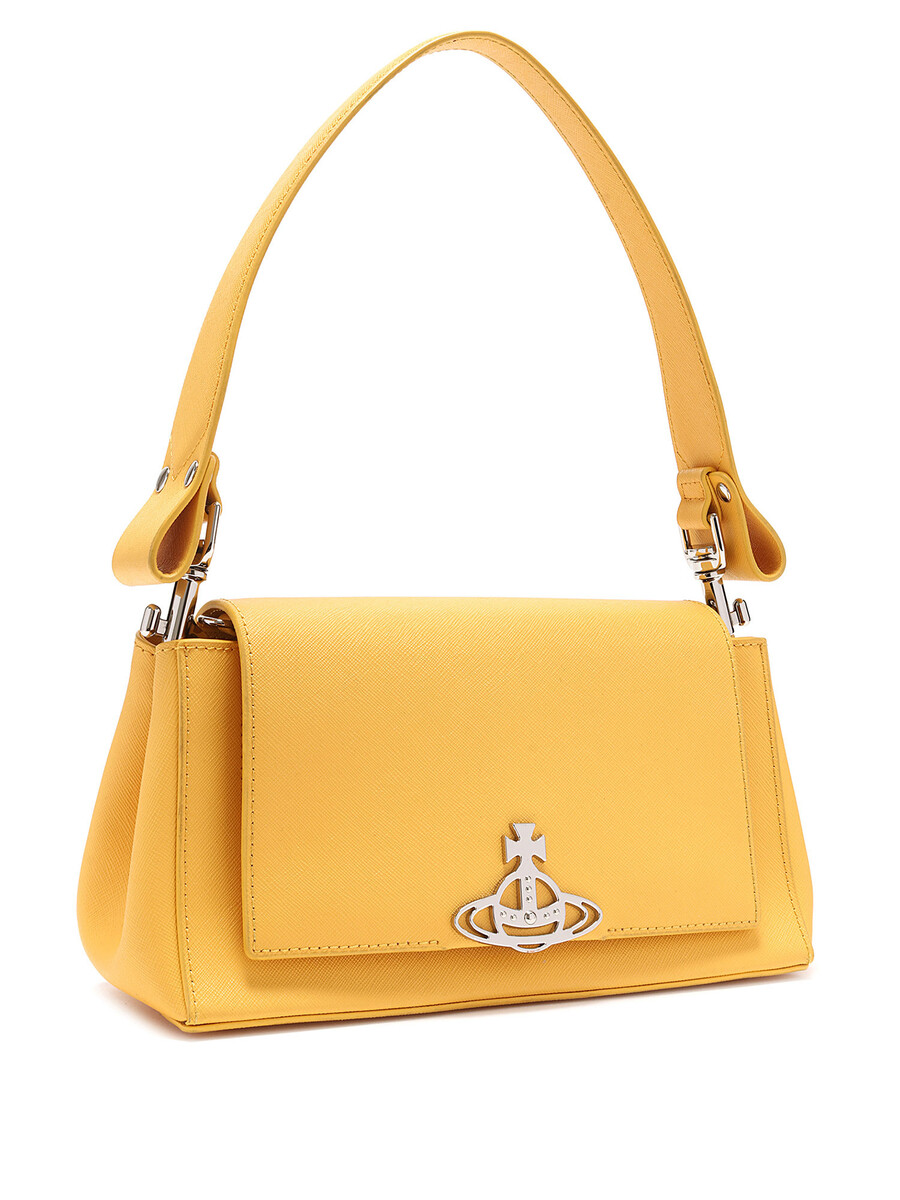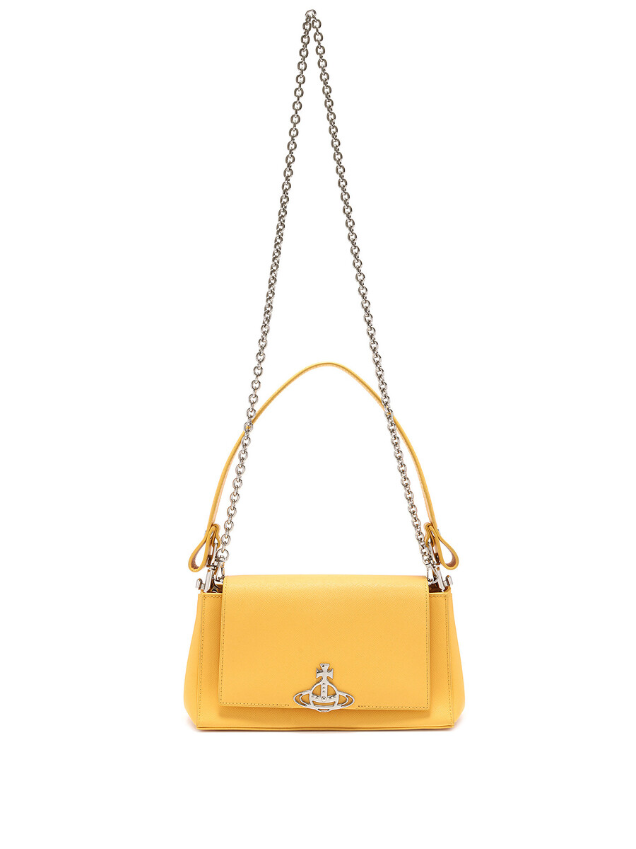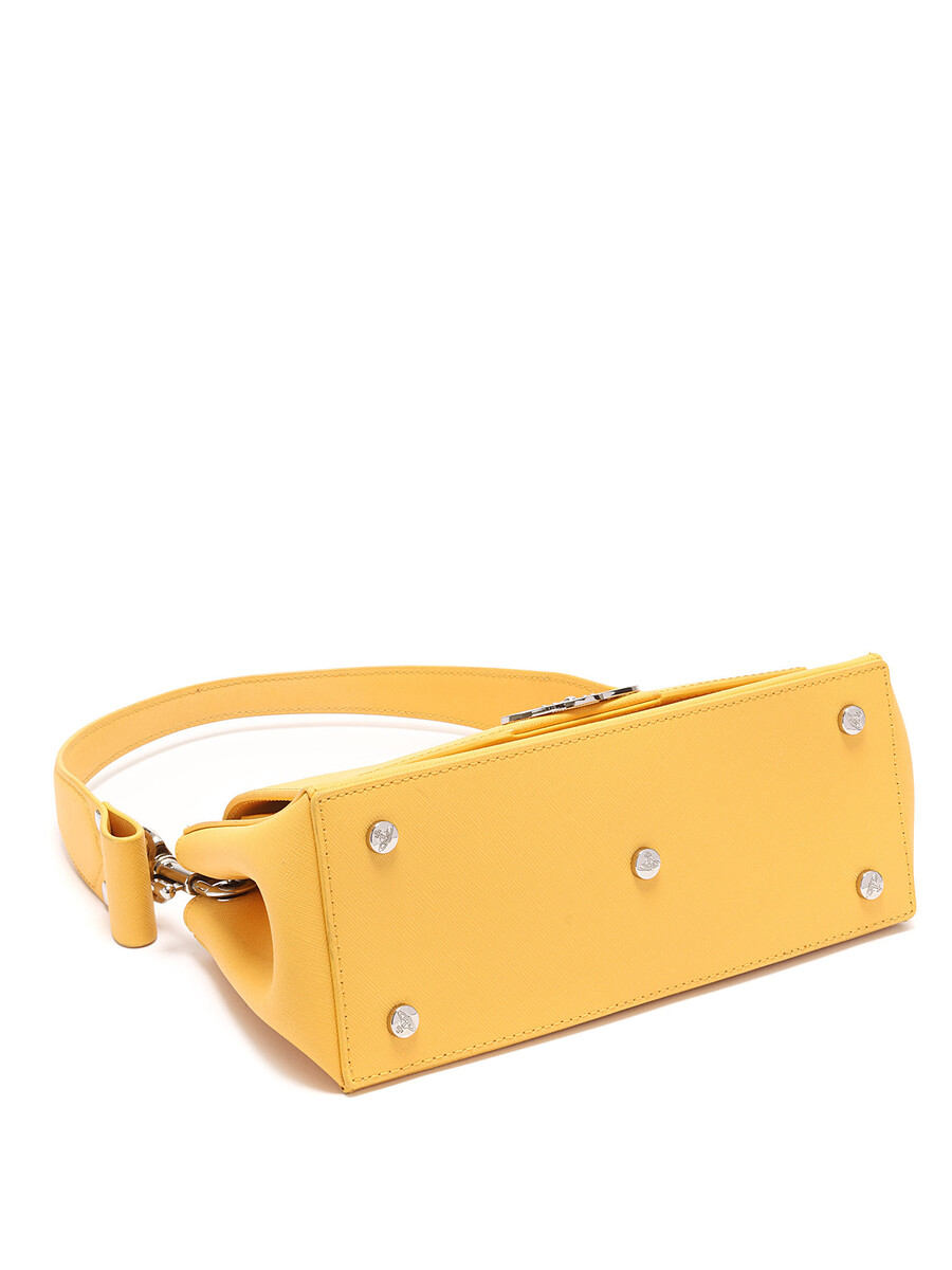 Sac à main en cuir jaune moutarde avec fermeture à pression magnétique. Livré avec une bandoulière en cuir et une chaîne amovible. Ferrures argentées.