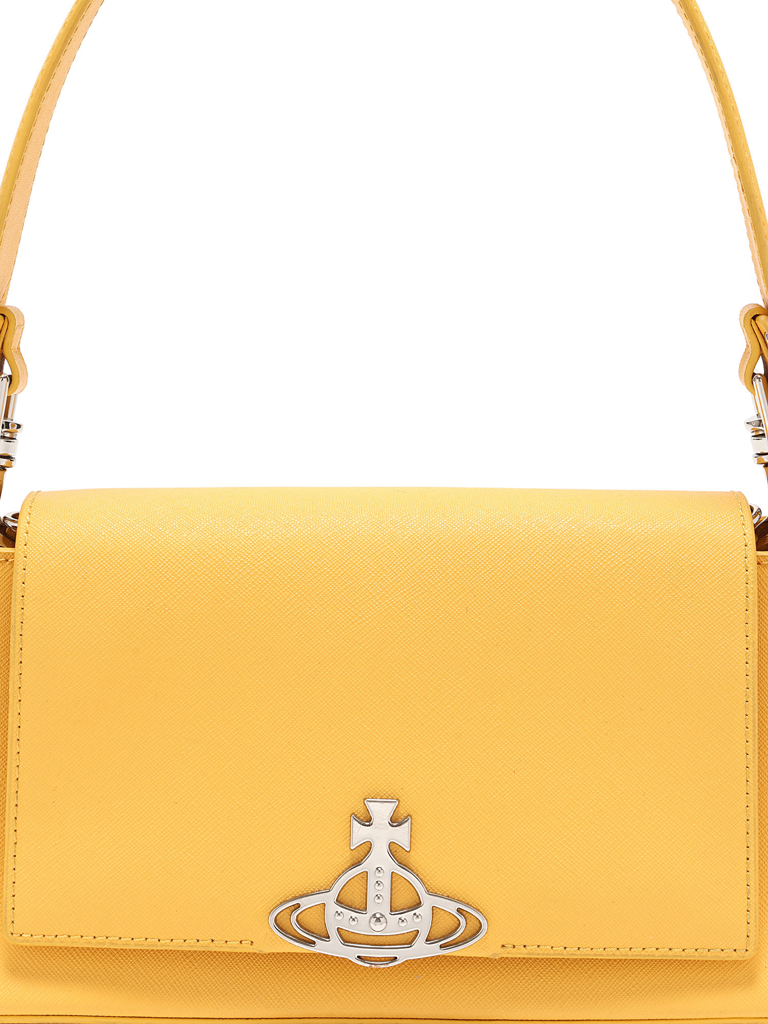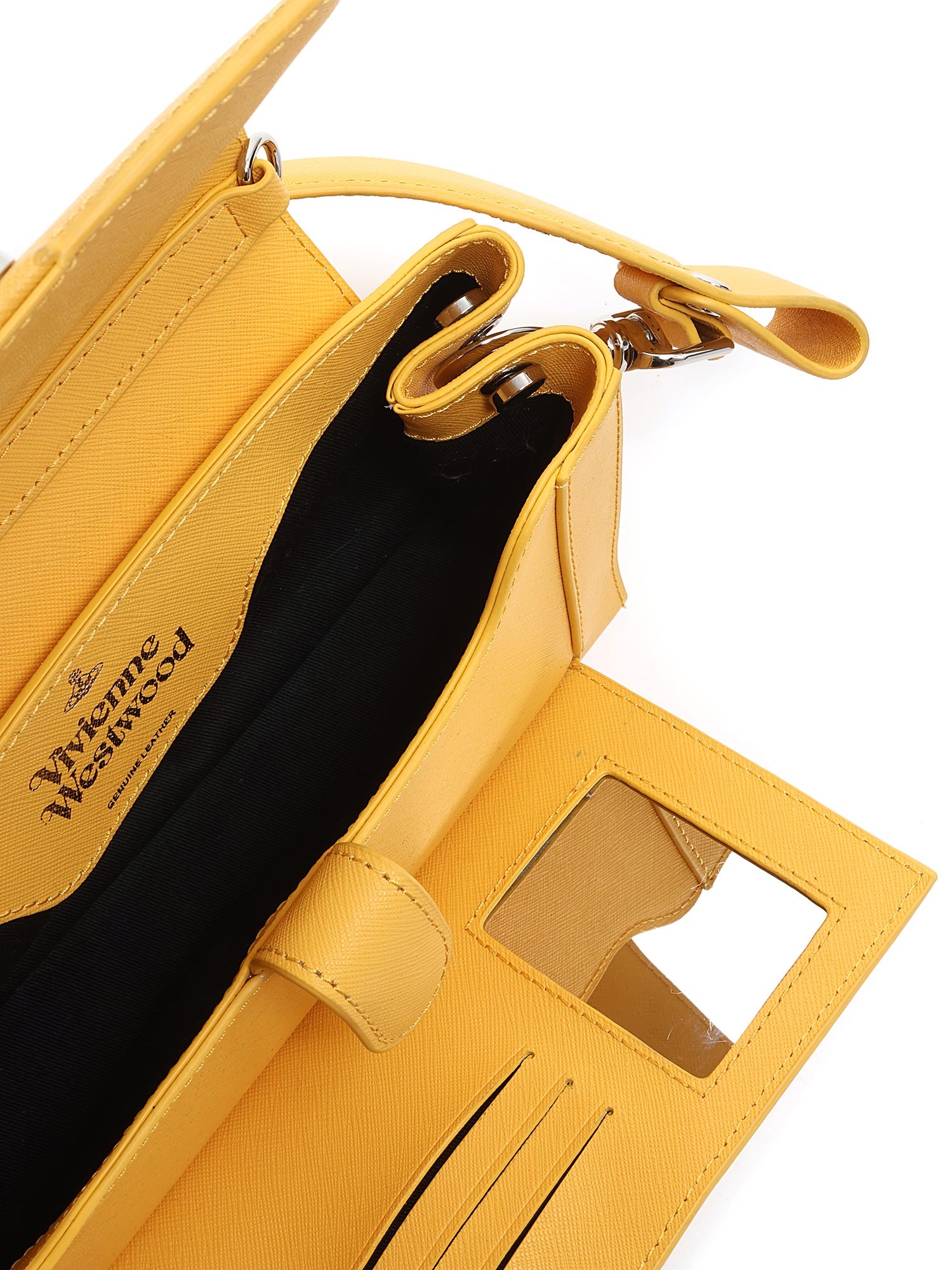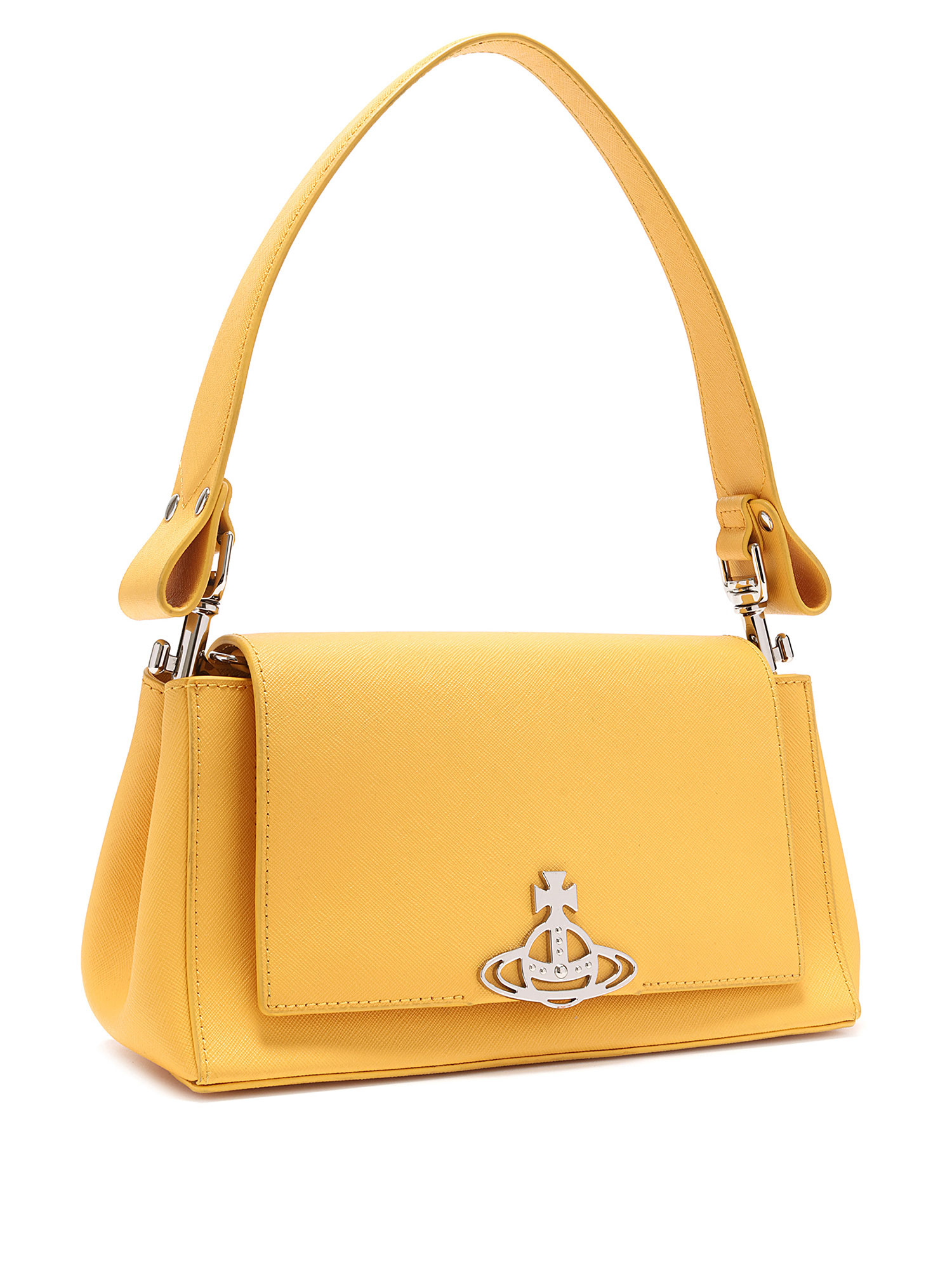 Sac à main en cuir jaune moutarde avec fermeture à pression magnétique. Livré avec une bandoulière en cuir et une chaîne amovible. Ferrures argentées.