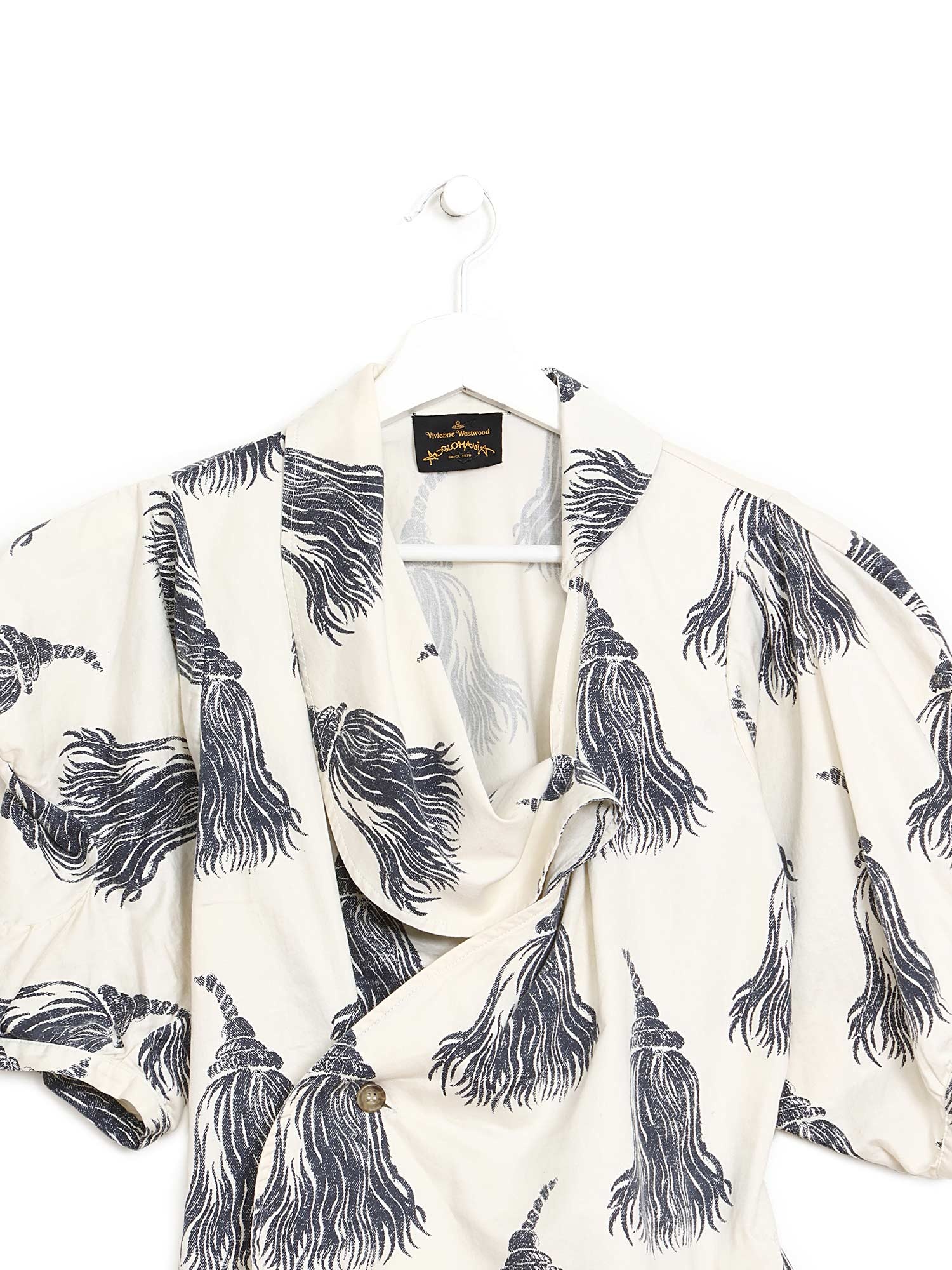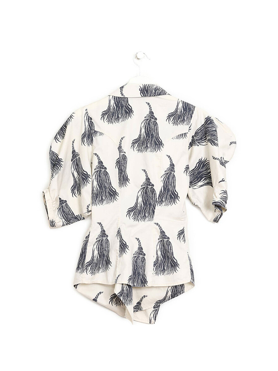 Chemise en coton blanche avec motif graphique à pampilles noires distinctif. Encolure en V avec fermeture à boutons. Manches bouffantes.