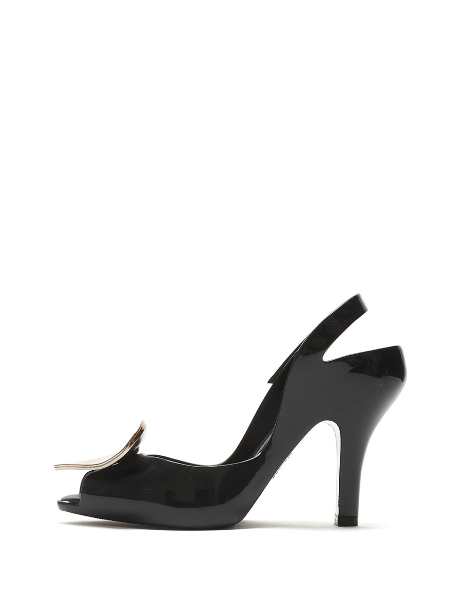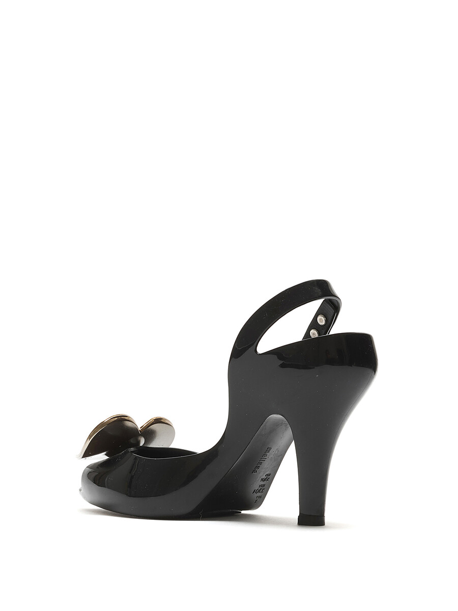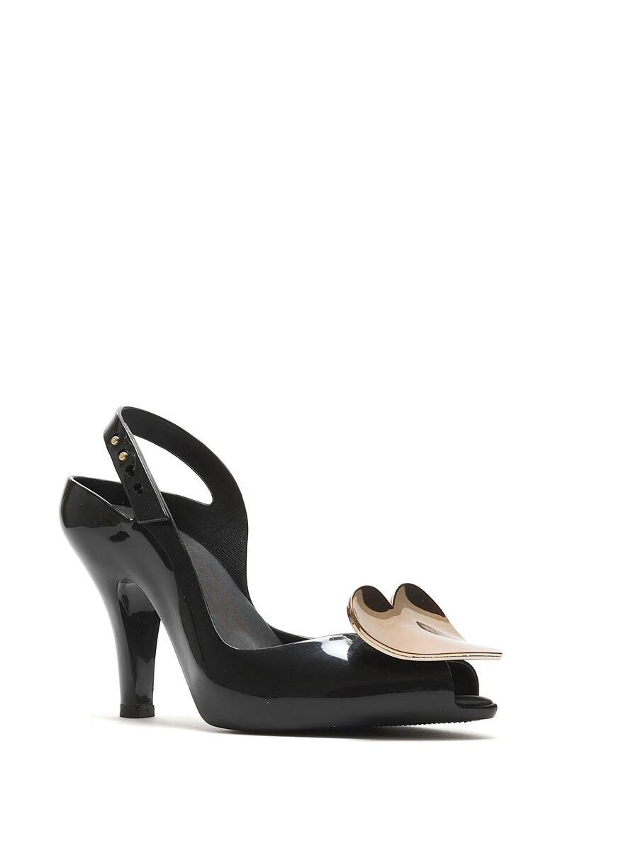 Talons hauts en caoutchouc noirs à bride arrière, avec un élément décoratif en forme de cœur doré. Bout pointu. Fermeture à boucle. Semelle en caoutchouc.