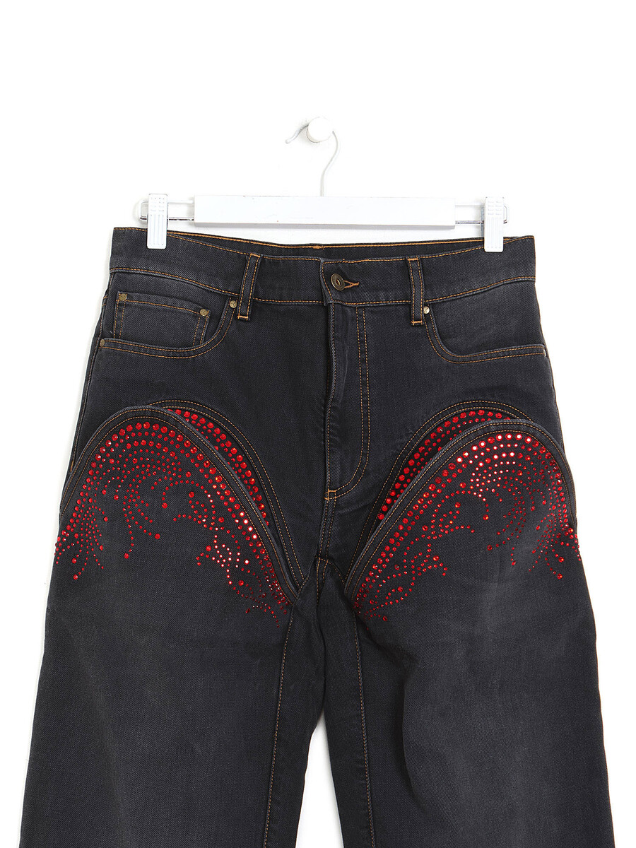 Jean en denim noir délavé avec des pierres en strass aux découpes. Design distinctif offrant un look audacieux avec accents scintillants.