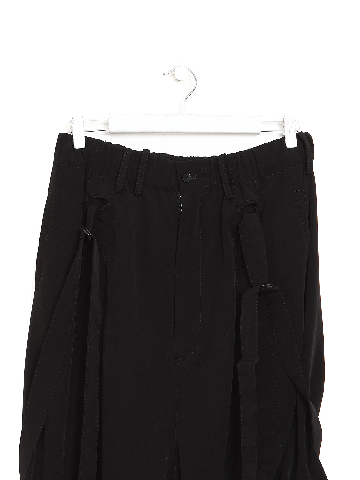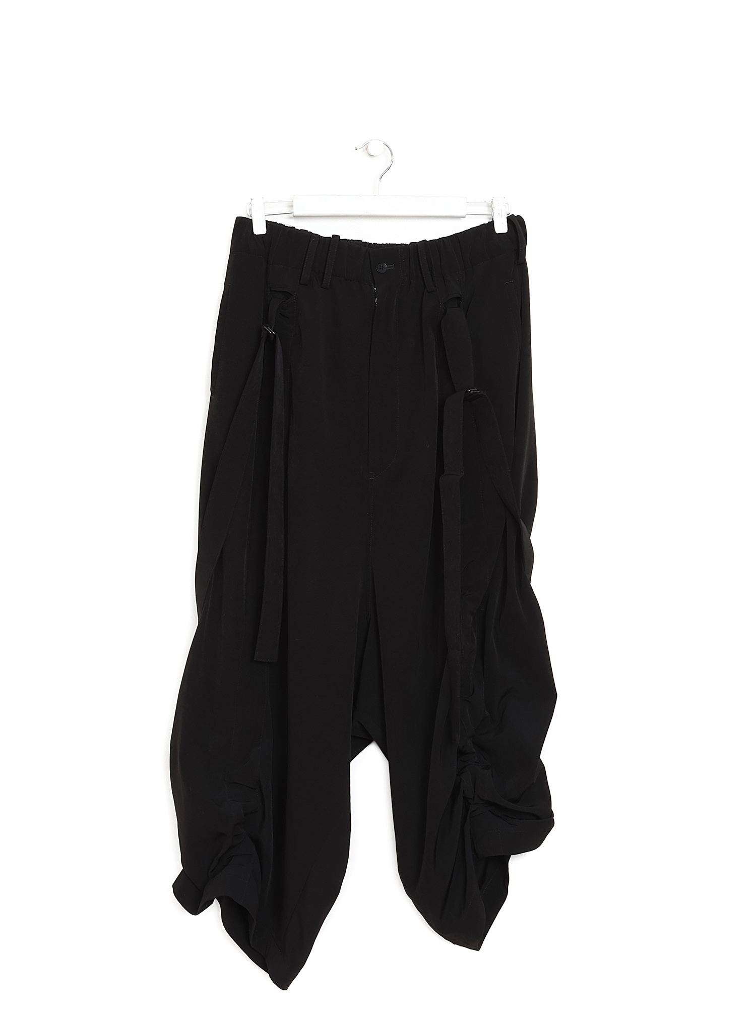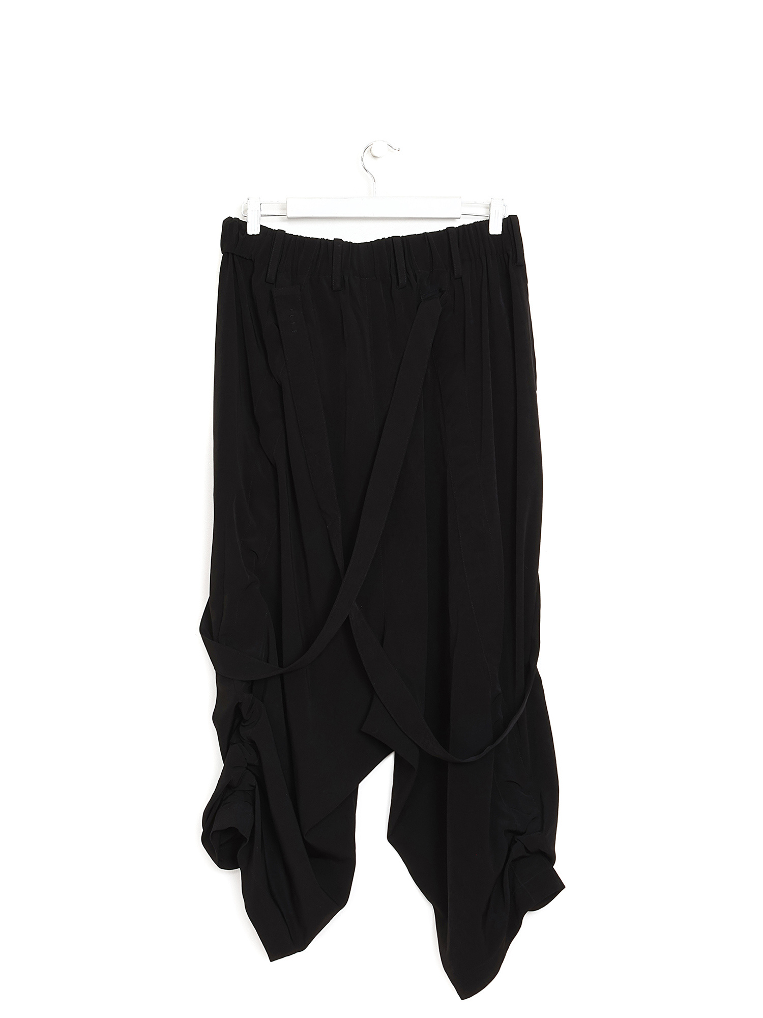 Pantalon noir à coupe ample et à entrejambe bas. Taille élastique.