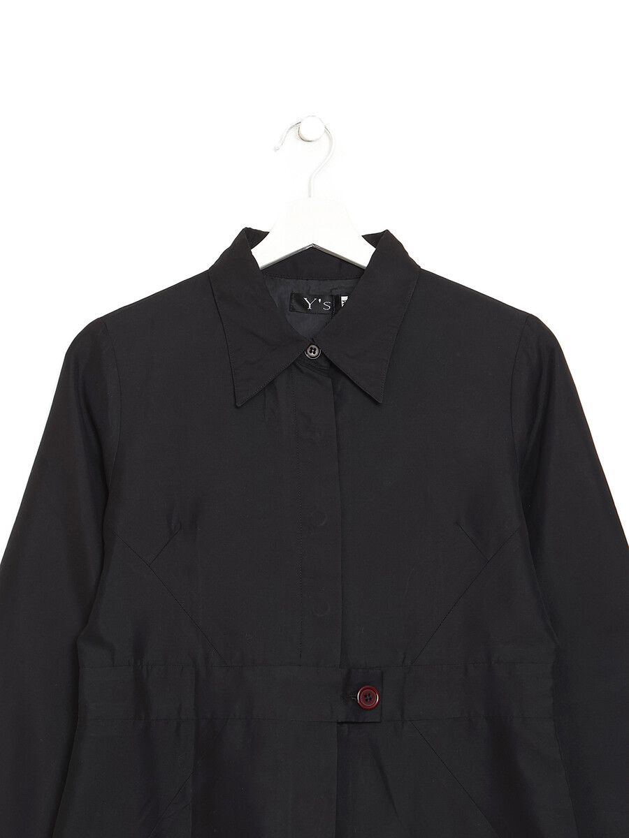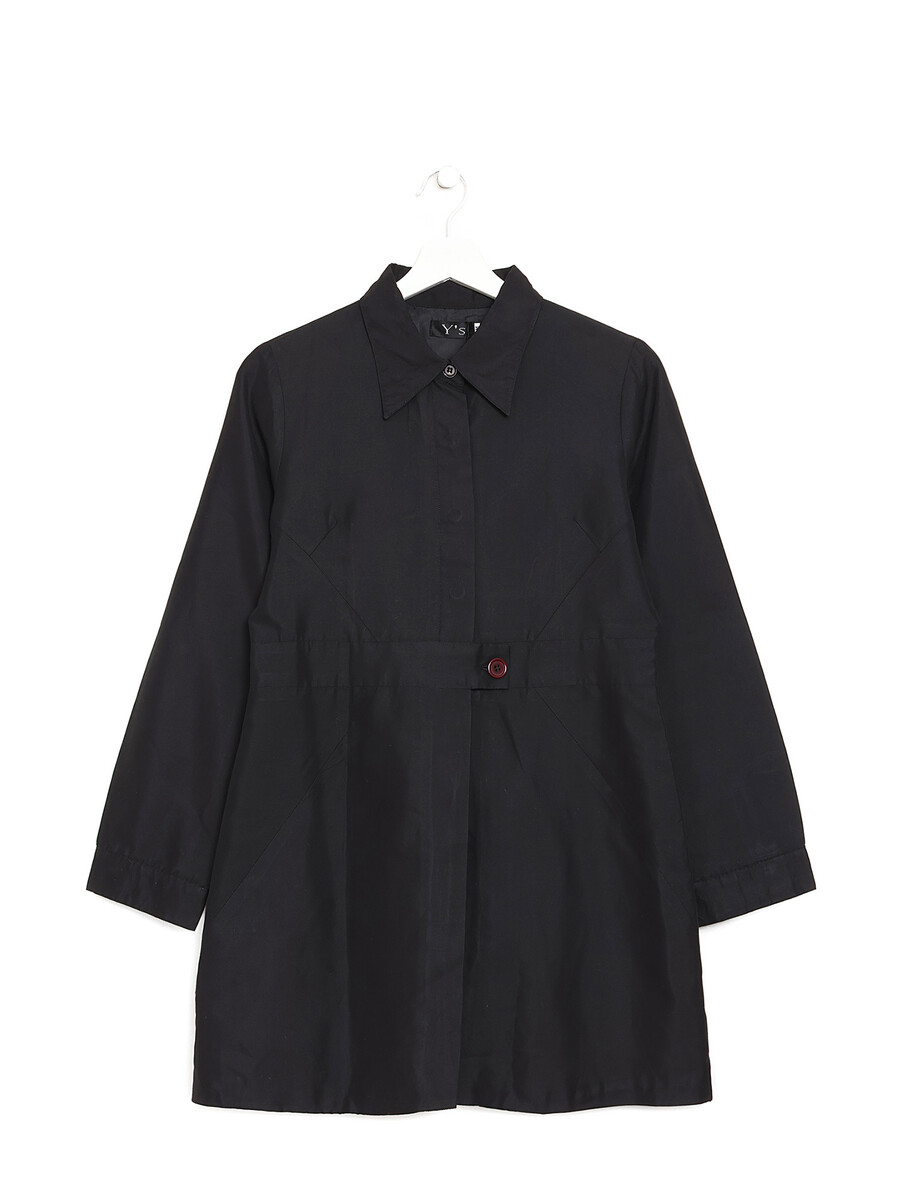 Manteau noir à boutonnage croisé avec col chemise classique.