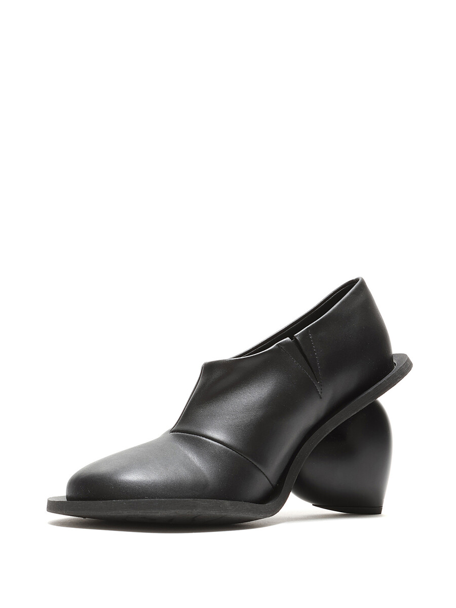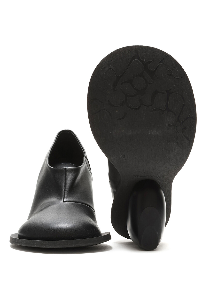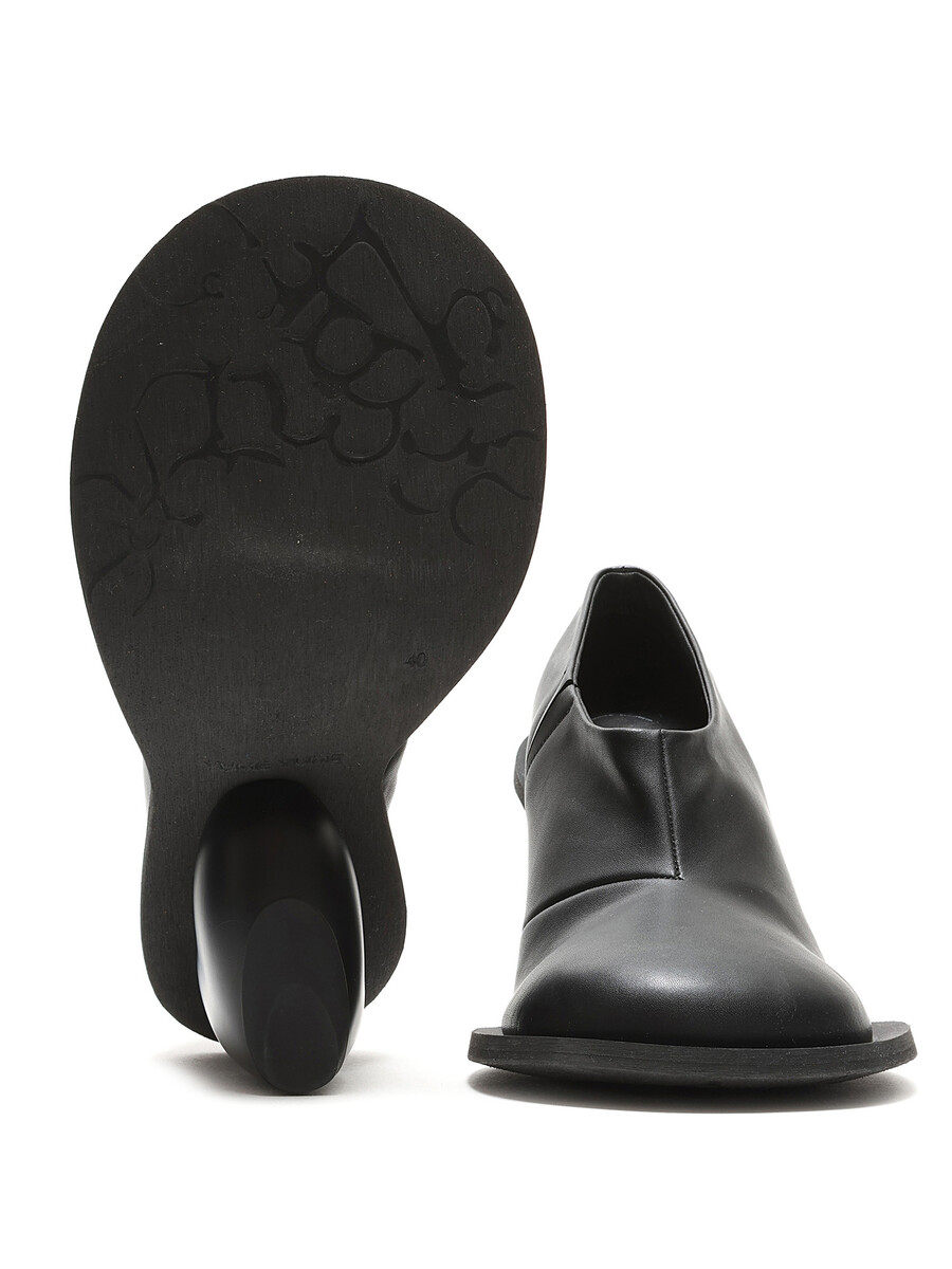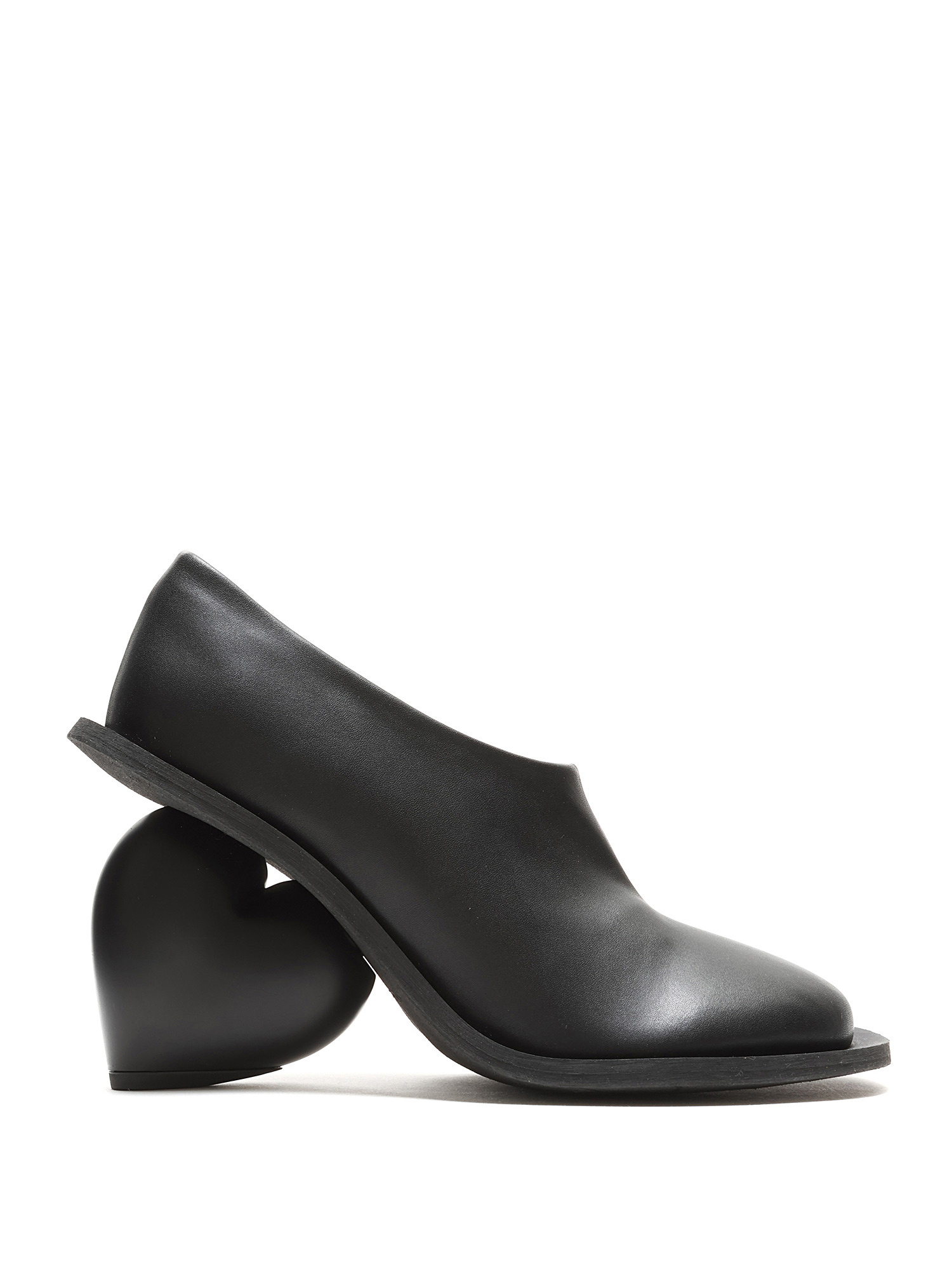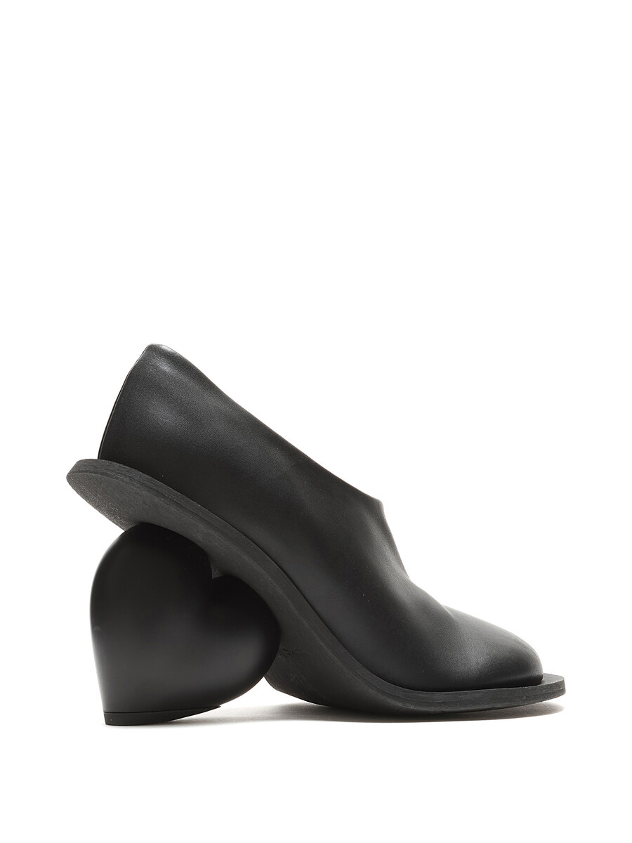 Bottes en cuir grainé noir avec talon en forme de cœur. Style à enfiler avec bout rond fermé et semelle en caoutchouc.