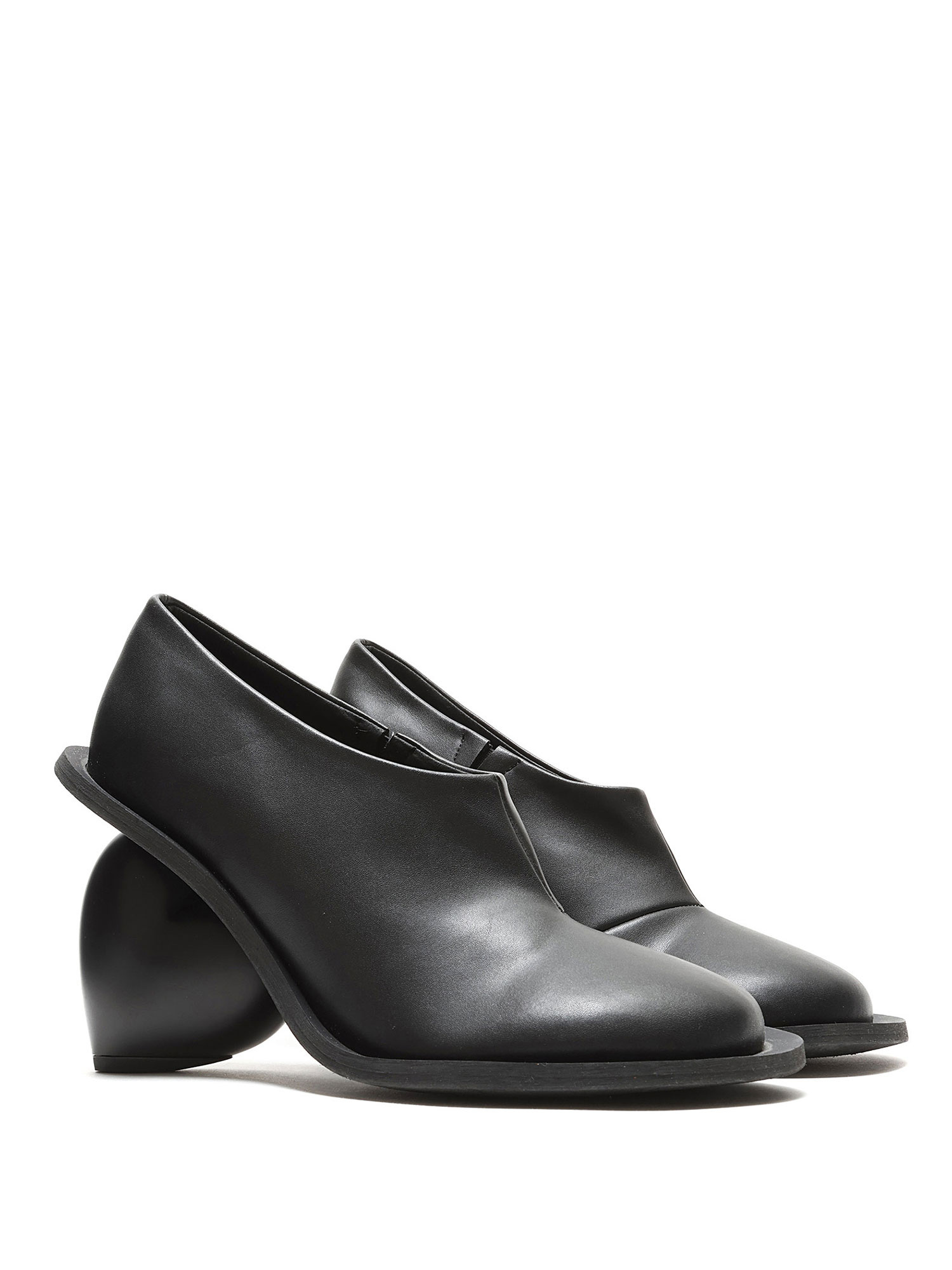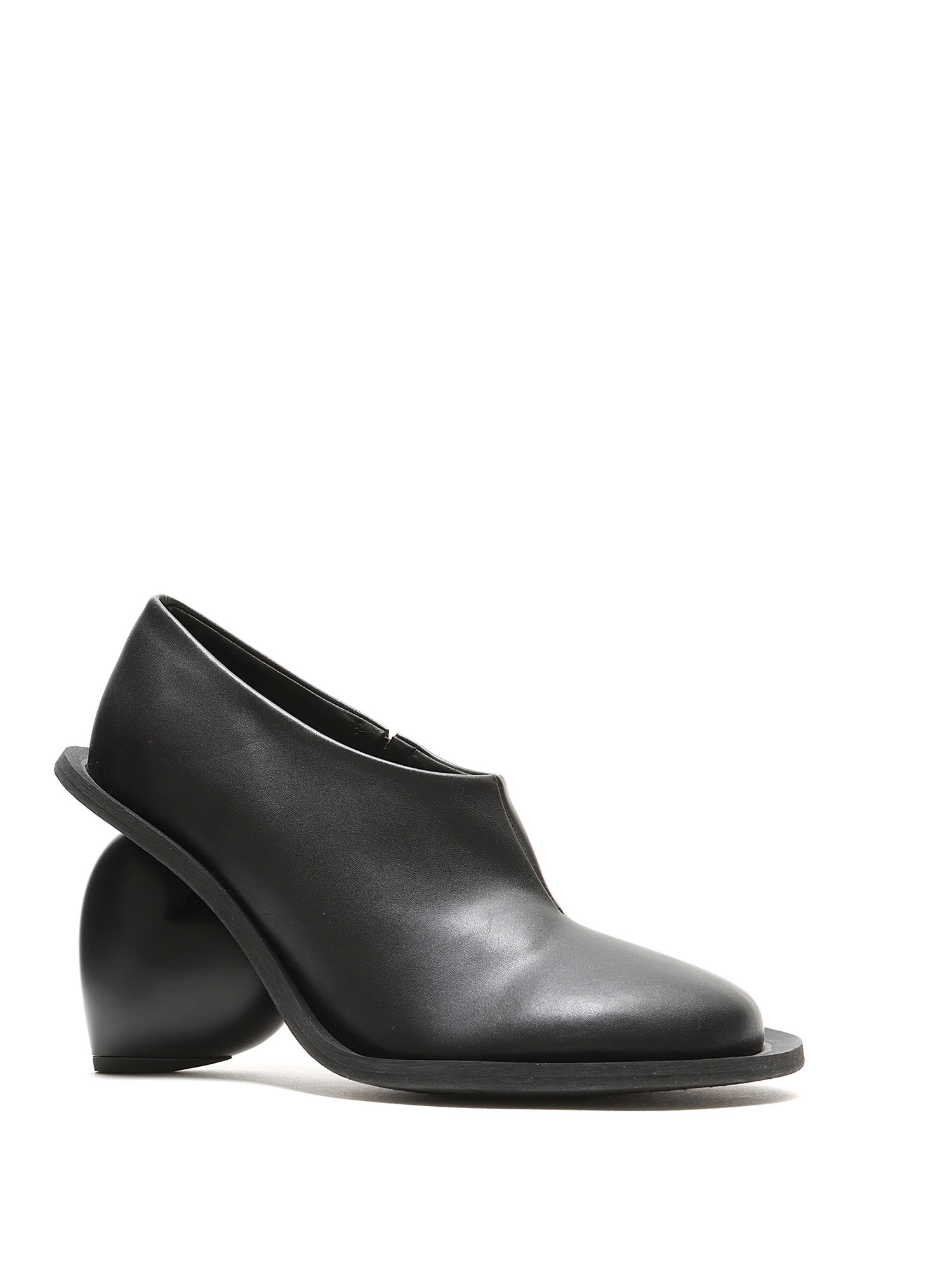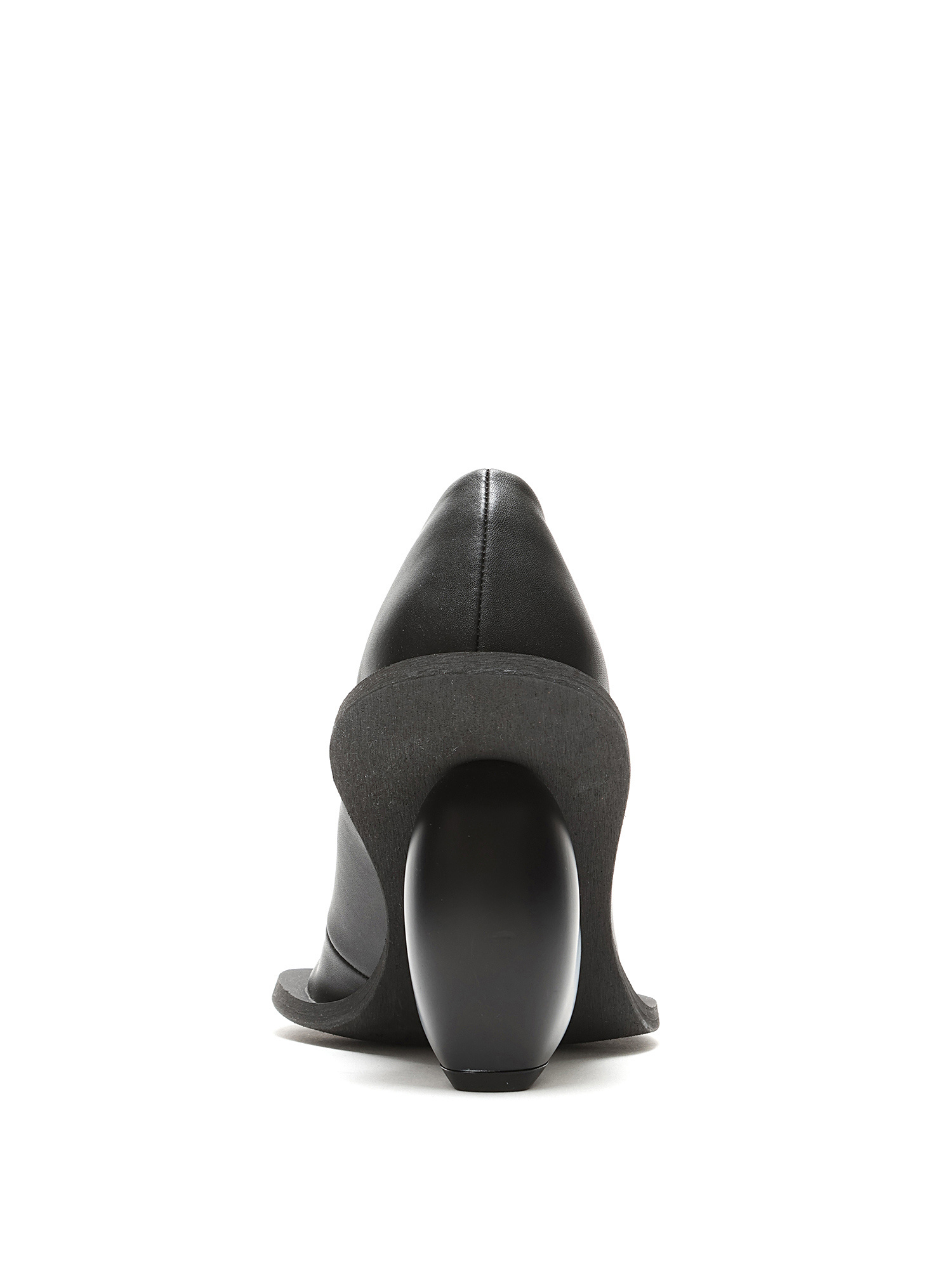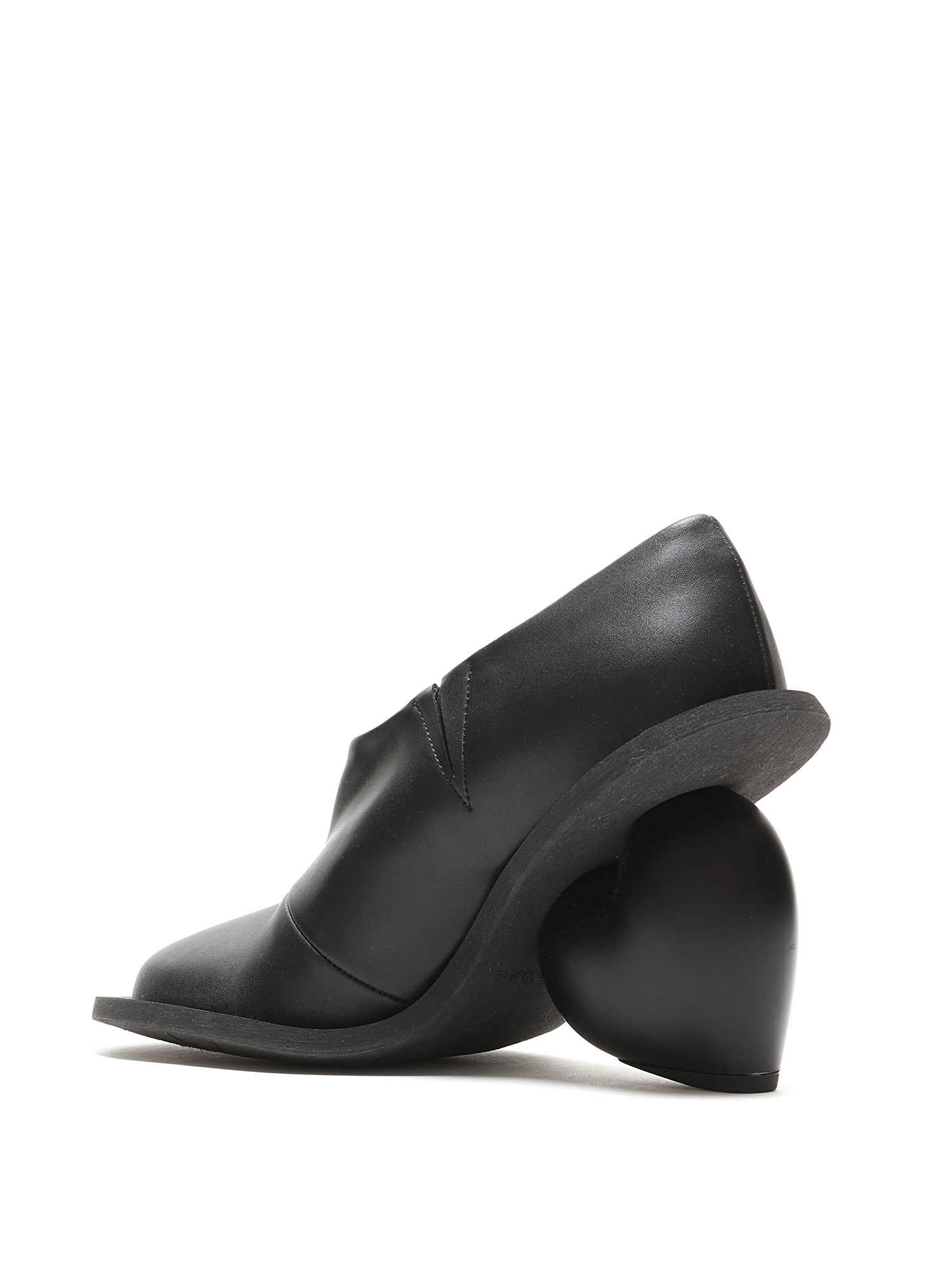 Bottes en cuir grainé noir avec talon en forme de cœur. Style à enfiler avec bout rond fermé et semelle en caoutchouc.