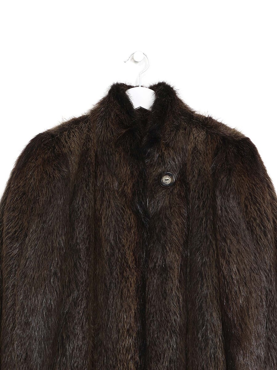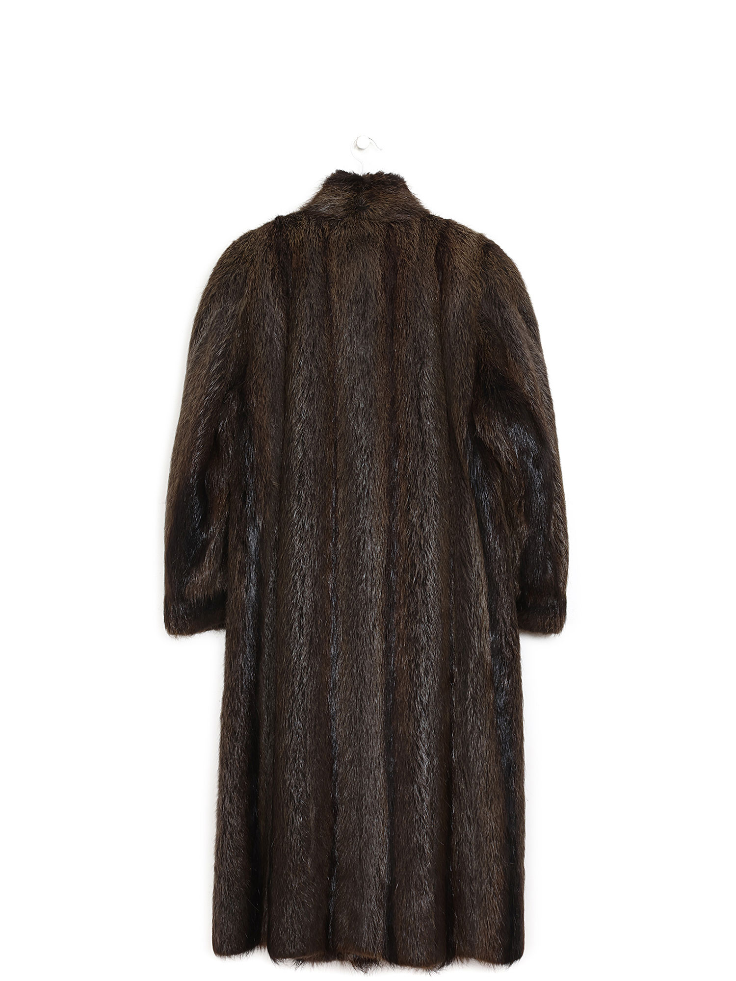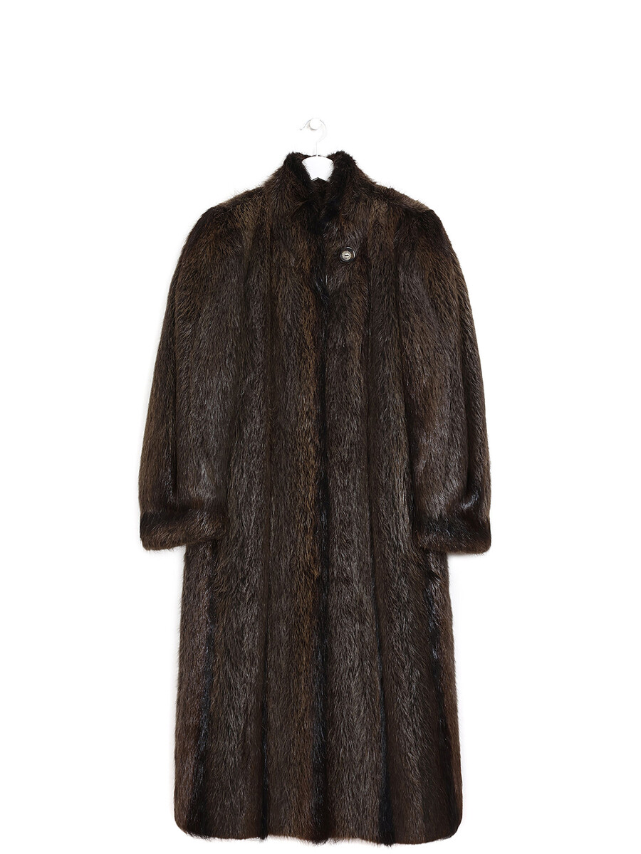 Manteau long en fourrure à fermoir à crochets et bouton. Col montant. Initiales brodées sur la doublure intérieure.