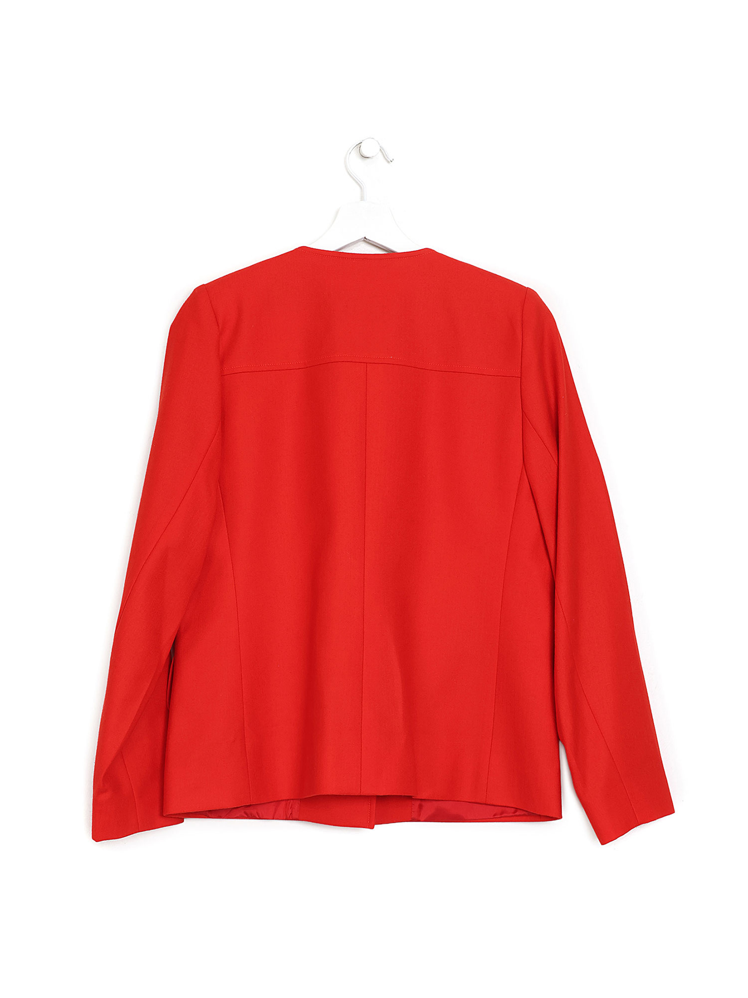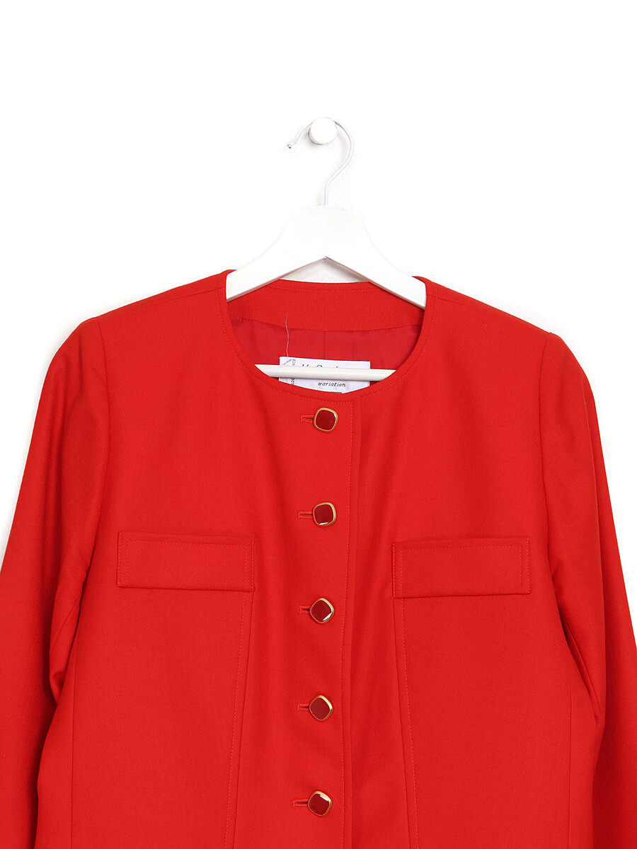 Veste à manches longues en rouge avec fermeture à boutons sur le devant et quatre poches.