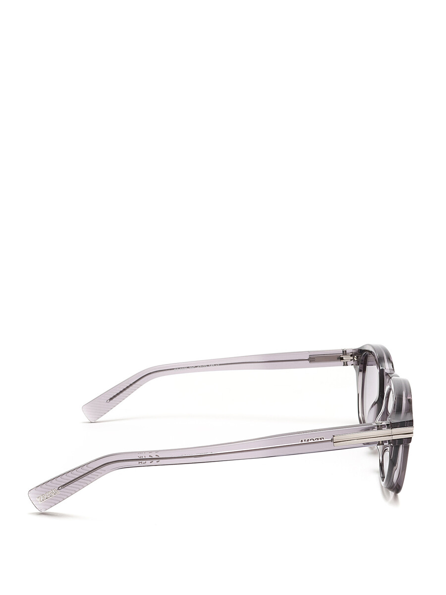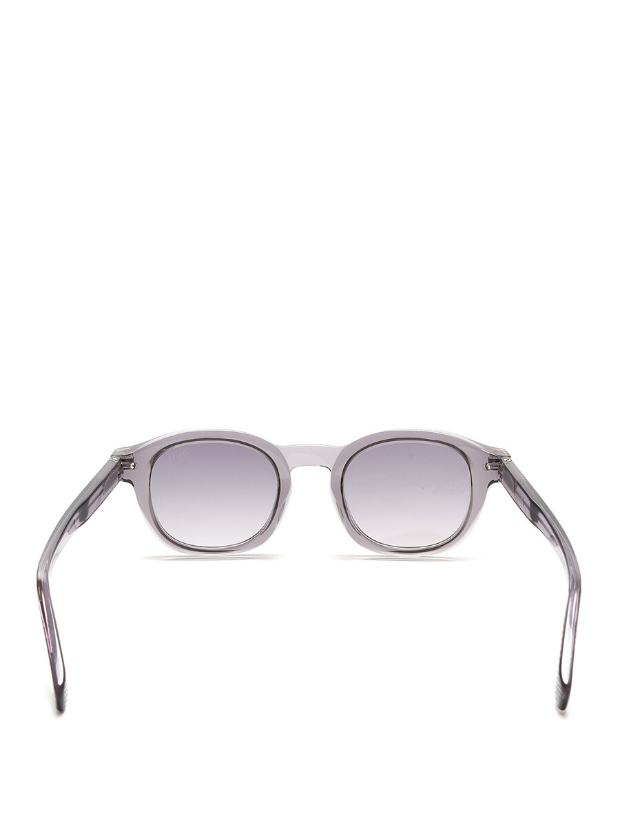 Lunettes de soleil à monture grise transparente. Verres gris. Charnières en métal. Fournies avec un étui de protection. Fabriquées en Italie.