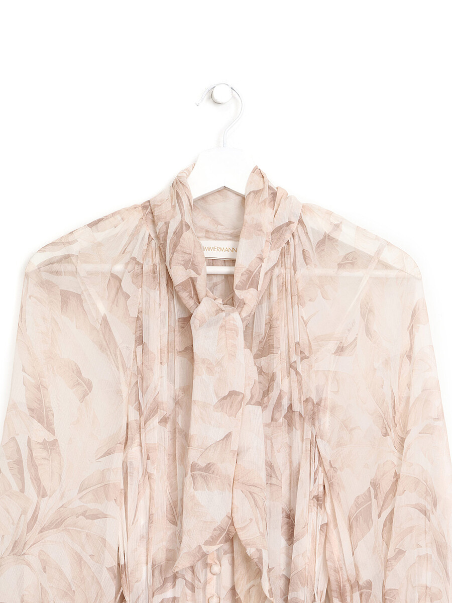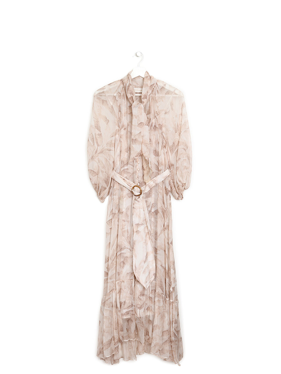 Robe en soie. avec une doublure. Manches longues avec motif abstrait. Fermeture à ceinture avec effet bamboo.