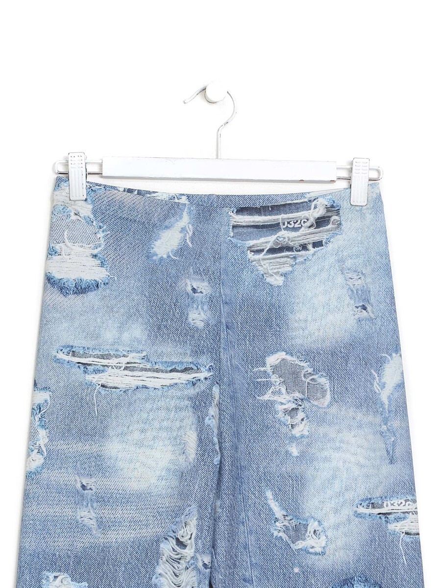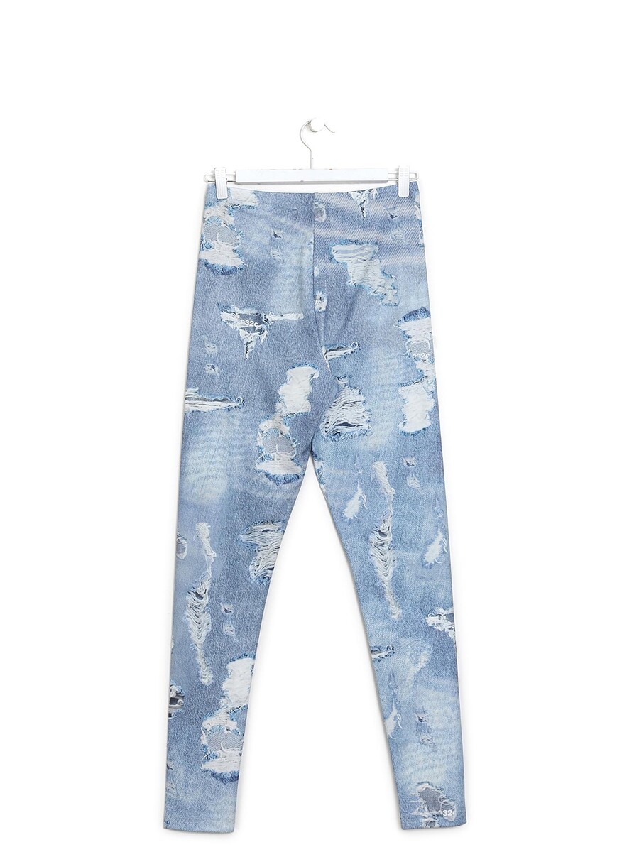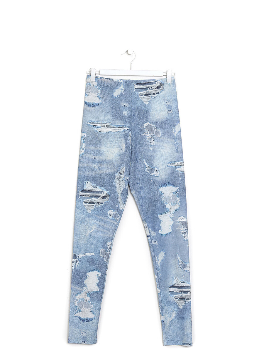 Stretch leggings in a distressed denim print. Logo detailing throughout. Elasticized waistband.