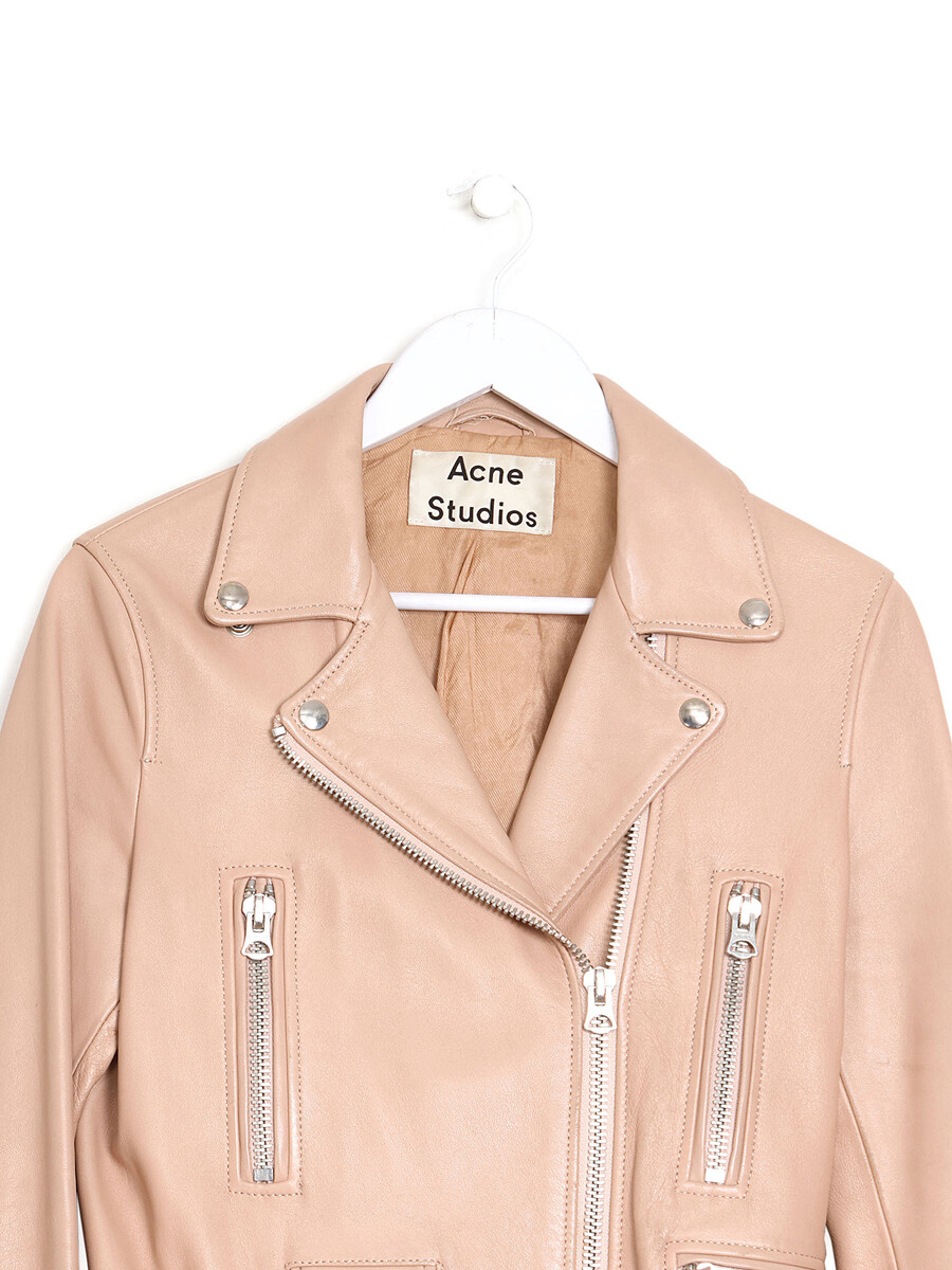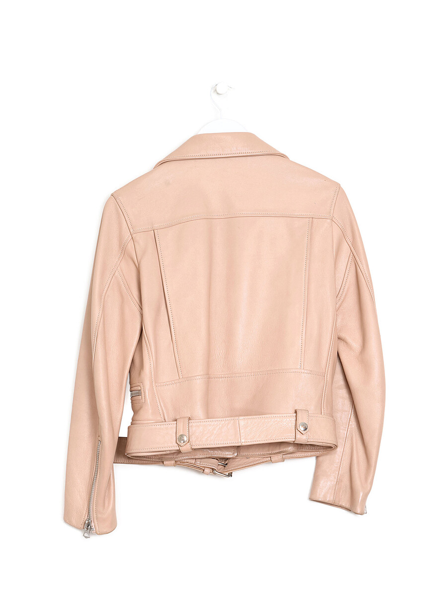 Grained lamb leather biker jacket in pale pink. Asymmetrical front zip closure. Zippered pockets. Belt loops for adjustable fit.