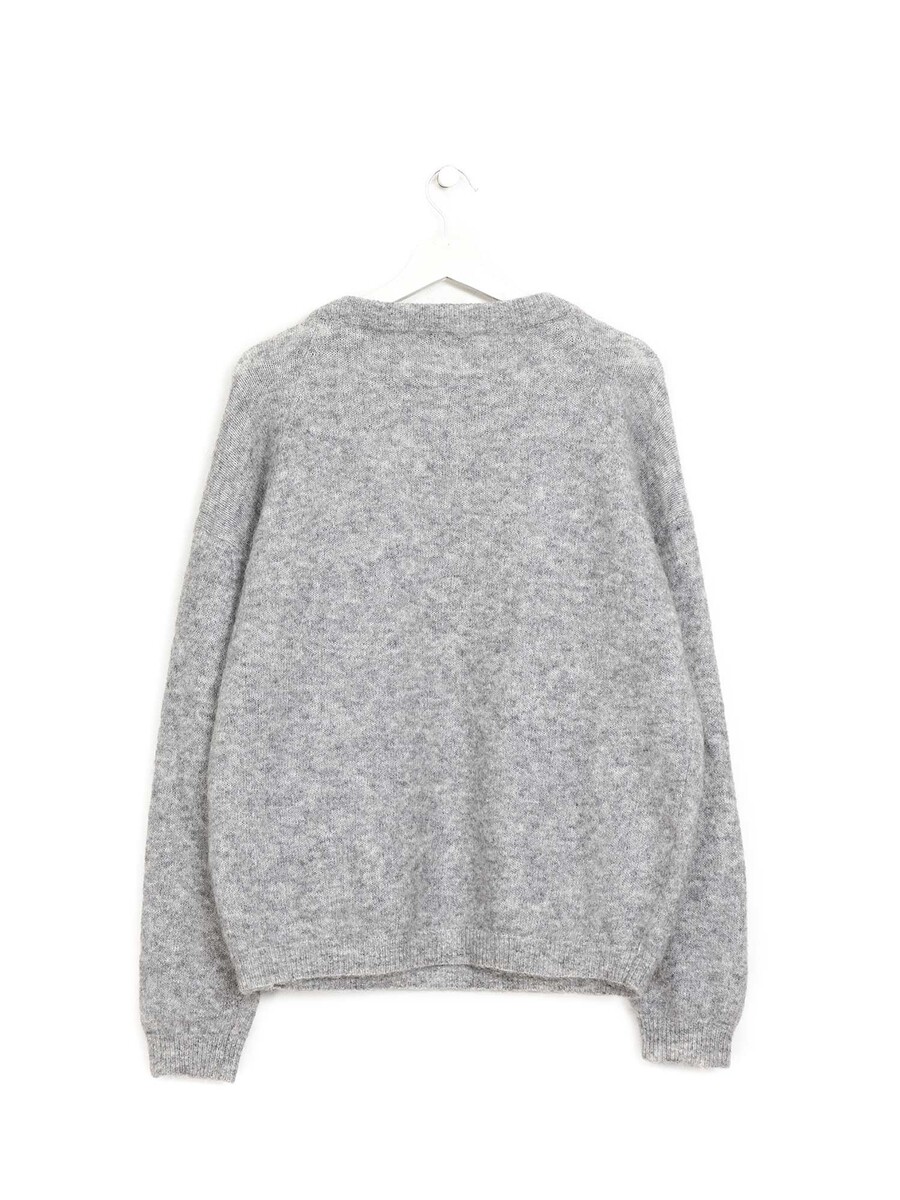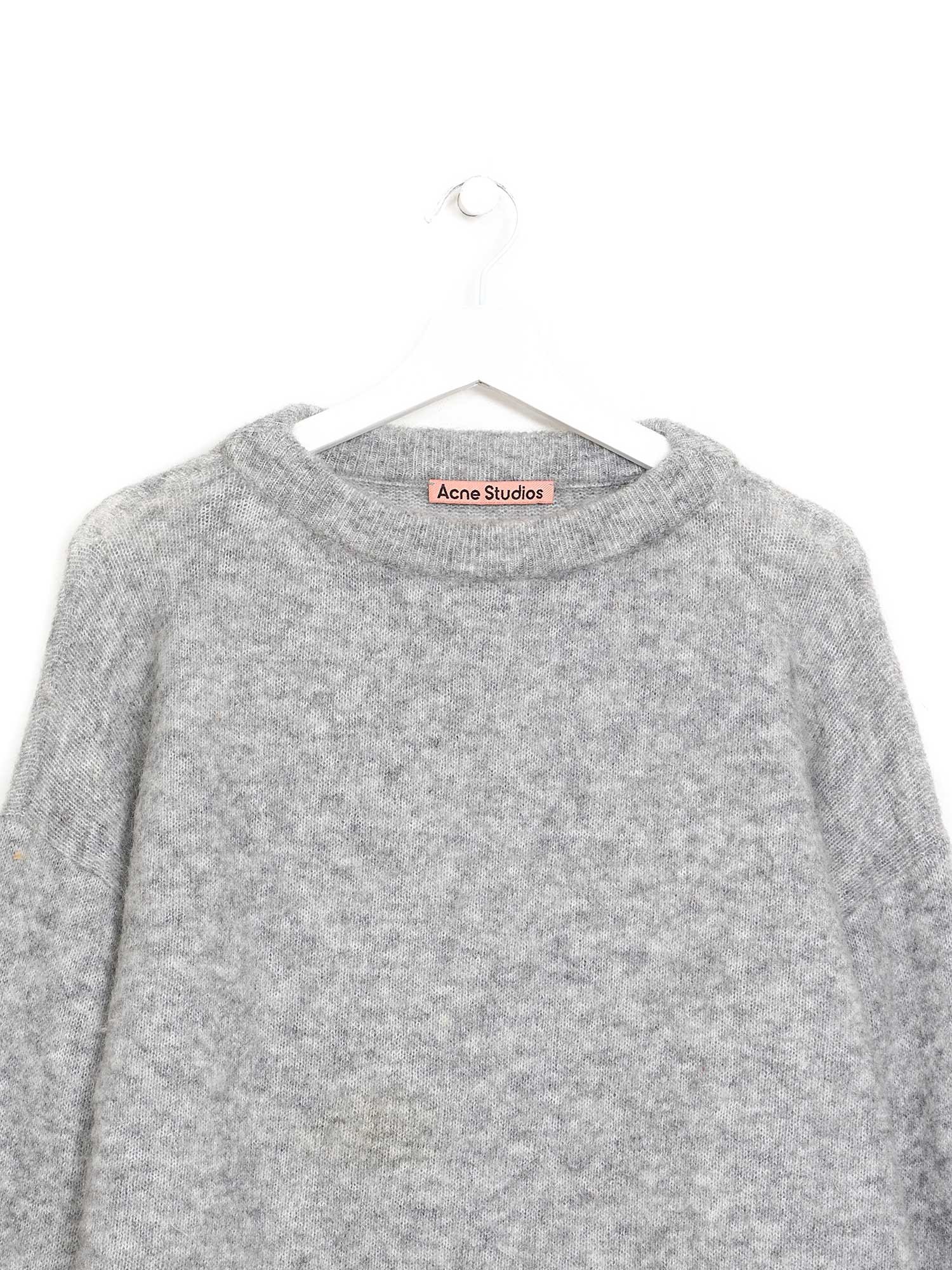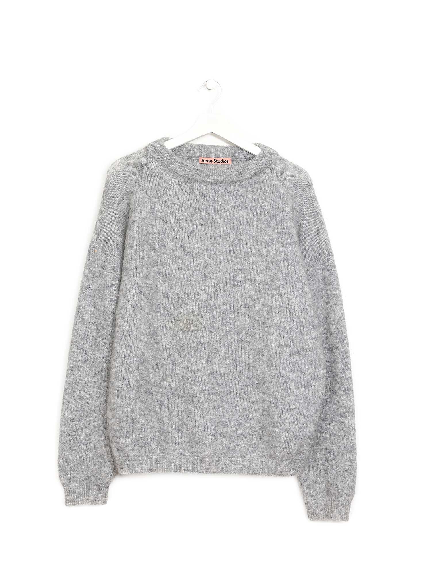 Gray knit fuzzy sweater with long sleeves and a crew neckline. Soft and cozy feel, showcasing a chic, relaxed fit.
