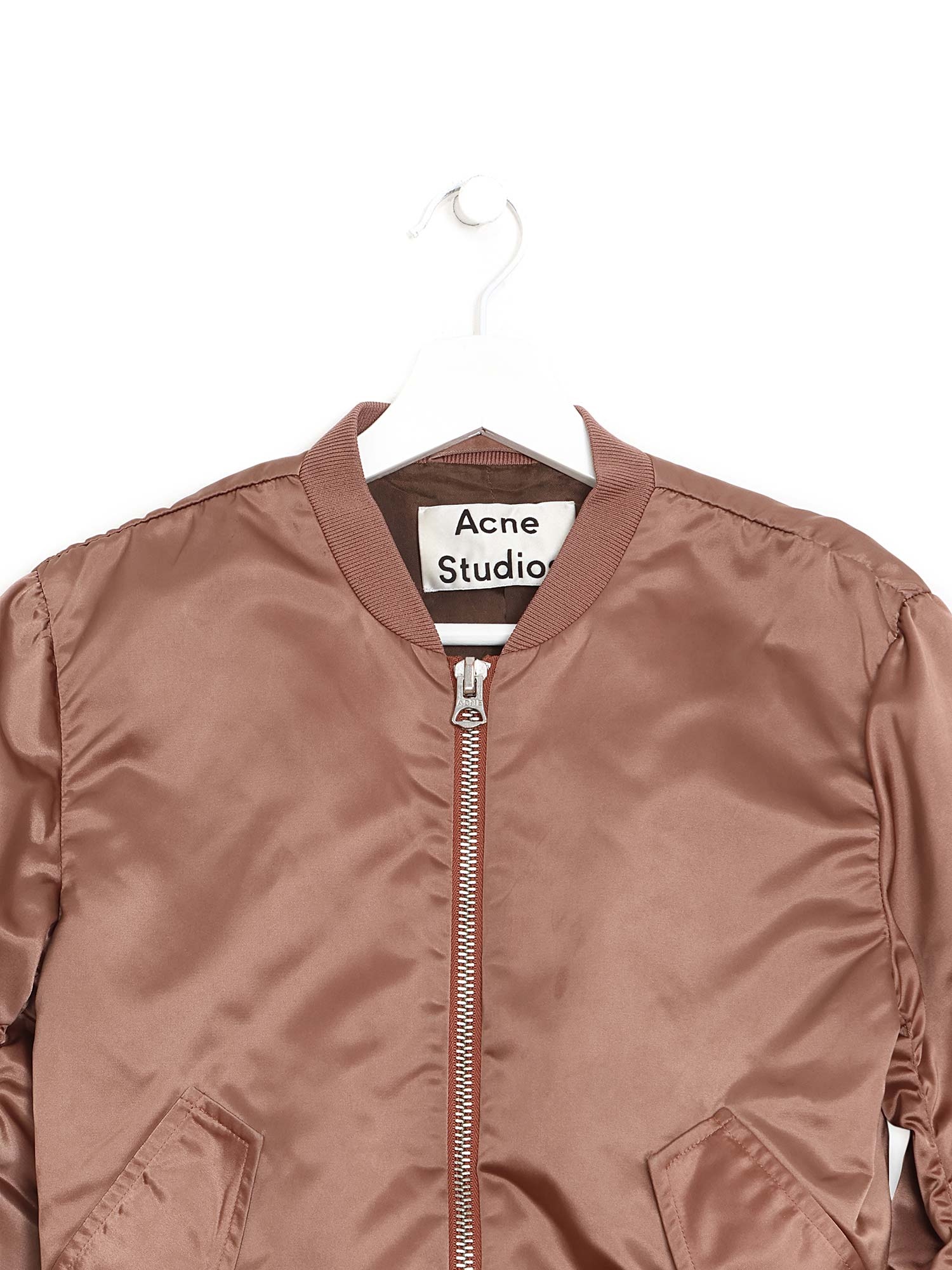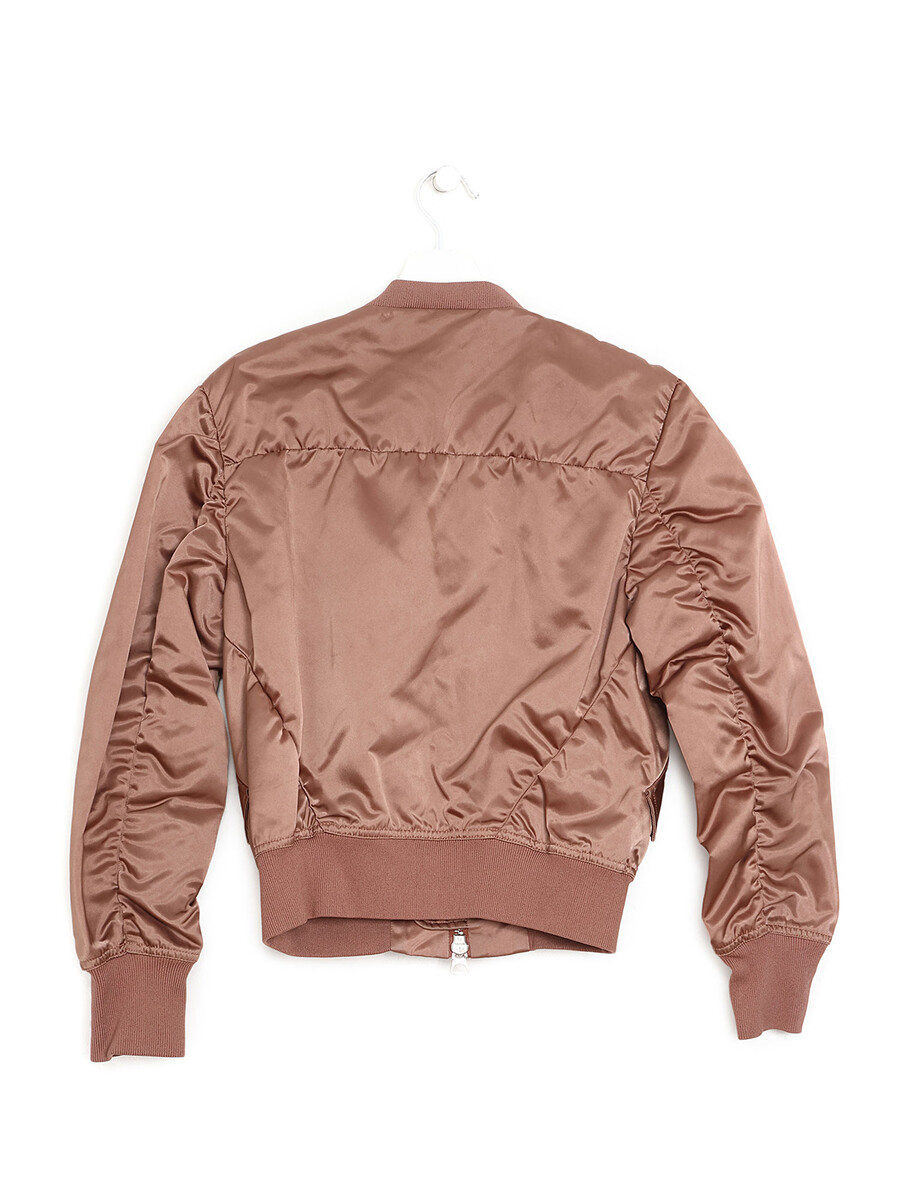 Pink bomber jacket. Zip closure. Ribbed collar. Front flap pockets.
