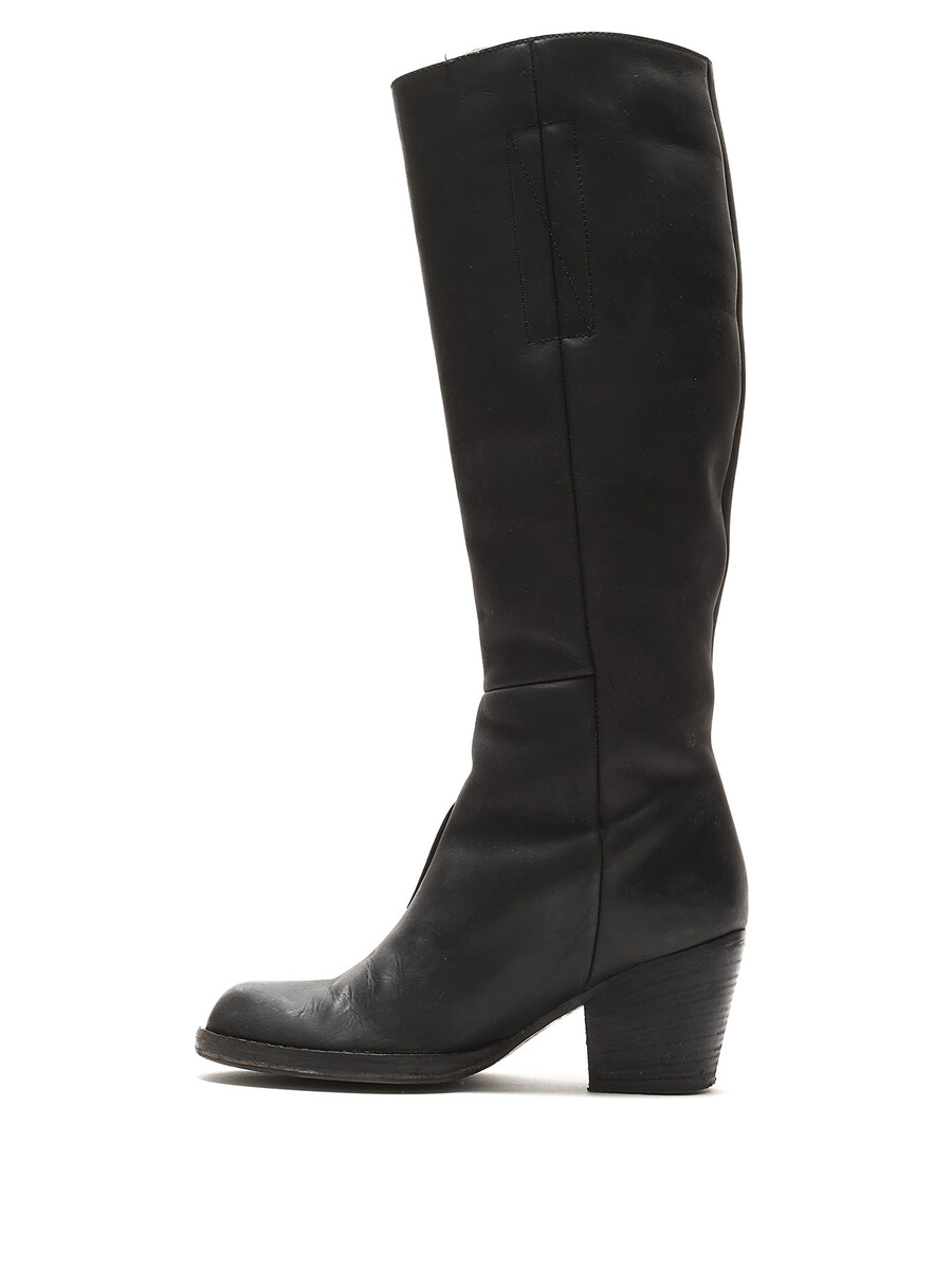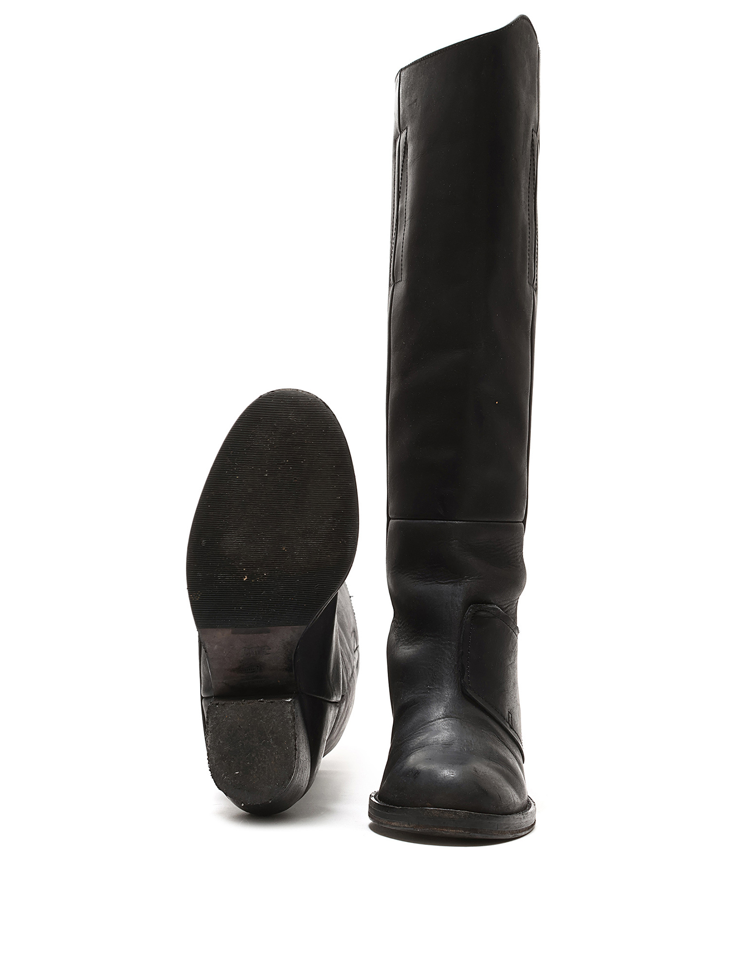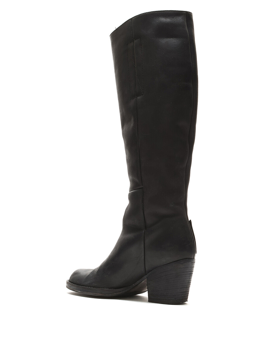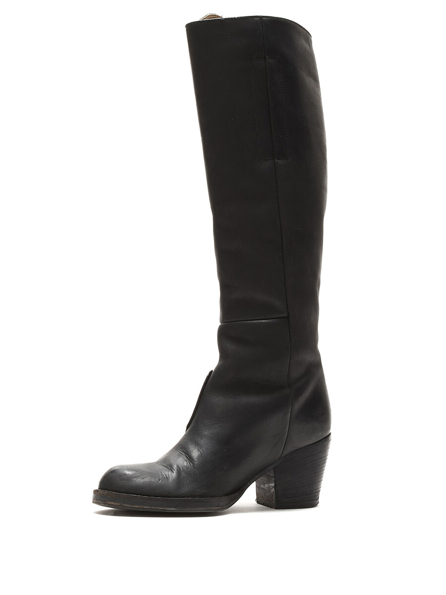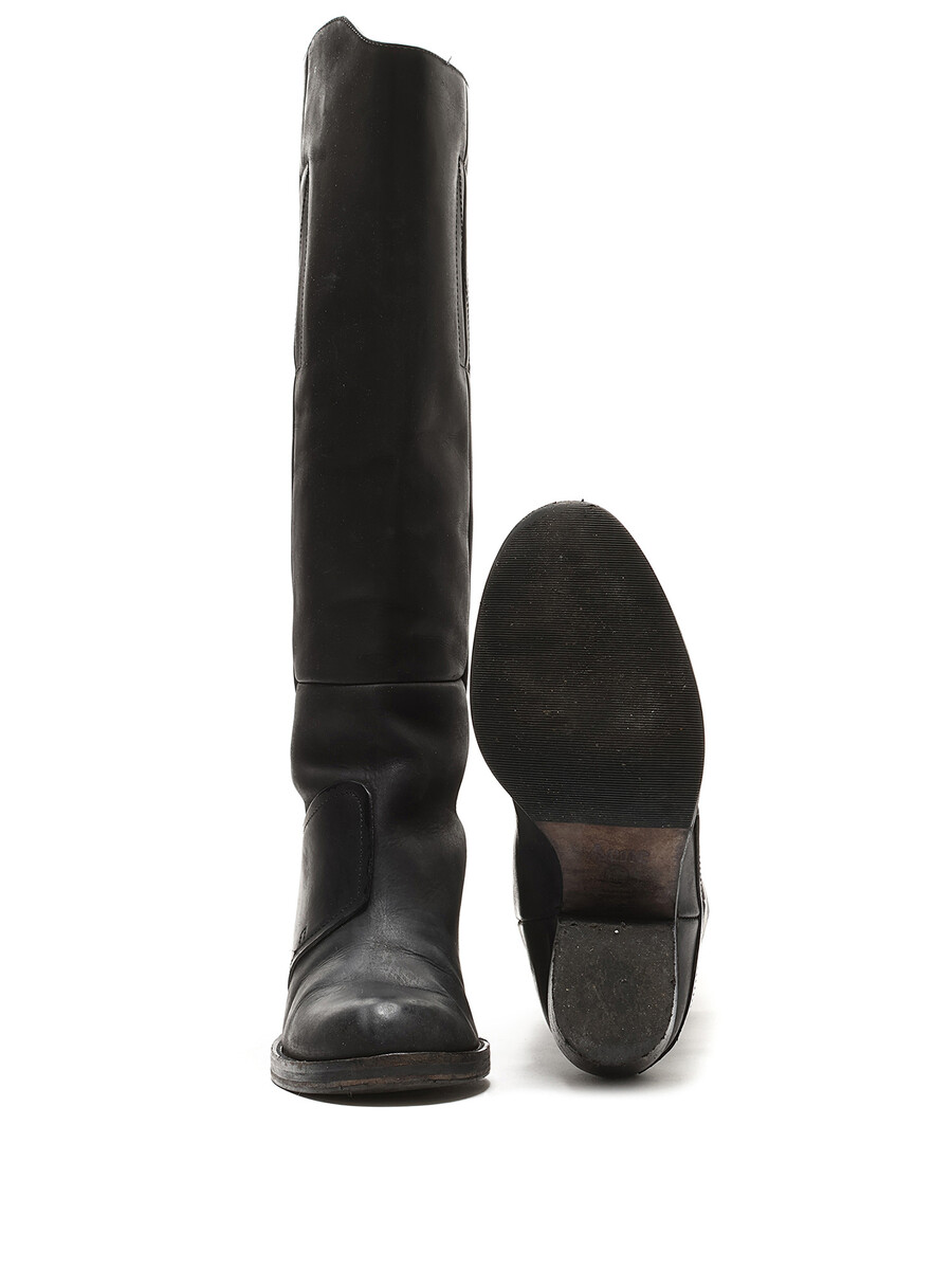 Grained leather knee-high boots in black. Zipper closure at the side. Round toe design. Made in Italy. Resoled with visible signs of wear and creases at leather.