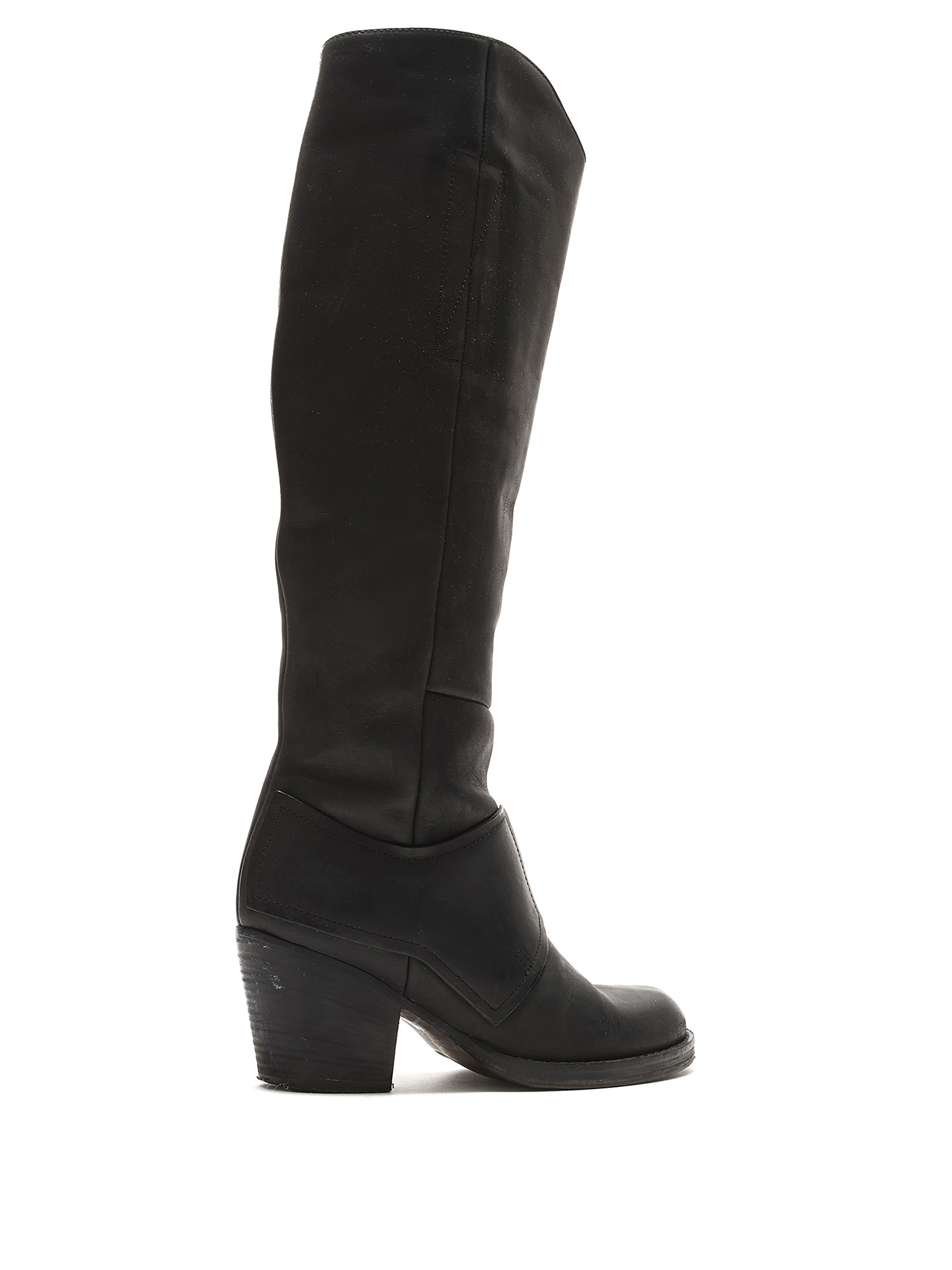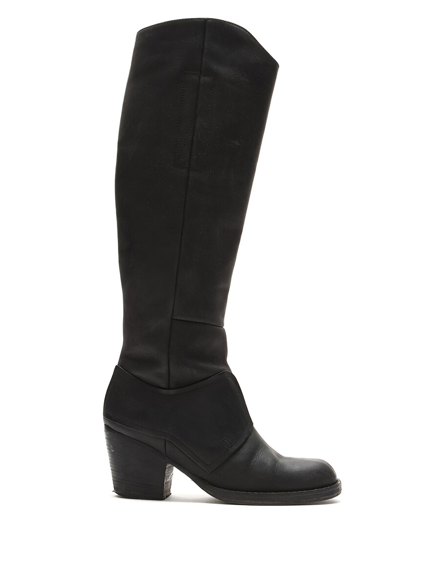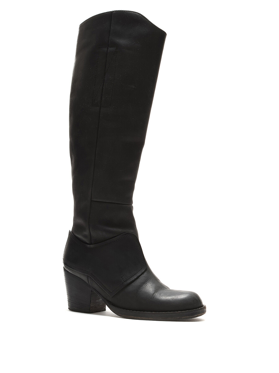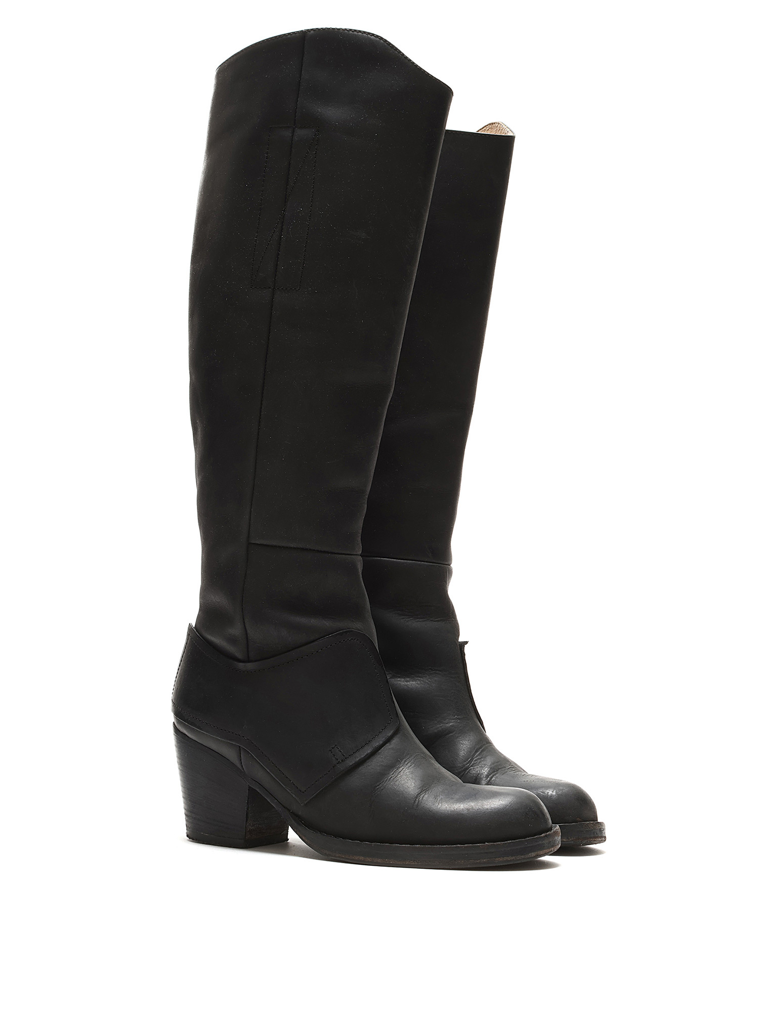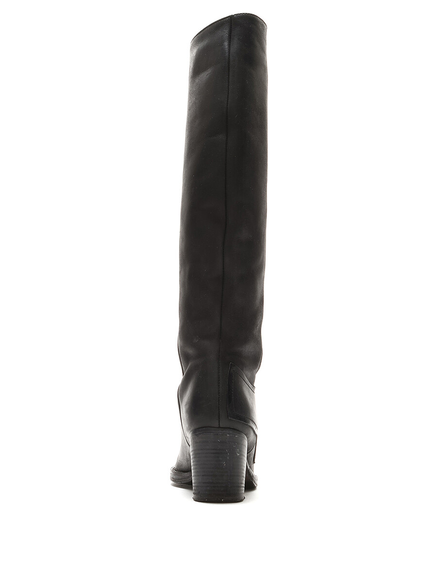 Grained leather knee-high boots in black. Zipper closure at the side. Round toe design. Made in Italy. Resoled with visible signs of wear and creases at leather.