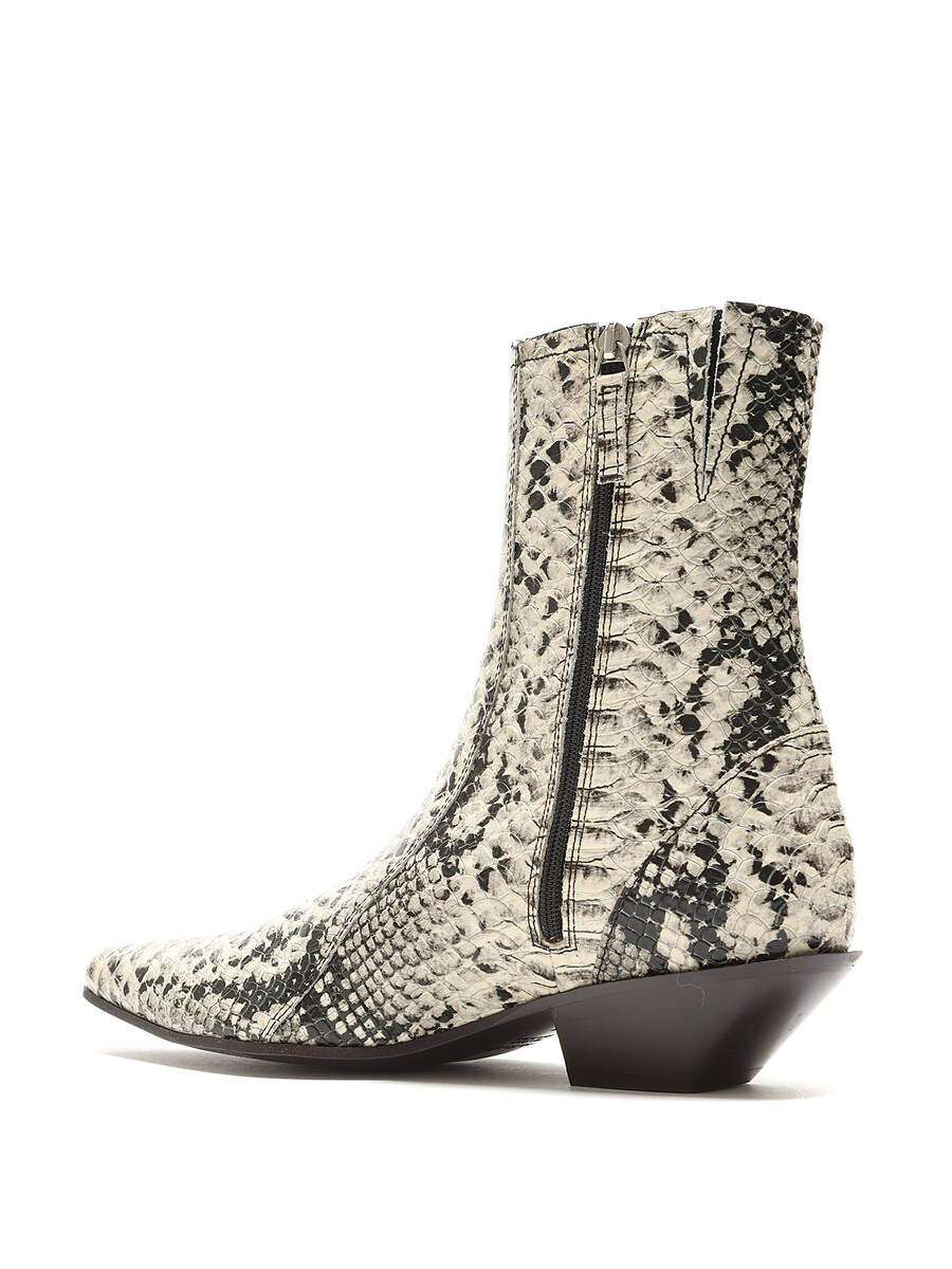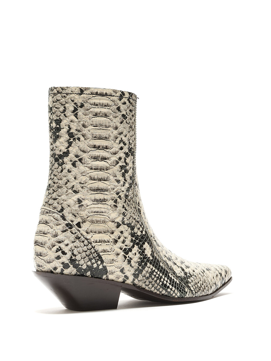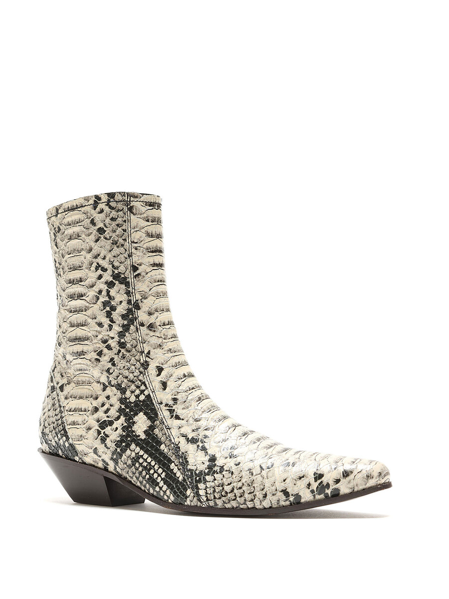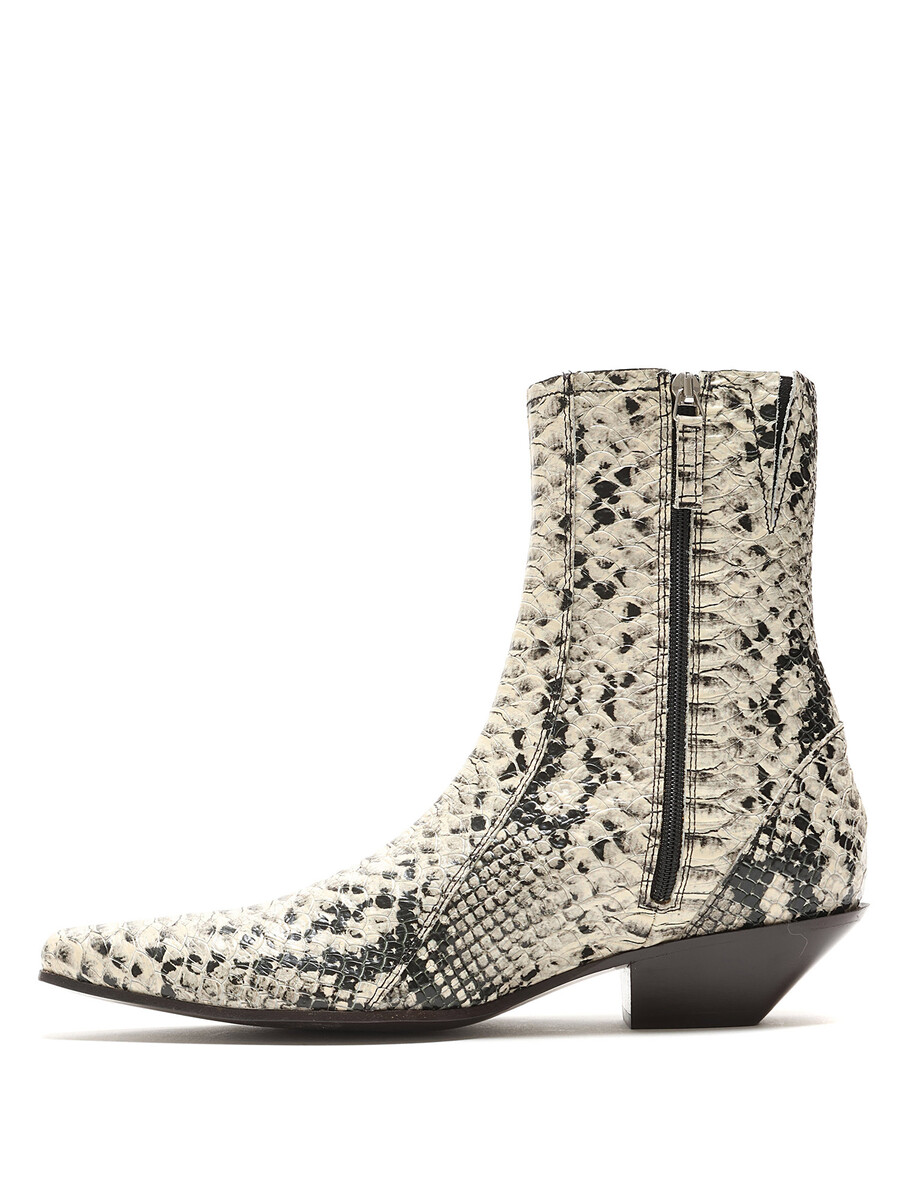Leather ankle boots with a snake print pattern in grey and black. Hidden side zipper closure. Pointed toe. Leather sole.