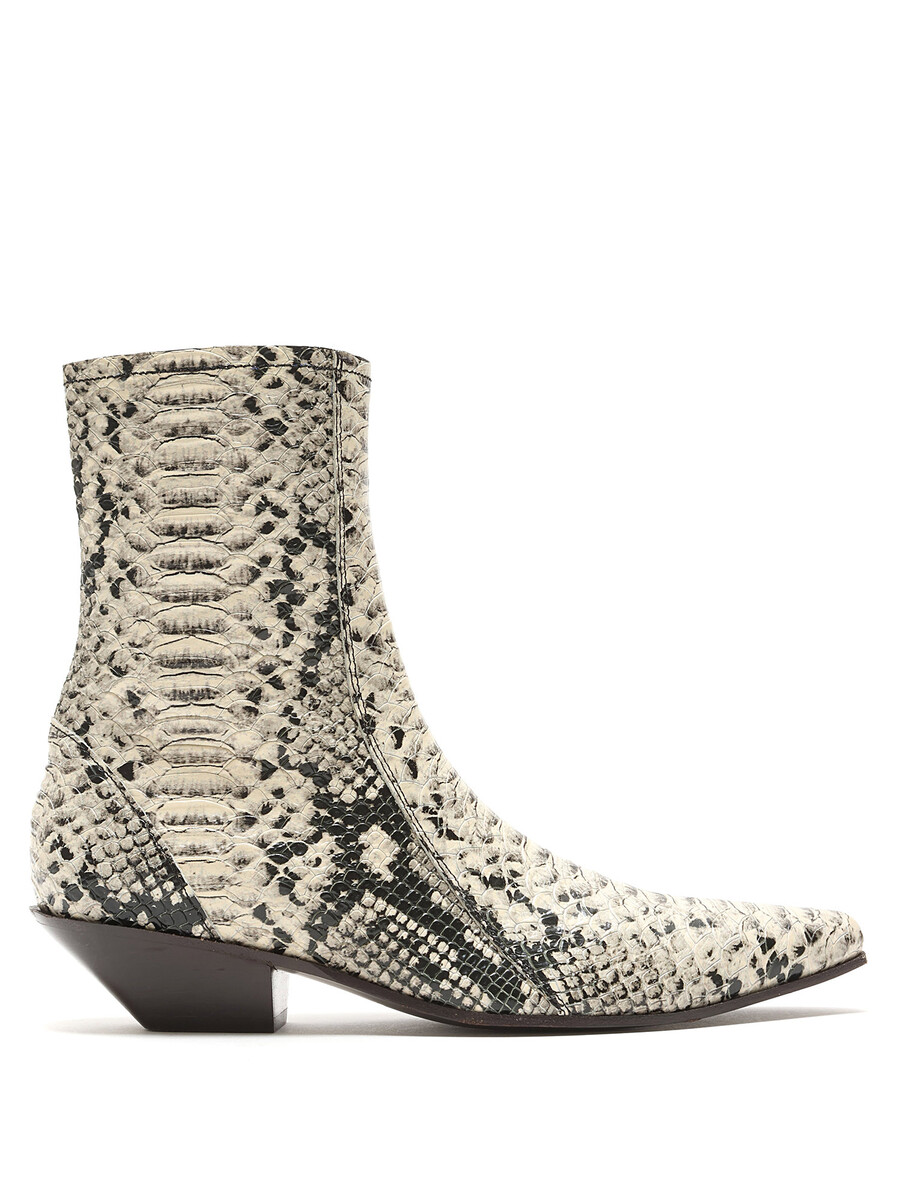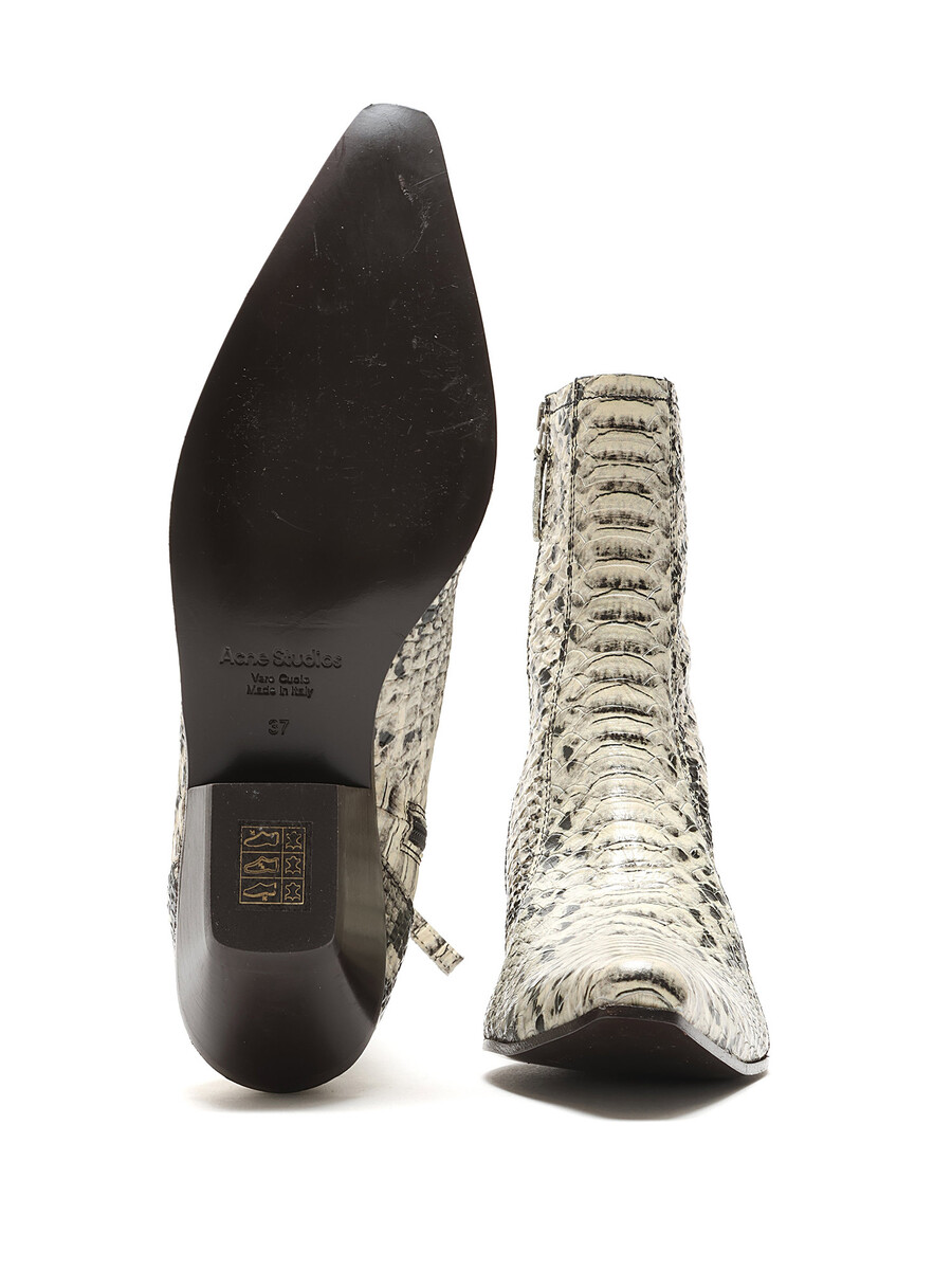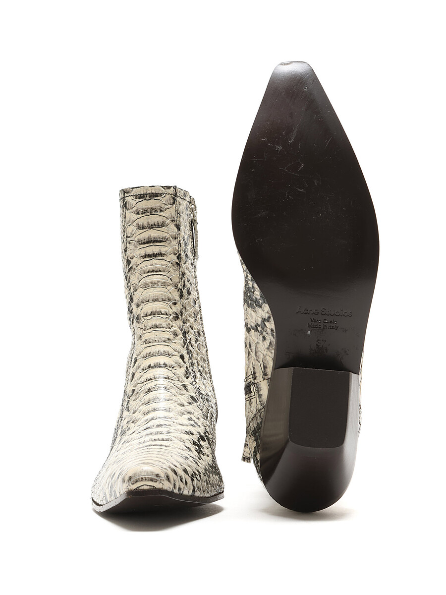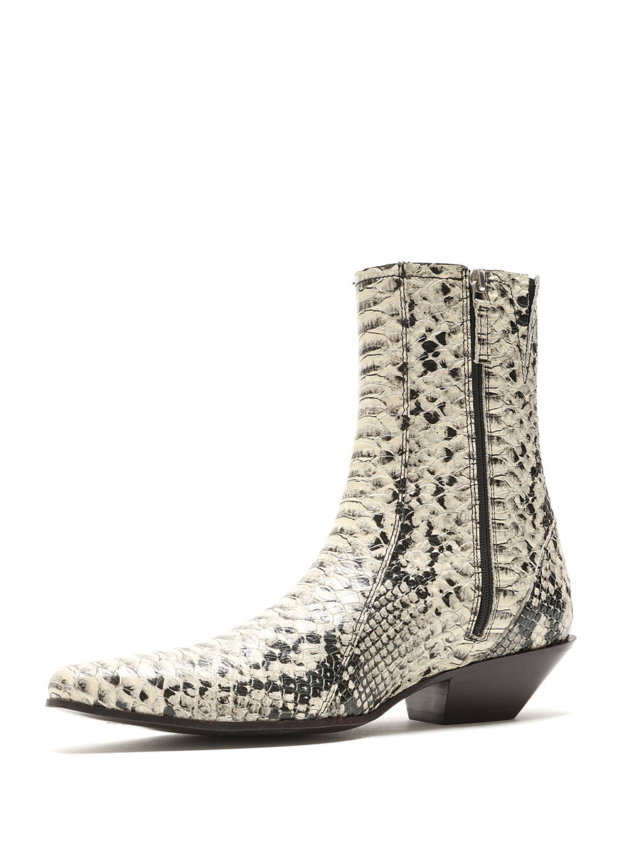 Leather ankle boots with a snake print pattern in grey and black. Hidden side zipper closure. Pointed toe. Leather sole.