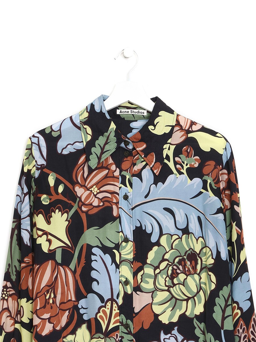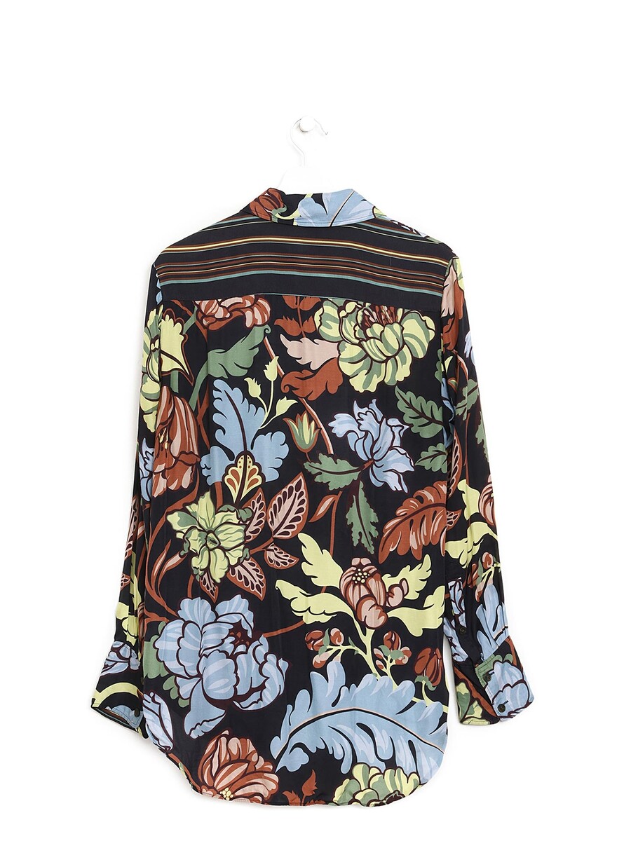 Floral pattern long sleeve shirt featuring shades of black, blue, yellow, green, and blue. Pointed collar with front button closure.