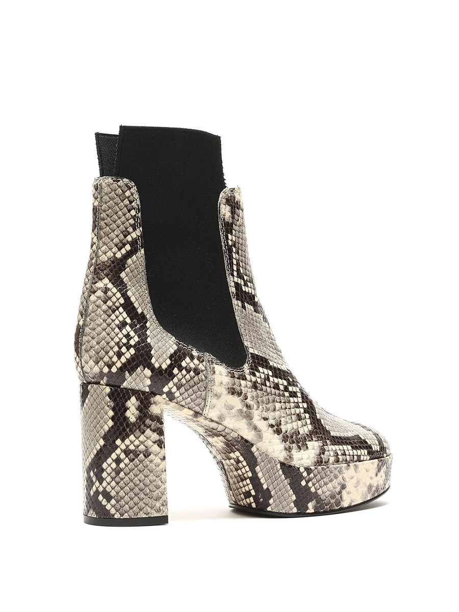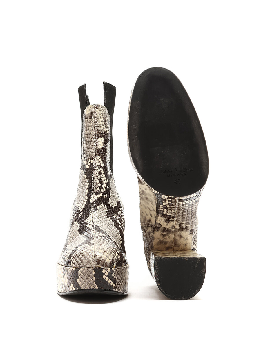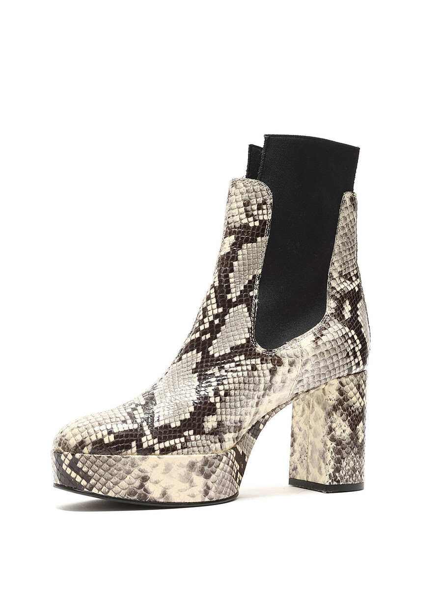 Synthetic ankle boots featuring a snake print design in black and beige tones. Slip-on style with a round toe and rubber sole. Comes with a dustbag.