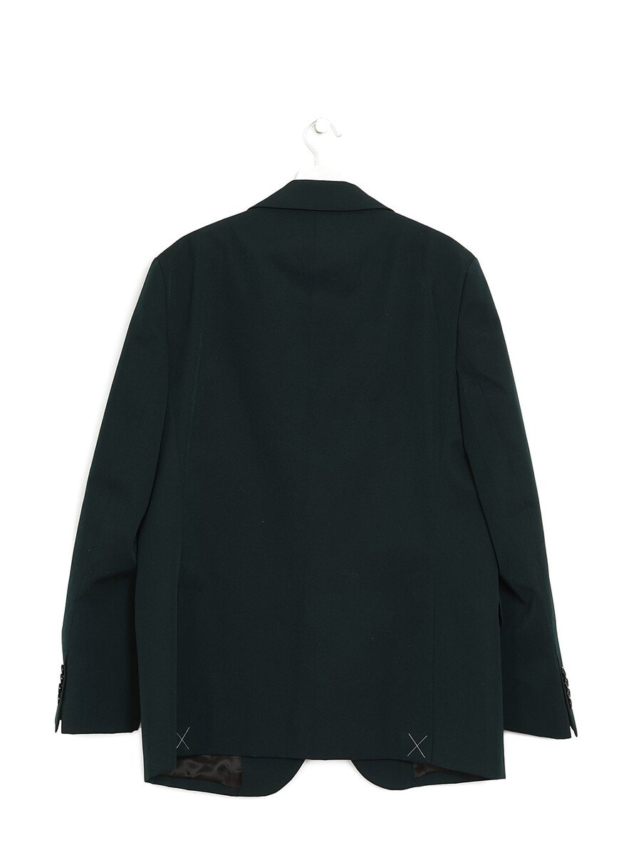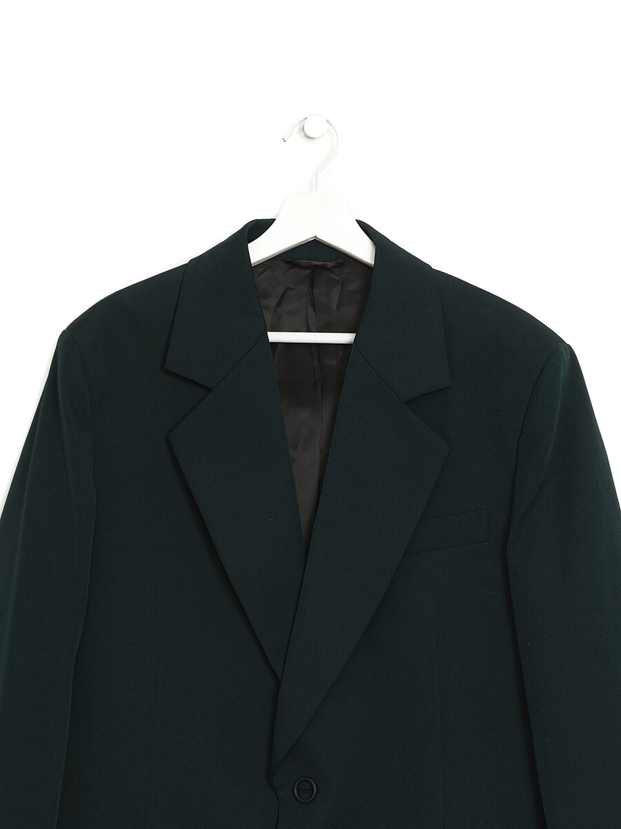 Dark green long sleeve jacket with notch lapel collar. Features welt pockets at front.