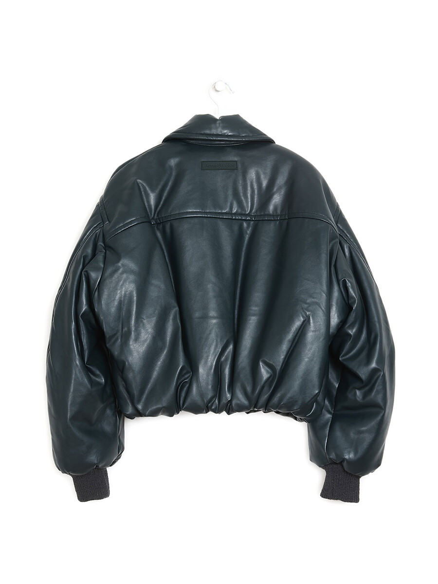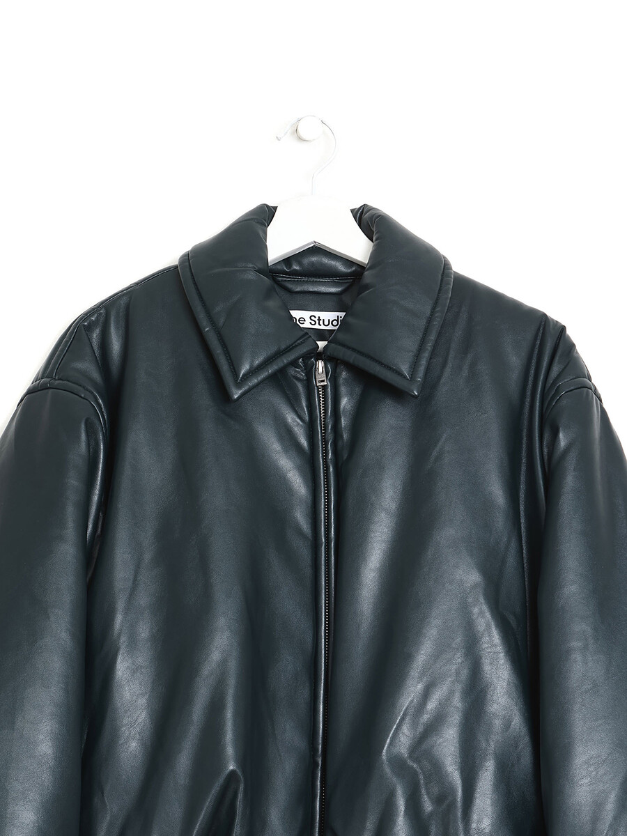 Long sleeve faux leather jacket in dark green with a sleek finish. Features a front zipper closure and practical side pockets.