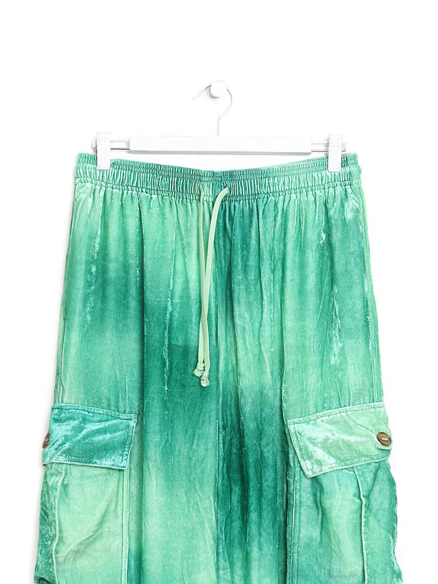 Wide leg cargo sweatpants in green. Adjustable drawstring at the waist. Relaxed fit with utility pockets on the sides.