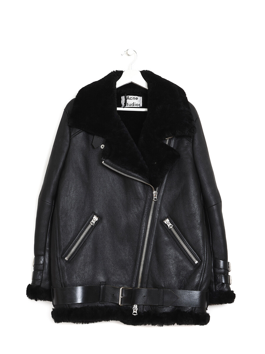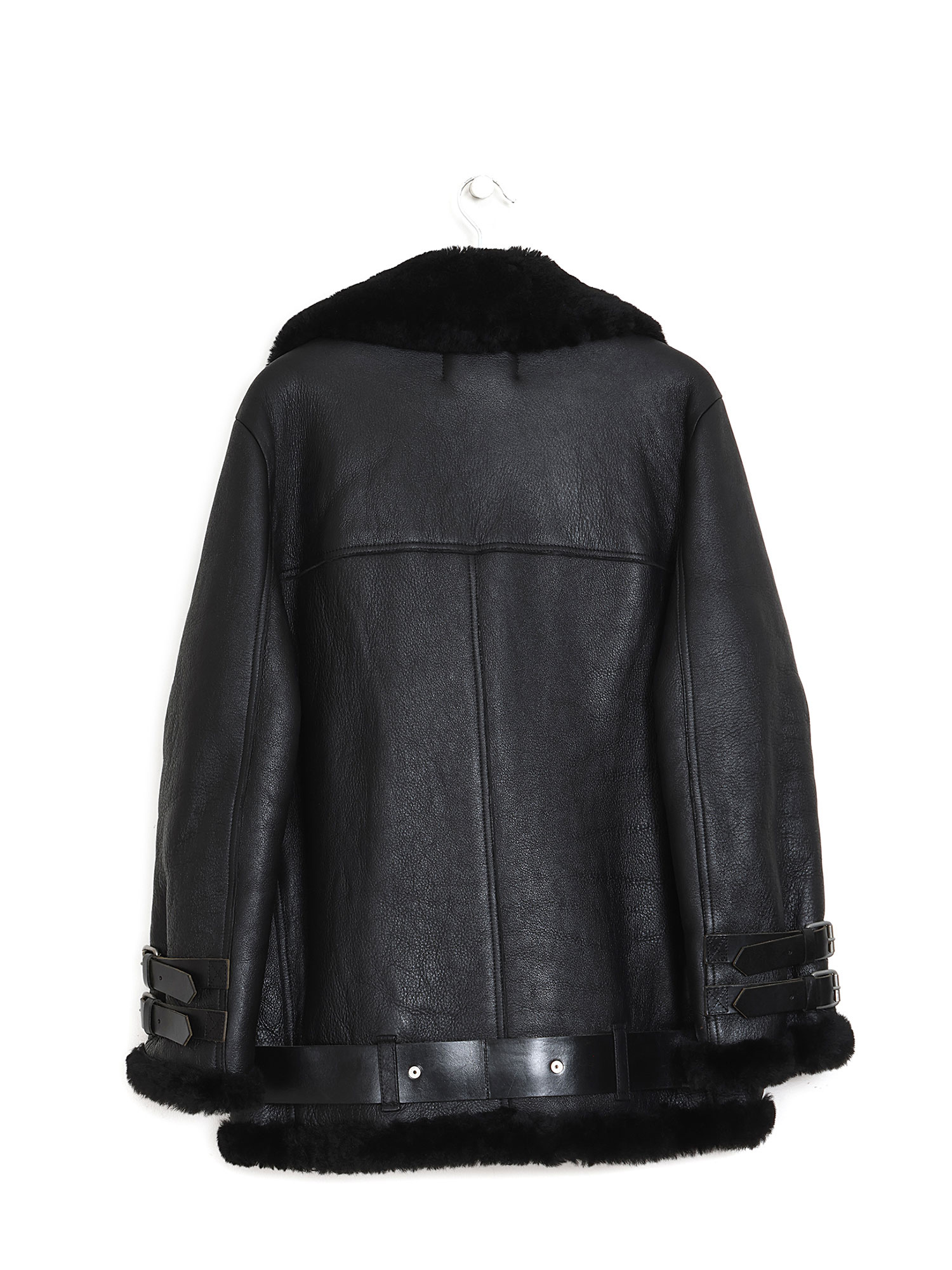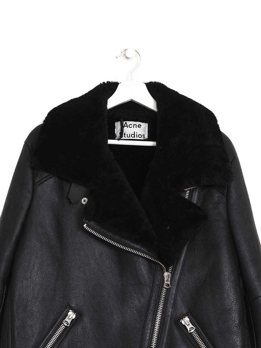 Velocite shearling jacket in black. Featuring a classic lapel collar, zip-up closure, and multiple zippered pockets.