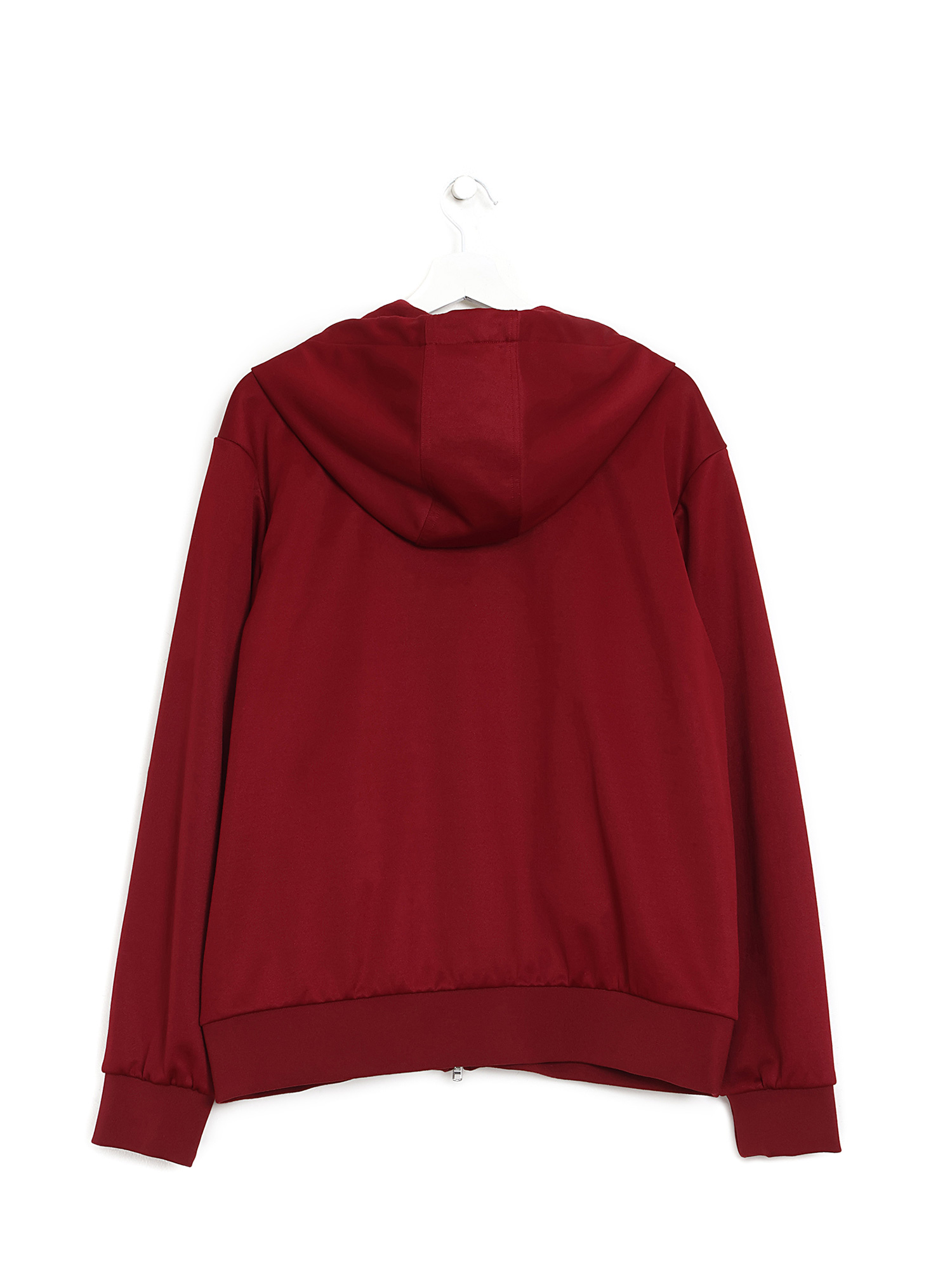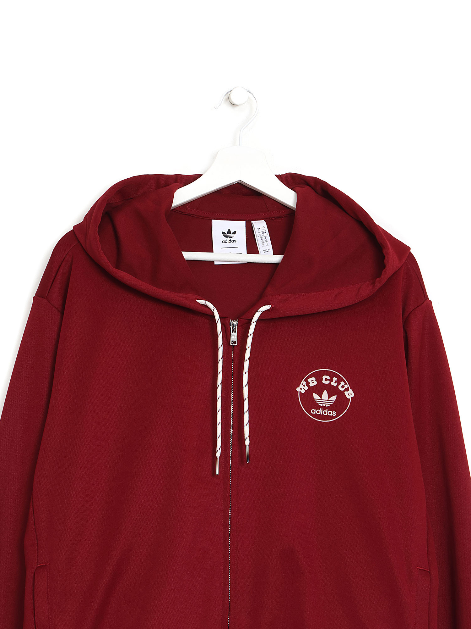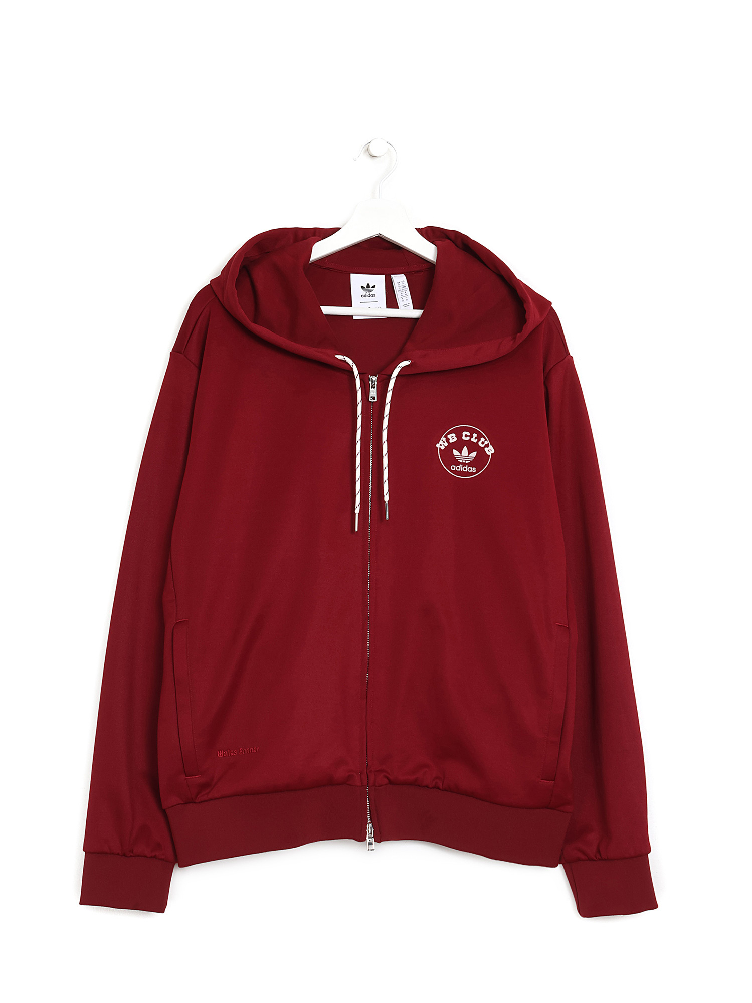 Bordeaux zip-up hoodie with the iconic three stripes on the sleeves. Designed in collaboration with Wales Bonner.