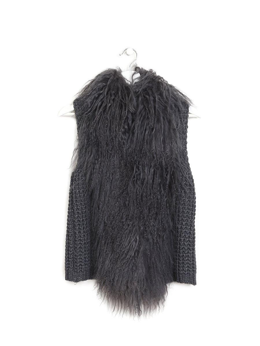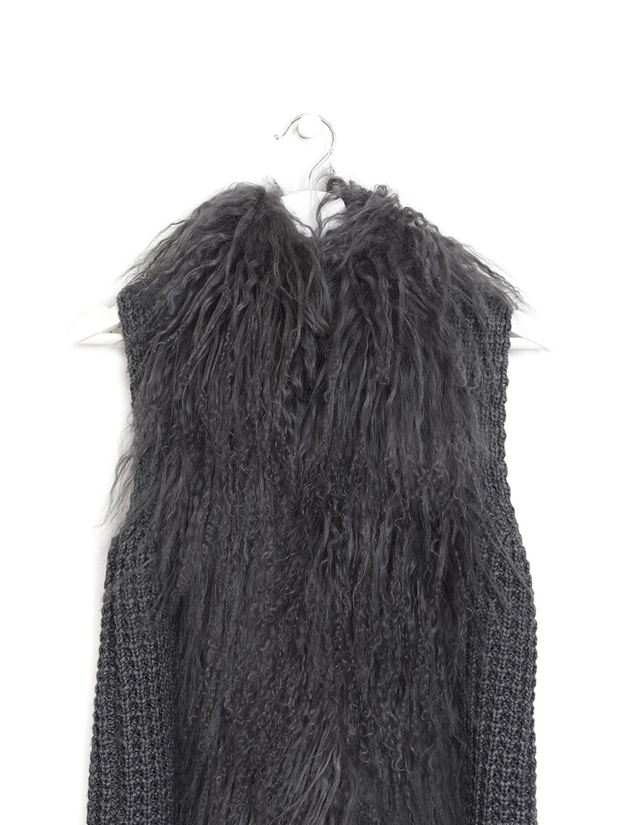 Sleeveless cashmere-blend vest in grey, featuring Mongolian lamb trim. Soft and luxurious feel.