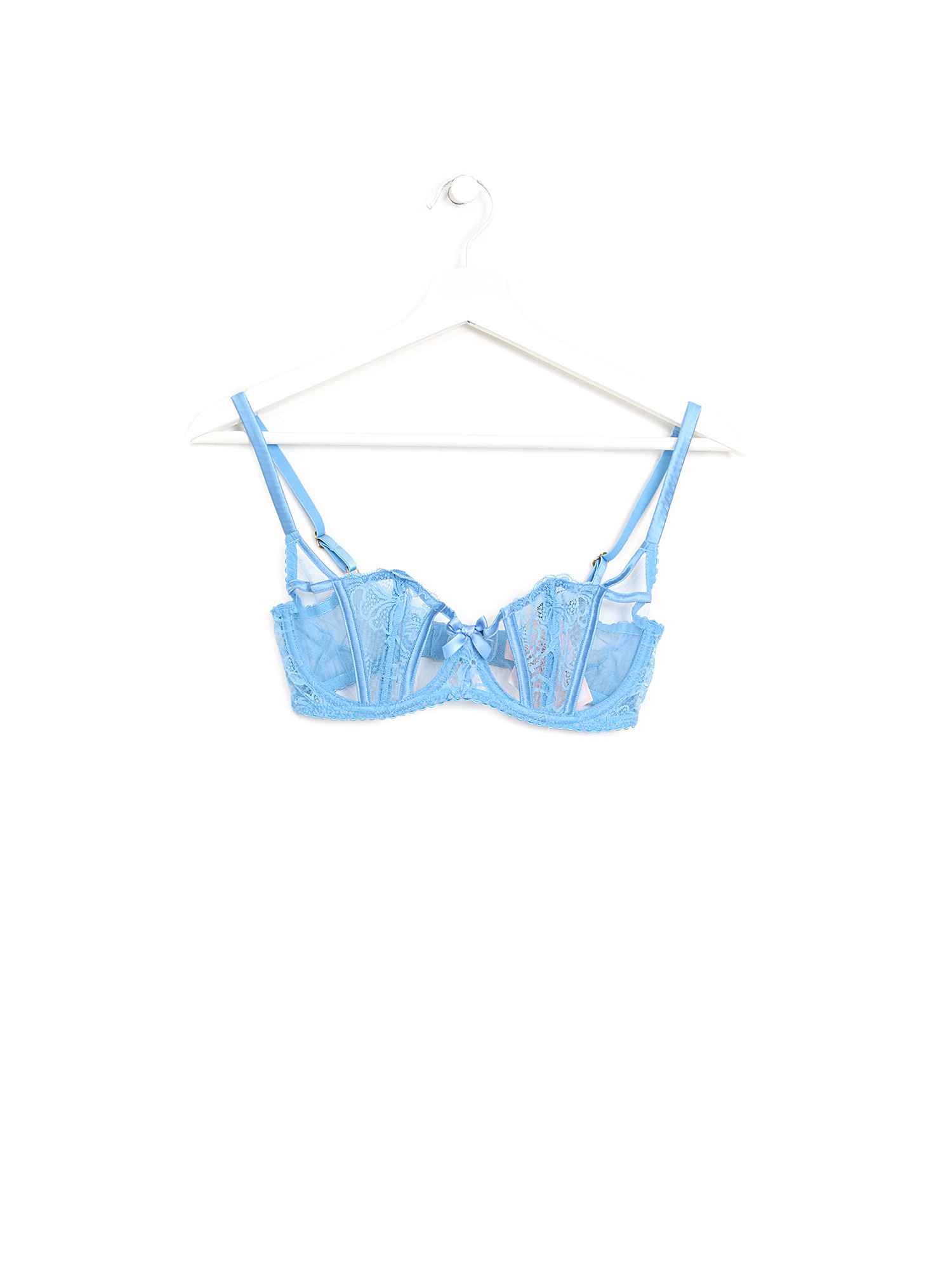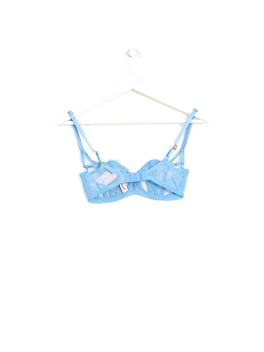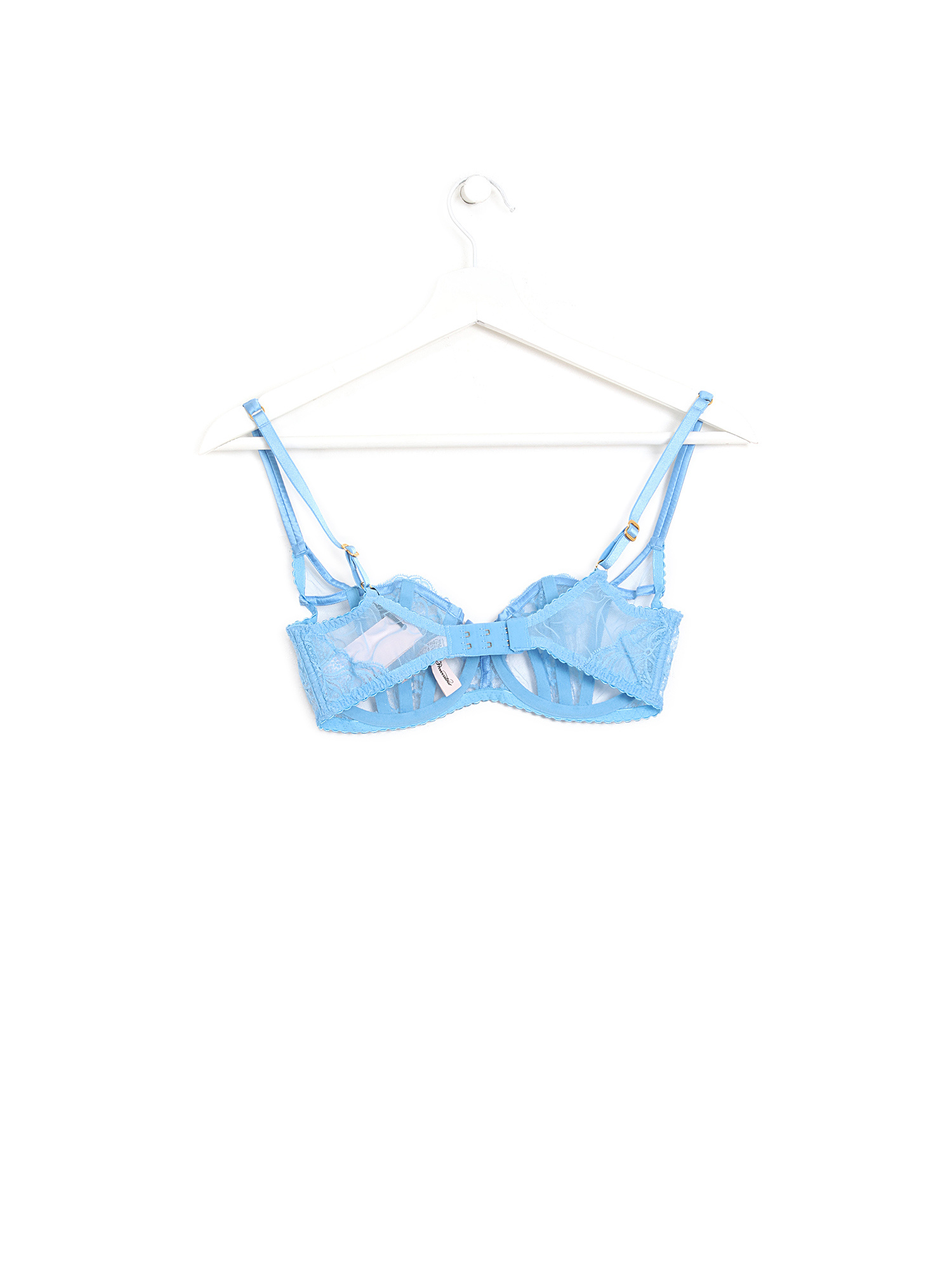 Underwire mesh and lace balconette bra in blue. Features hook and eye closure at back and adjustable straps for a customized fit.