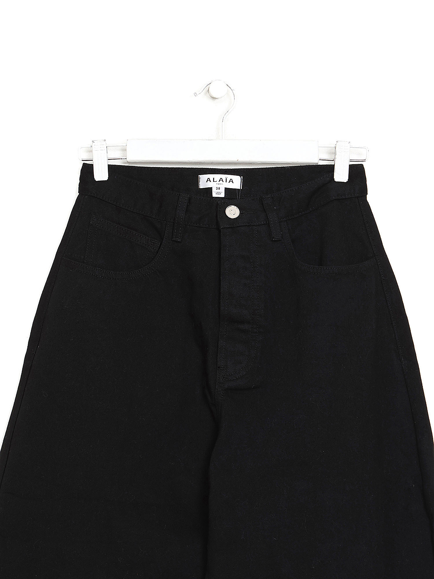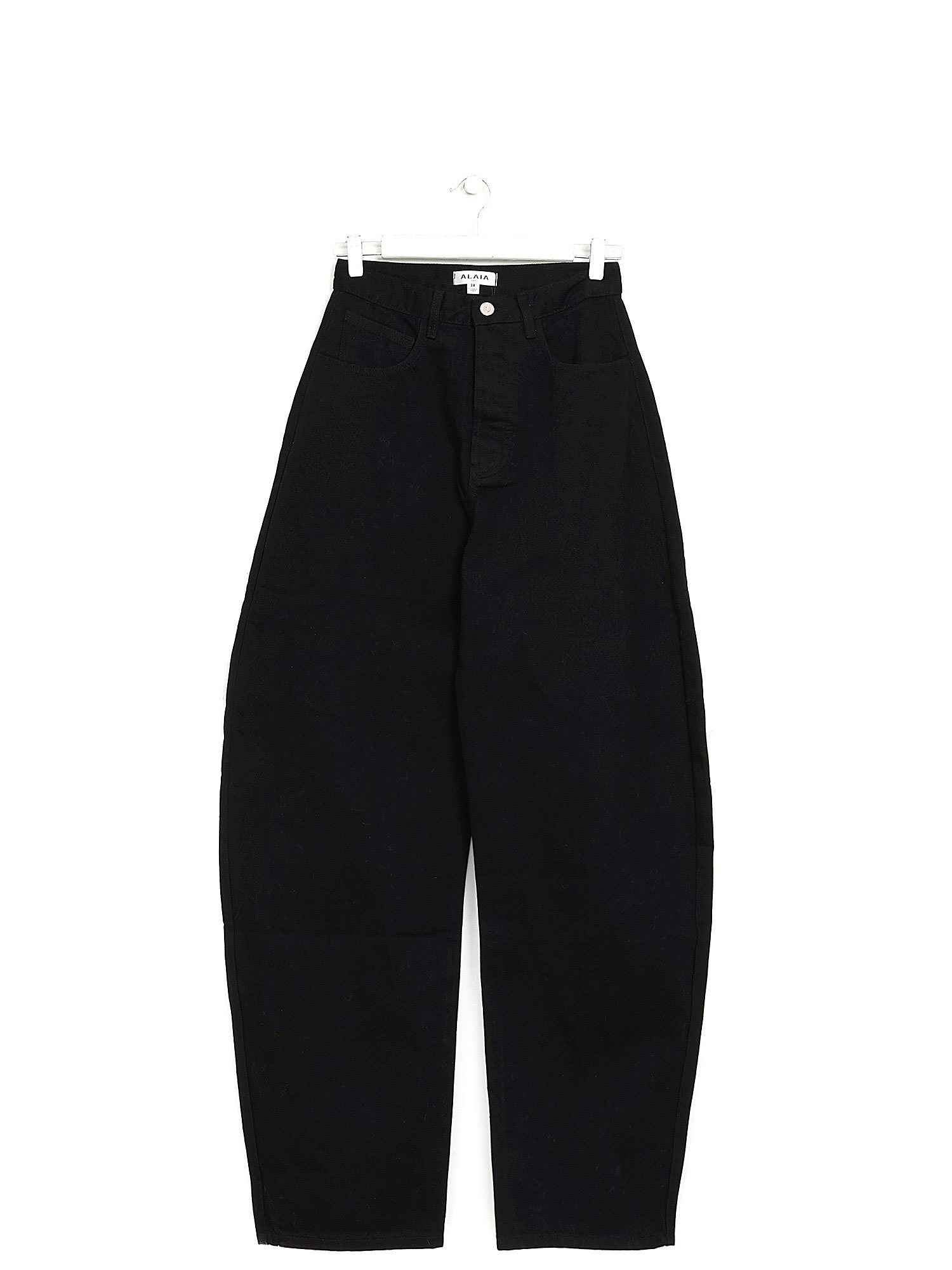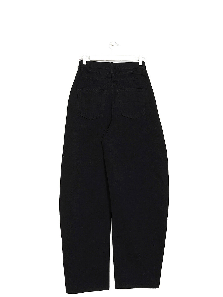 High-waisted barrel leg jeans in black denim. Button closure at the front. Featuring back patch pockets and contrast white stitching.