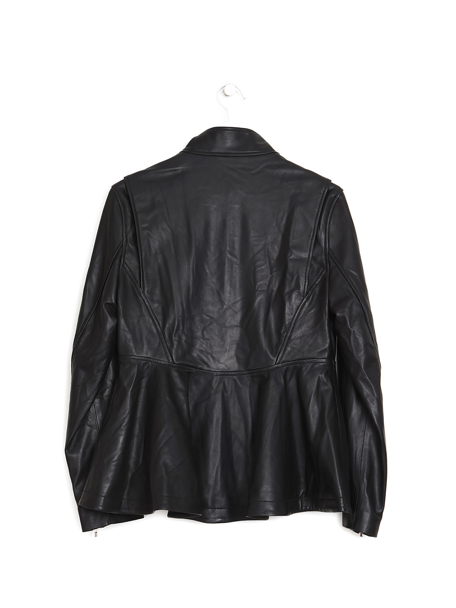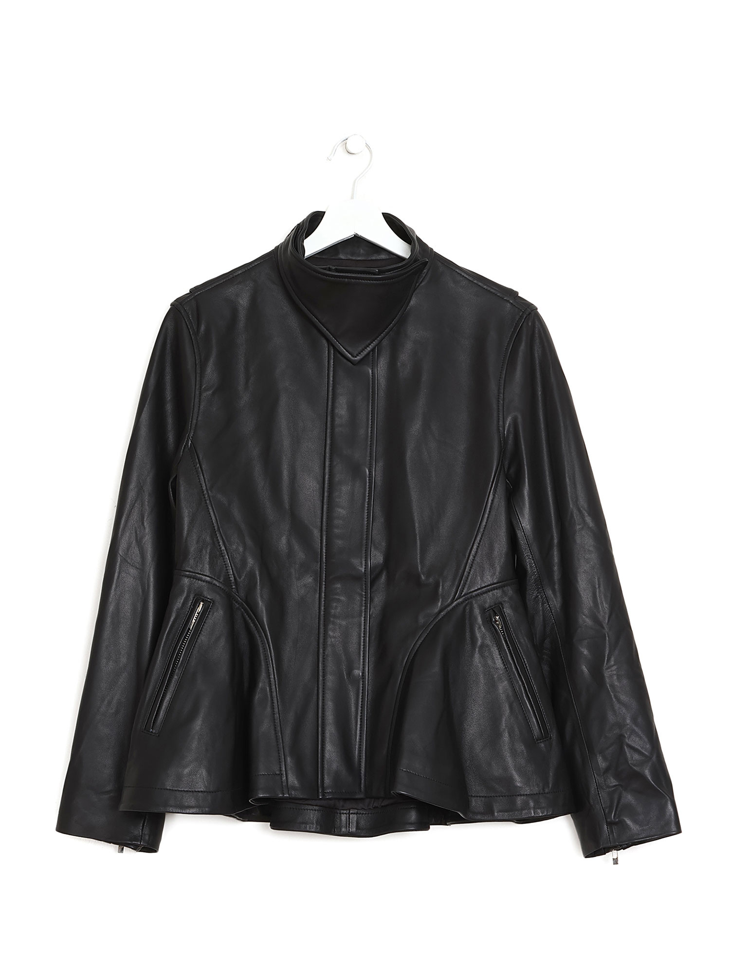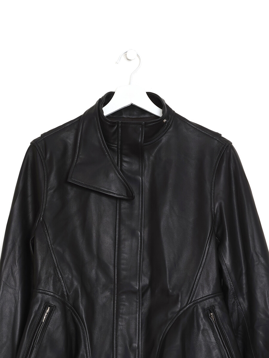 Long sleeve black sheepskin leather jacket with zipper closure and stand collar. Two pockets.