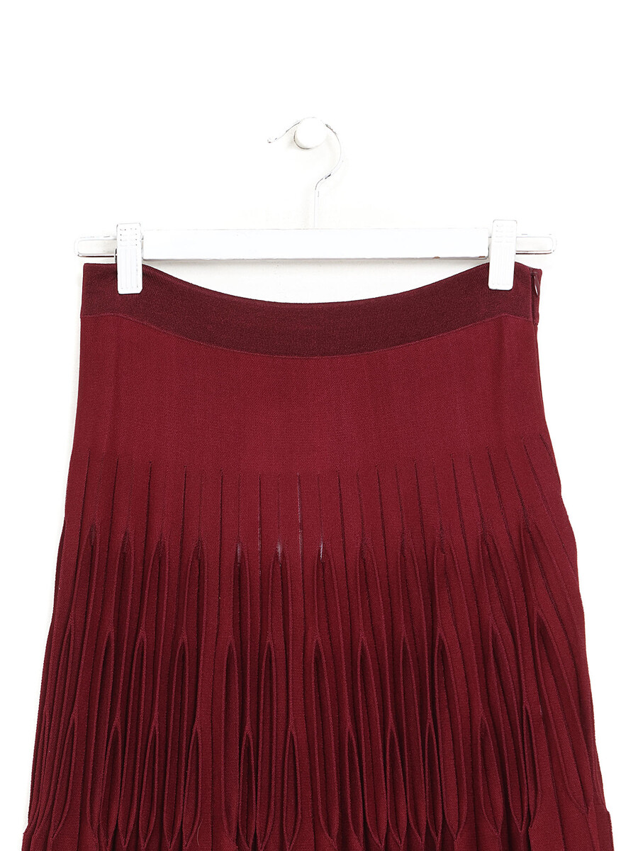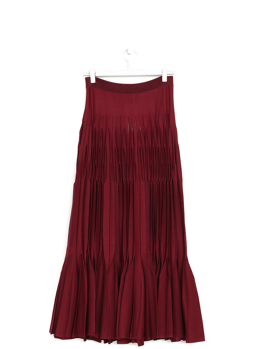 Pleated ankle-length skirt in rich burgundy.
