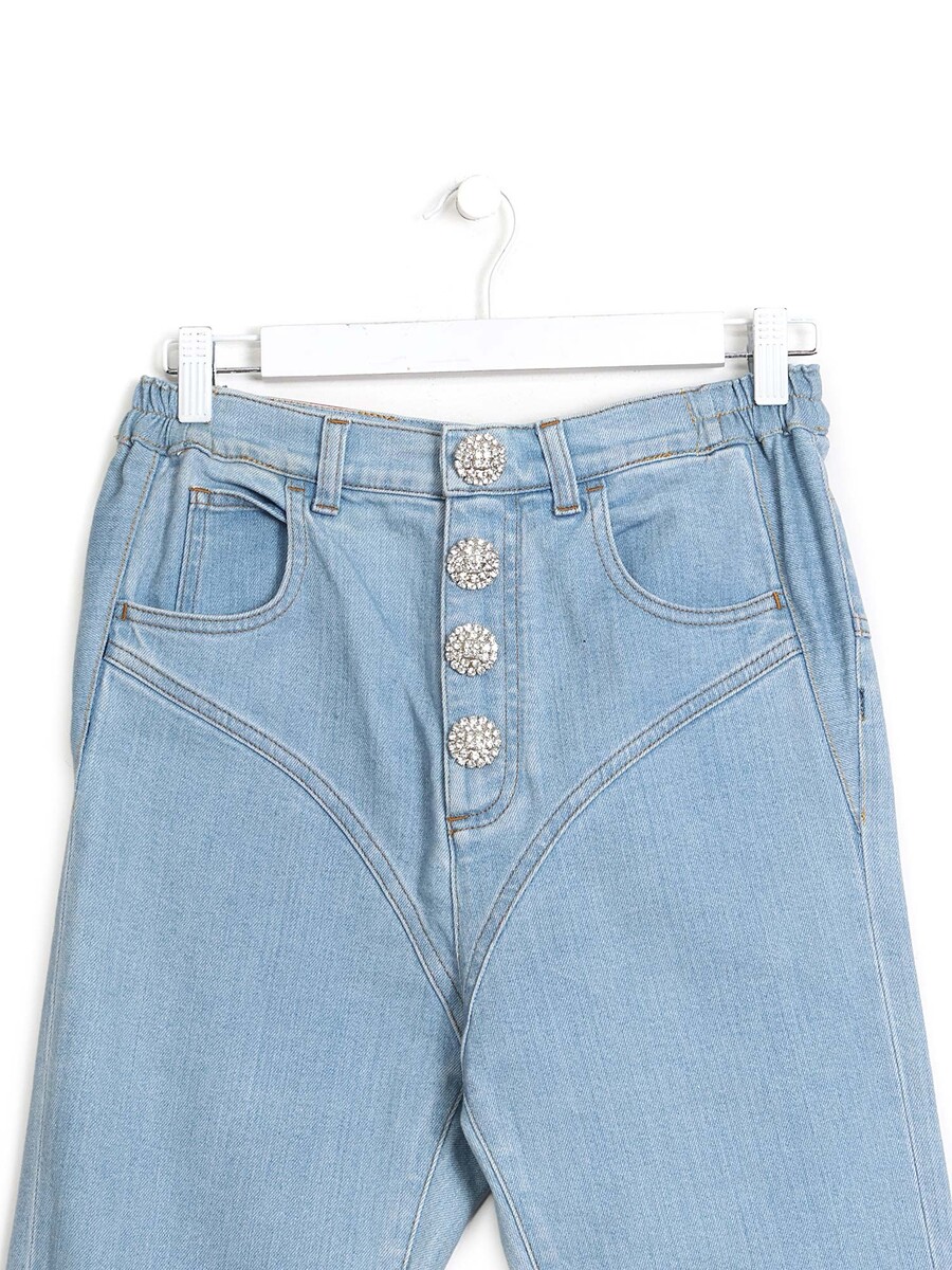 Ankle-length skinny jeans in light blue wash with rhinestone decorative front buttons and stirrup detail. High-waisted fit.