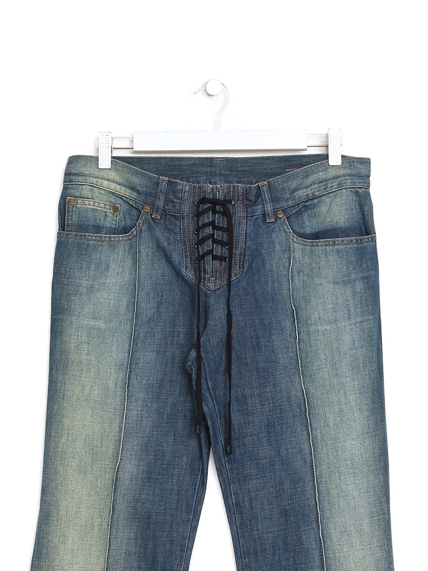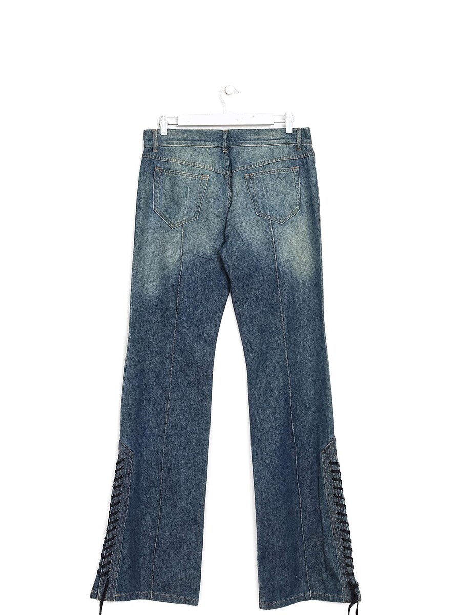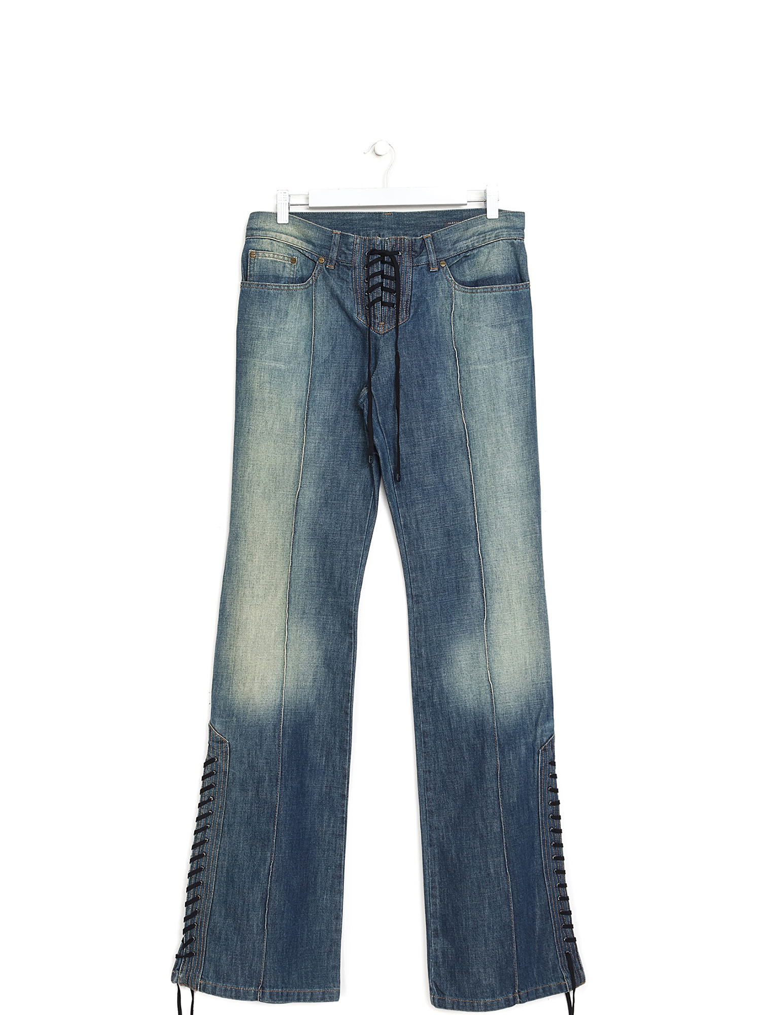 Straight-leg jeans in faded blue denim featuring lace-up details. Zip closure. Side pockets.