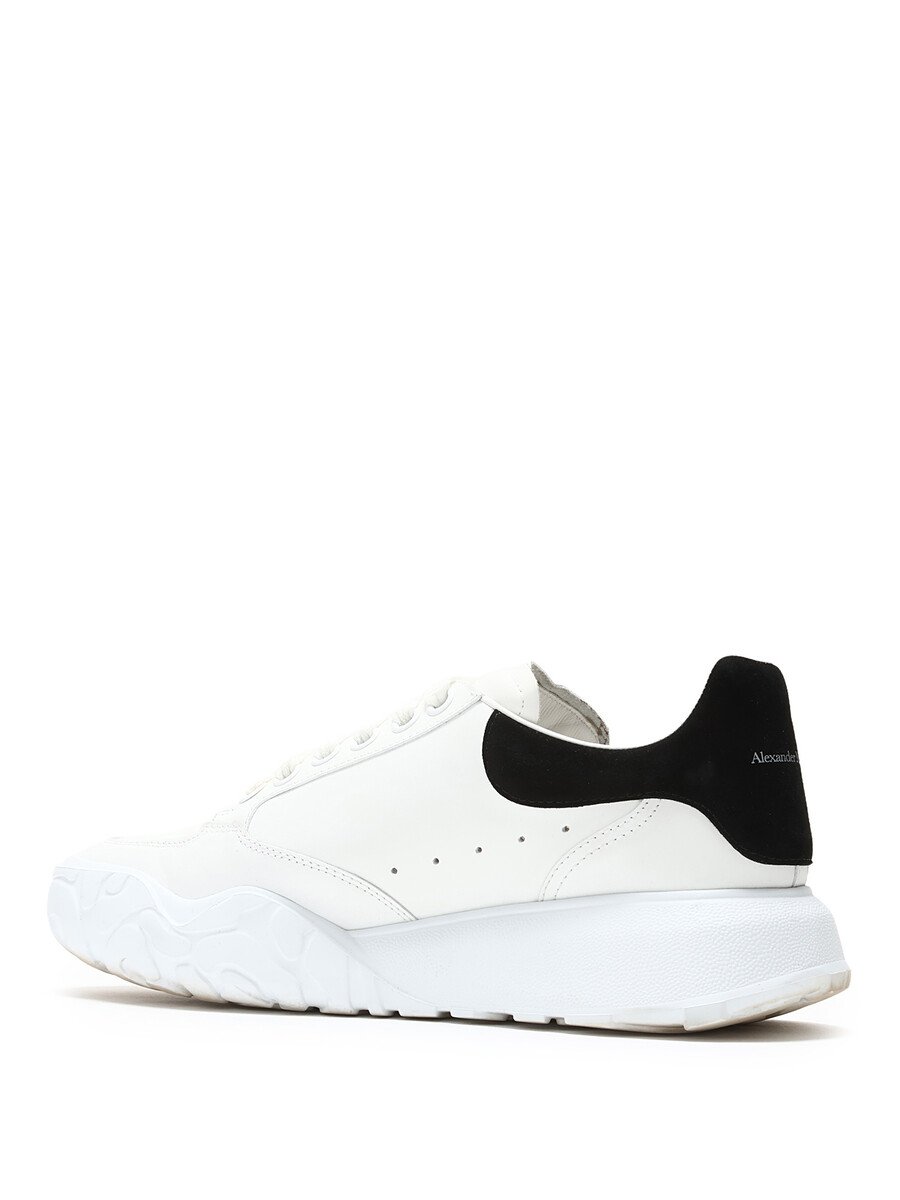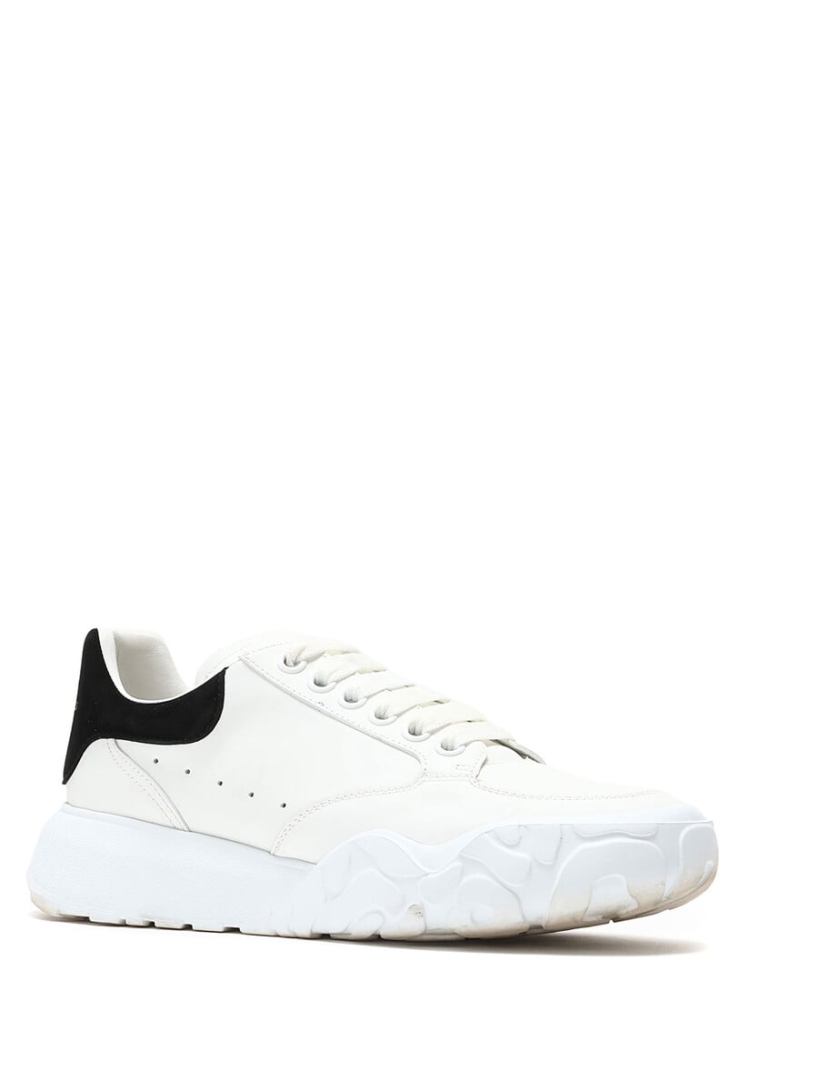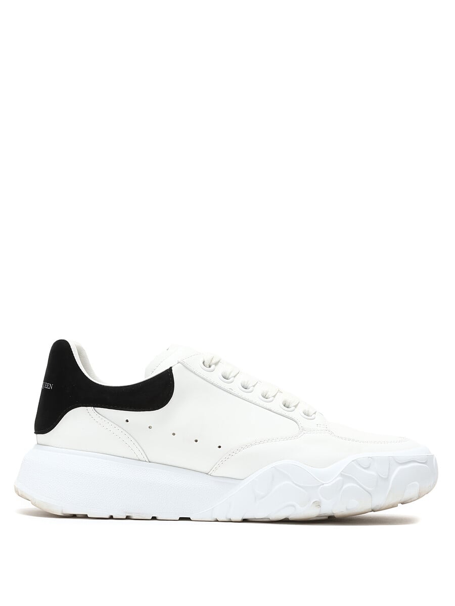 Low-top espadrilles crafted from white and black leather and suede. Features round closed toe and lace-up closure. Serrated rubber sole.